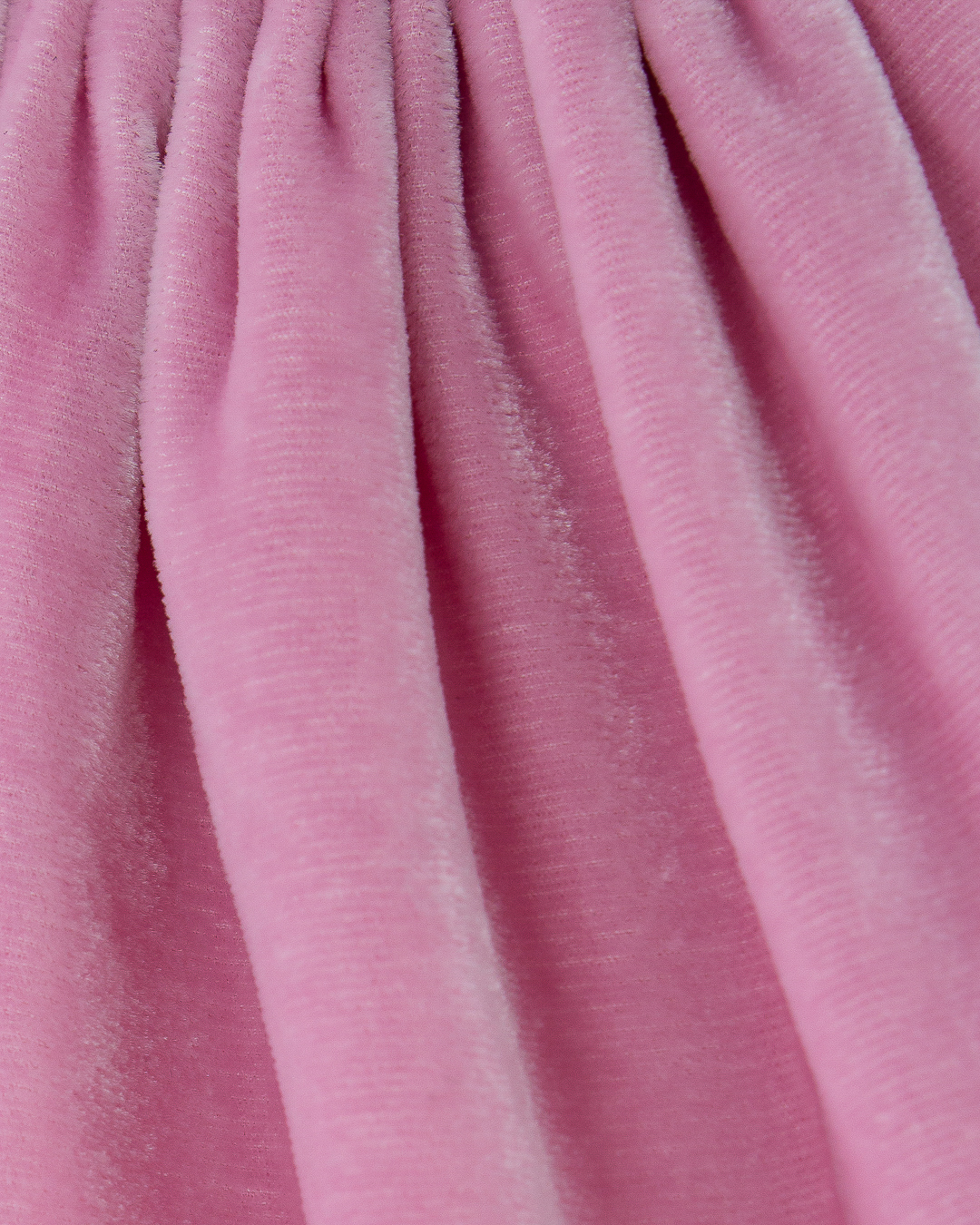 Бархатное платье с добавлением шелка в розовом оттенке. Облегающее изделие со сборкой материала и открытой спиной.