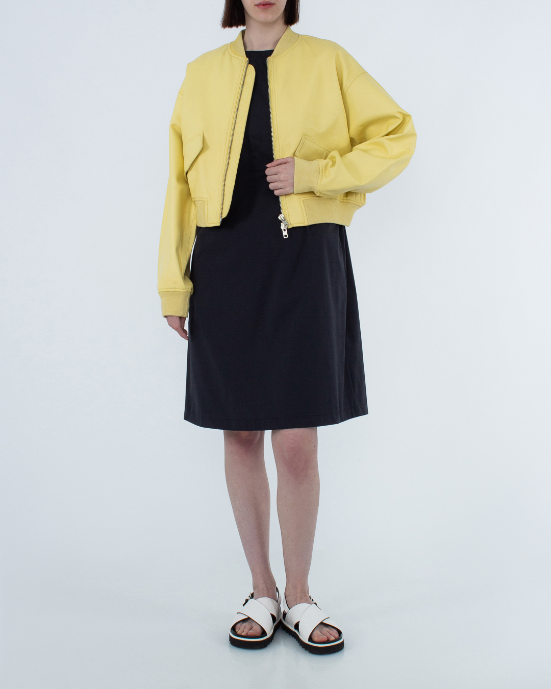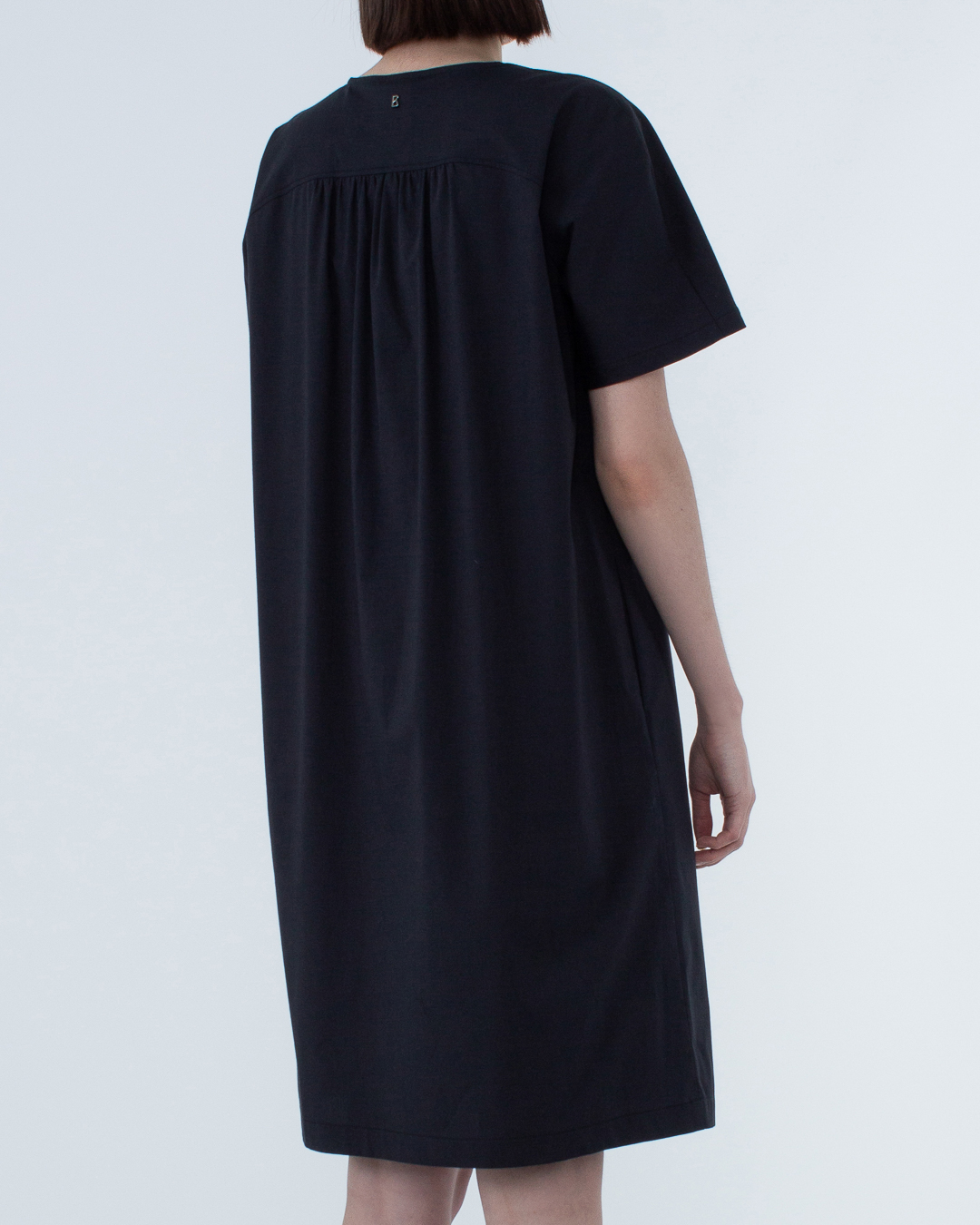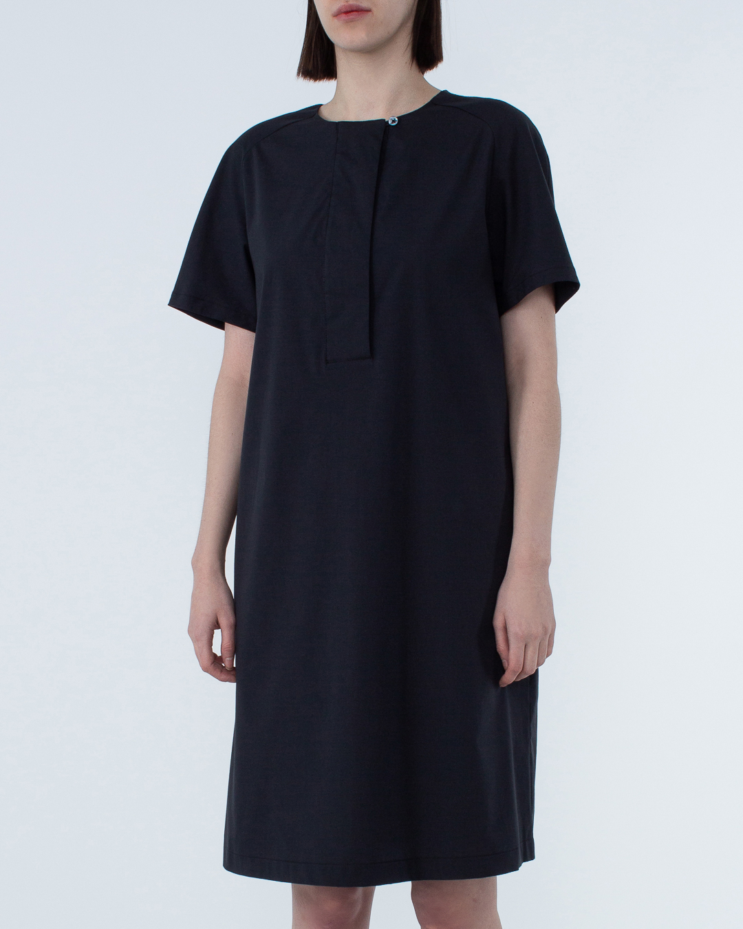 Платье Bogner из новой коллекции сшили из хлопка черного цвета. Базовая модель прямого силуэта длиной до колена дополнили планкой с лицевой стороны и сборкой материала по спине.