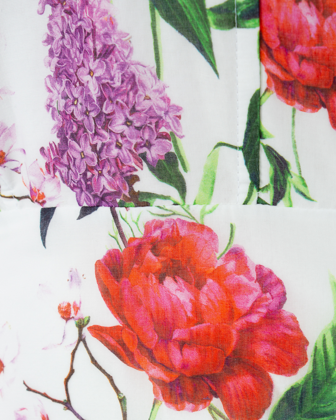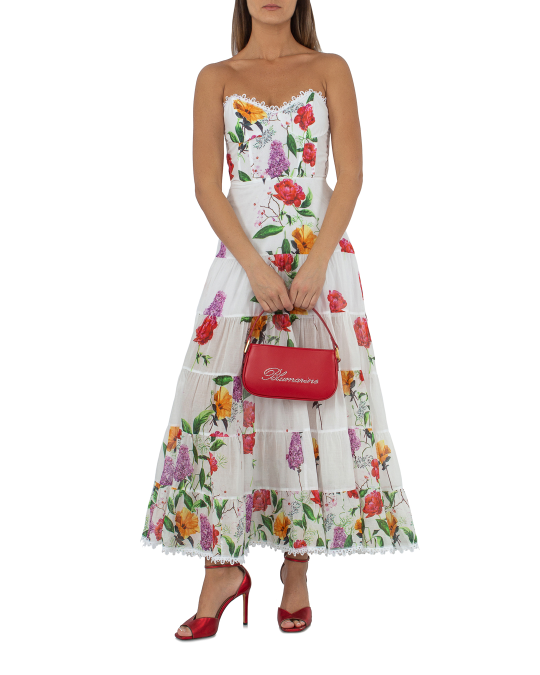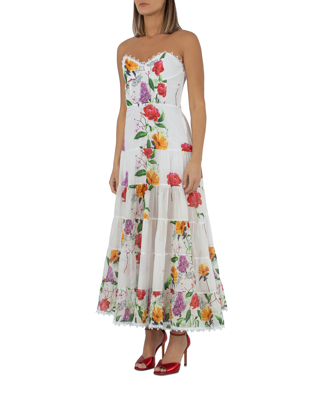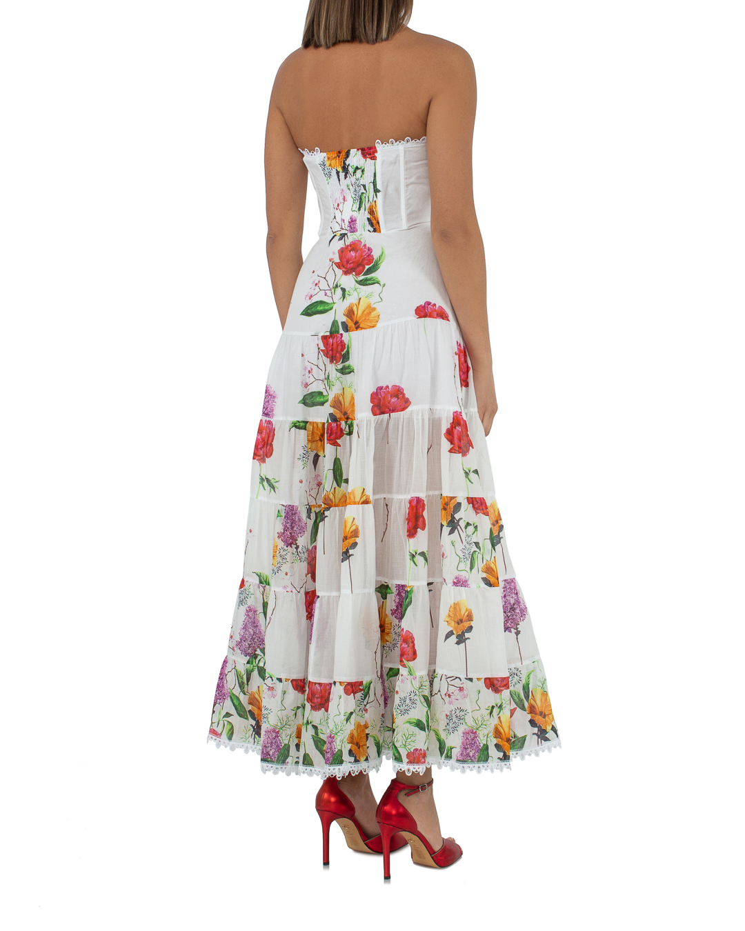 Платье выполнено из хлопка и украшенное красивыми живописными цветами. Изделие длины макси с корсетным верхом и пышной юбкой.