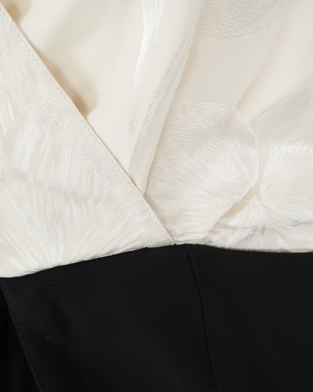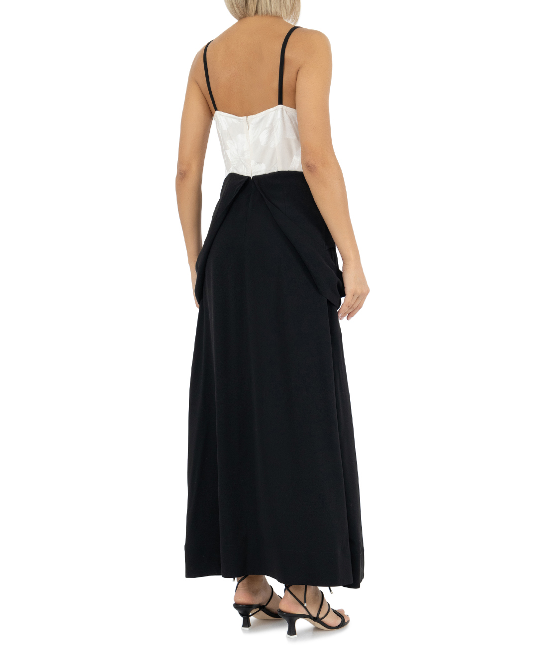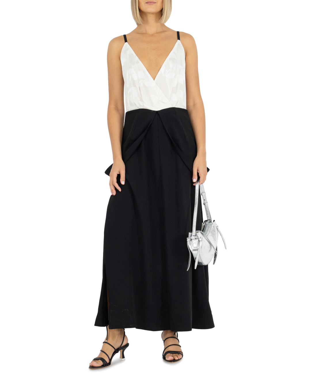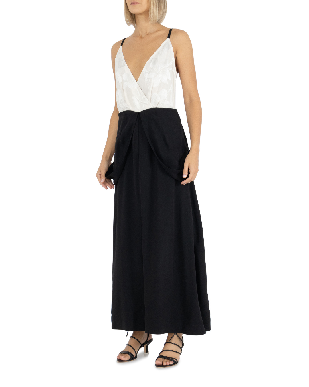 Черное платье с глубоким V-образным декольте — вещь 2-в-1. Лиф модели из мягкого струящегося текстиля сделали двухслойным, продублировав изнутри белой вставкой из цветочного жаккарда. Попробуйте спустить широкие бретели верхней части на бедра, превратив изделие в двухцветное платье-комбинацию со скульптурной баской.