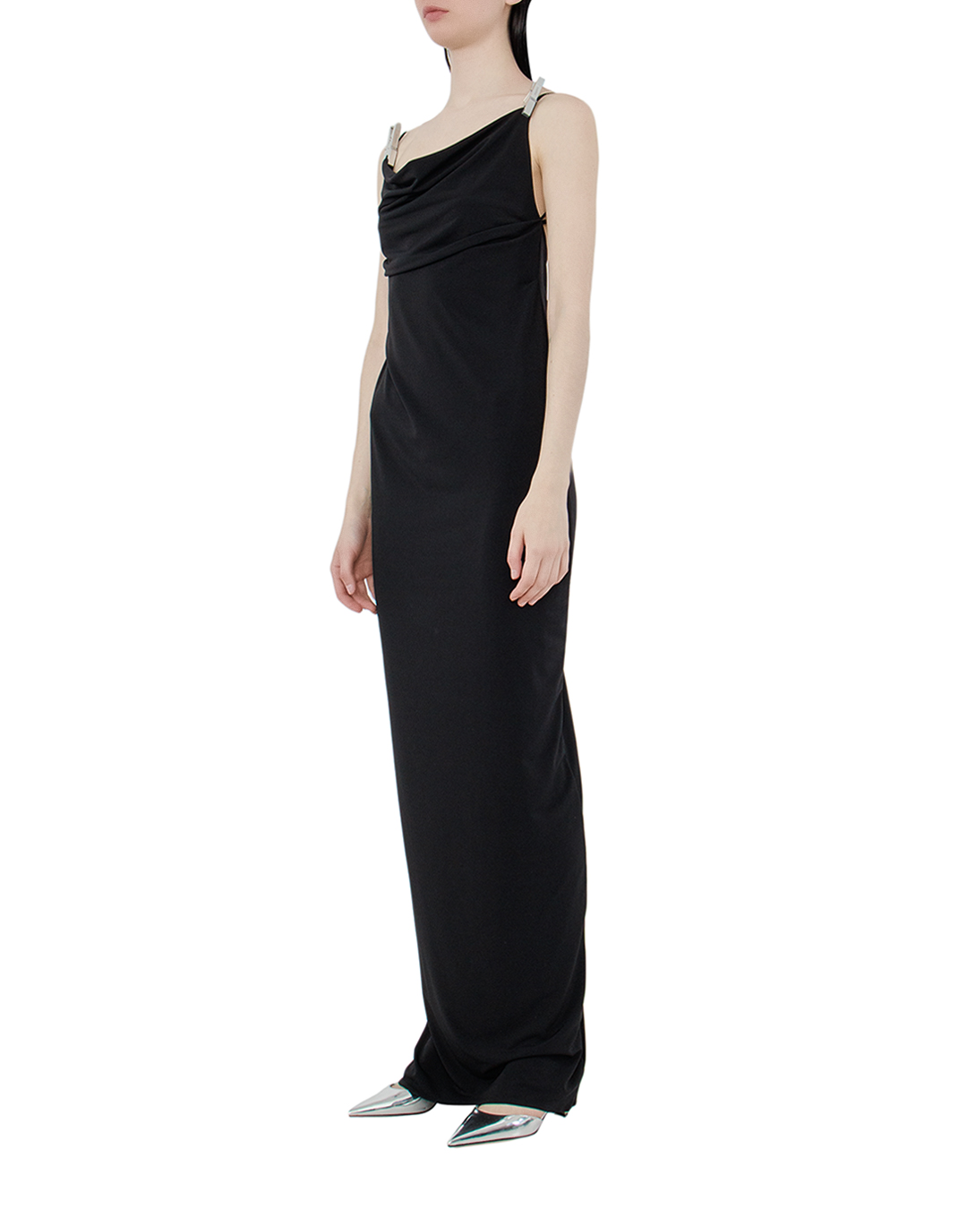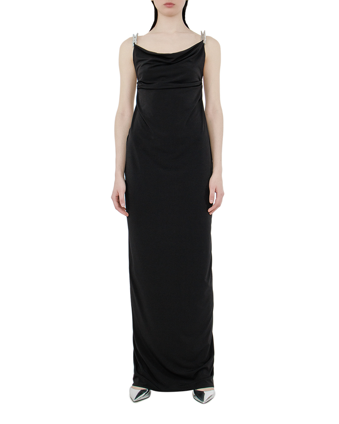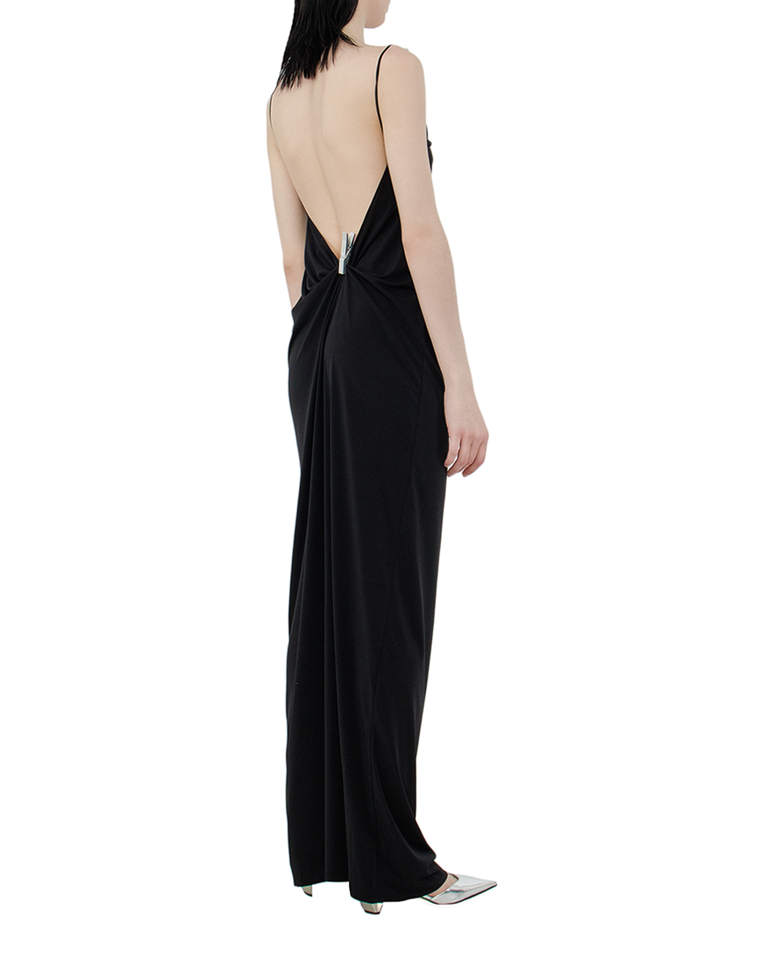 Это великолепное черное макси платье в пол — идеальный выбор для тех, кто хочет создать эффектный и запоминающийся образ. Его элегантный силуэт подчеркивает женственность, а открытая спина добавляет нотку соблазнительности, делая наряд особенно привлекательным. Детали платья впечатляют: изящные бретели поддерживают глубокий U-образный вырез, который акцентирует внимание на декольте и плечах. Бретели украшены съемными серебристыми брошами в форме прищепок, что придает платью уникальность и стильный вид. Эти аксессуары позволяют вам легко менять образ — просто снимите брошки для более классического варианта или оставьте их для создания яркого акцента. Драпировки по всей длине платья создают плавные линии и добавляют динамичности, подчеркивая каждое ваше движение. Макси длина делает его идеальным для вечерних мероприятий, коктейльных вечеринок или торжественных случаев. Сочетайте это платье с изящными босоножками на каблуке и минималистичными украшениями для завершения образа. Оно станет настоящим мастхэвом вашего гардероба, позволяя вам выглядеть стильно и уверенно в любой ситуации!