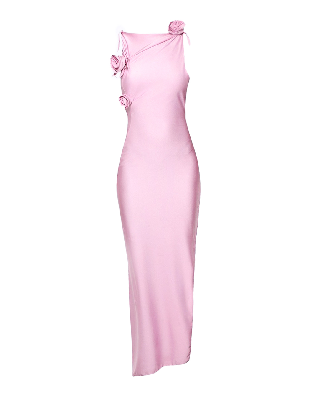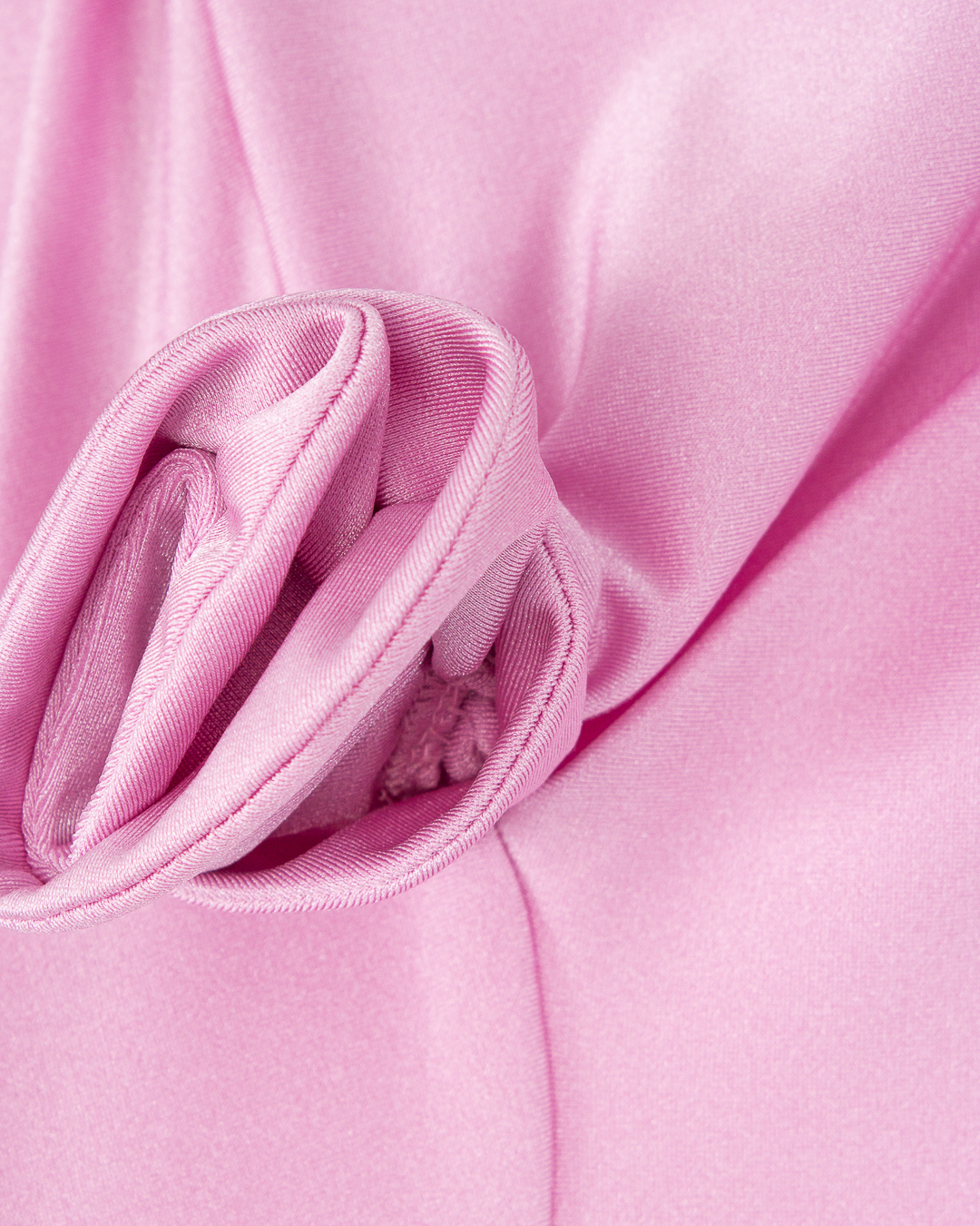 Платье COPERNI из атласного материала розового оттенка. Модель сшита по фигуре и отлично ее подчеркивает. Платье дополнено разрезами и розочками из основного материала.