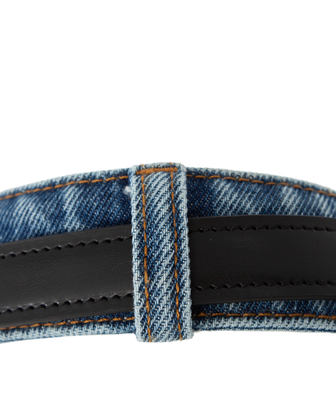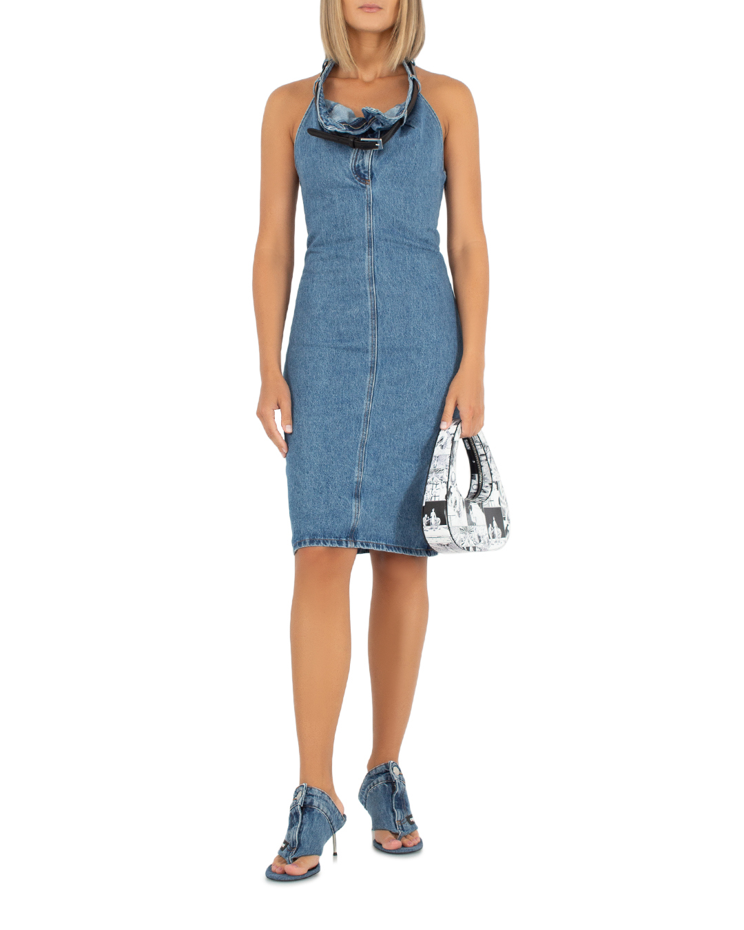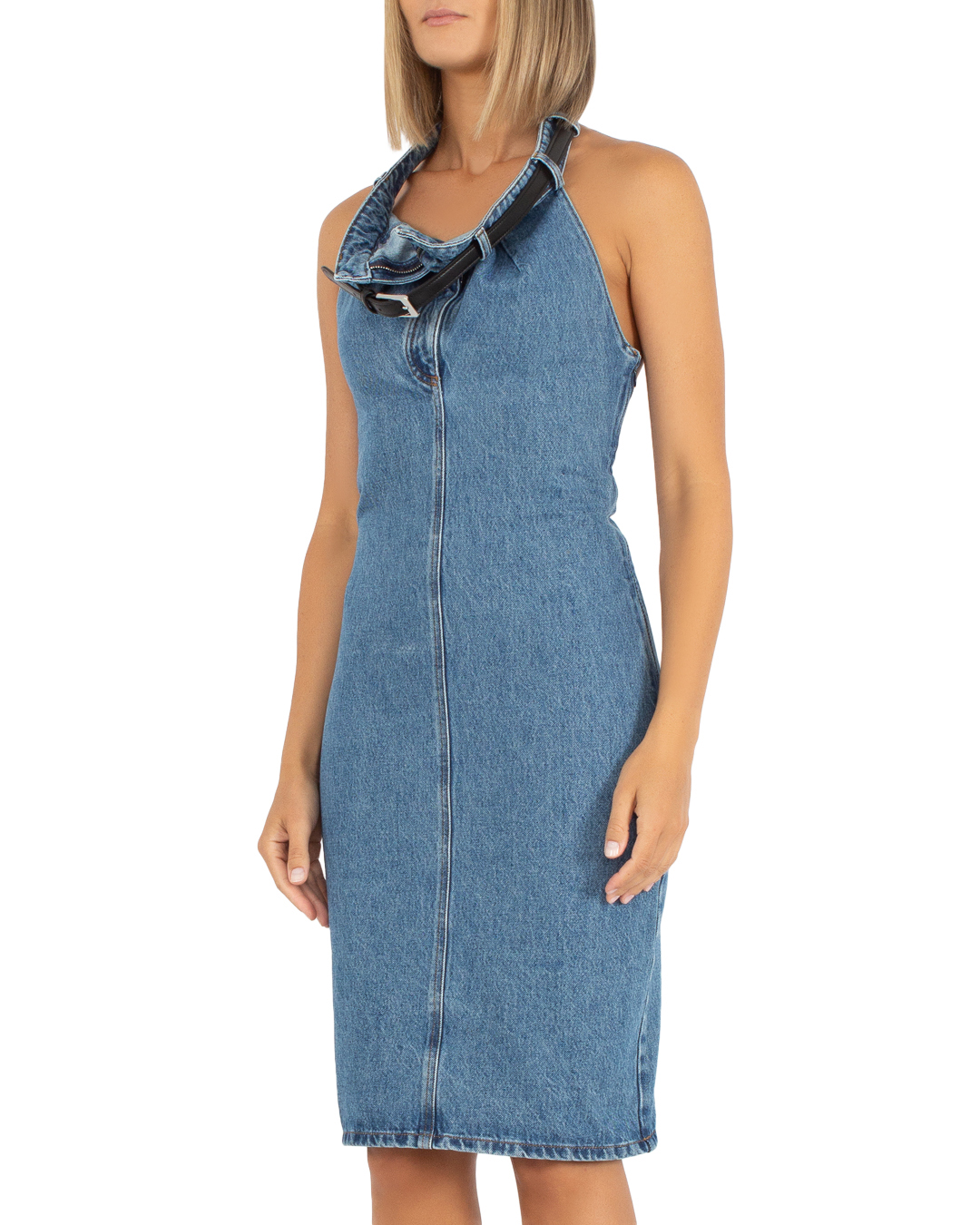 Платье COPERNI из хлопкового денима синего оттенка. Нестандартный крой в виде джинсовой юбки дополнен кожаным ремнем.