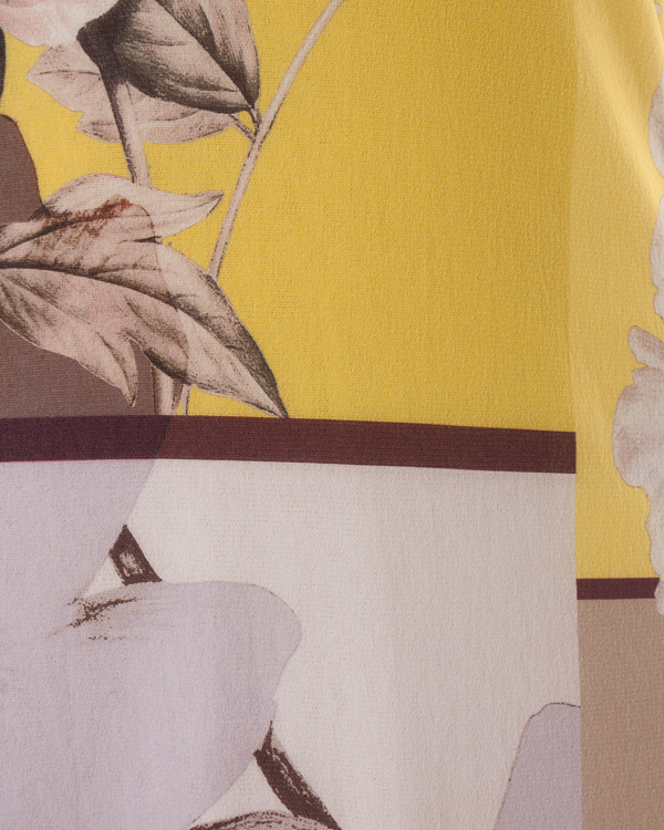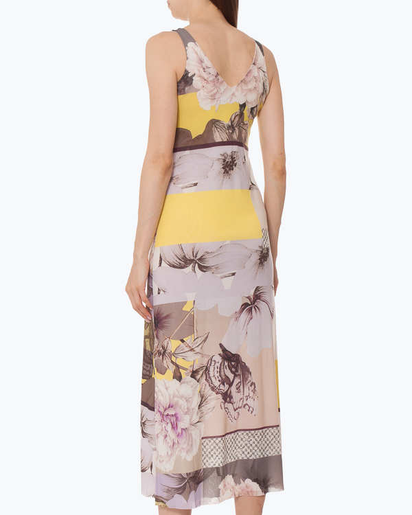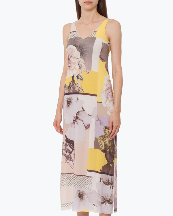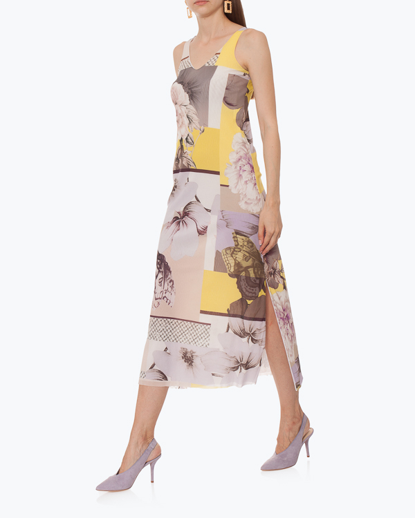 Платье-миди из принтованного крепа. Модель полуприлегающего силуэта с разрезами по бокам.