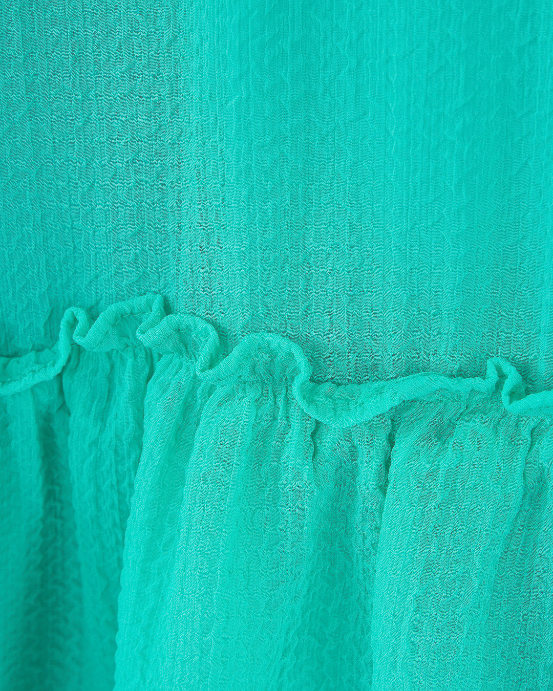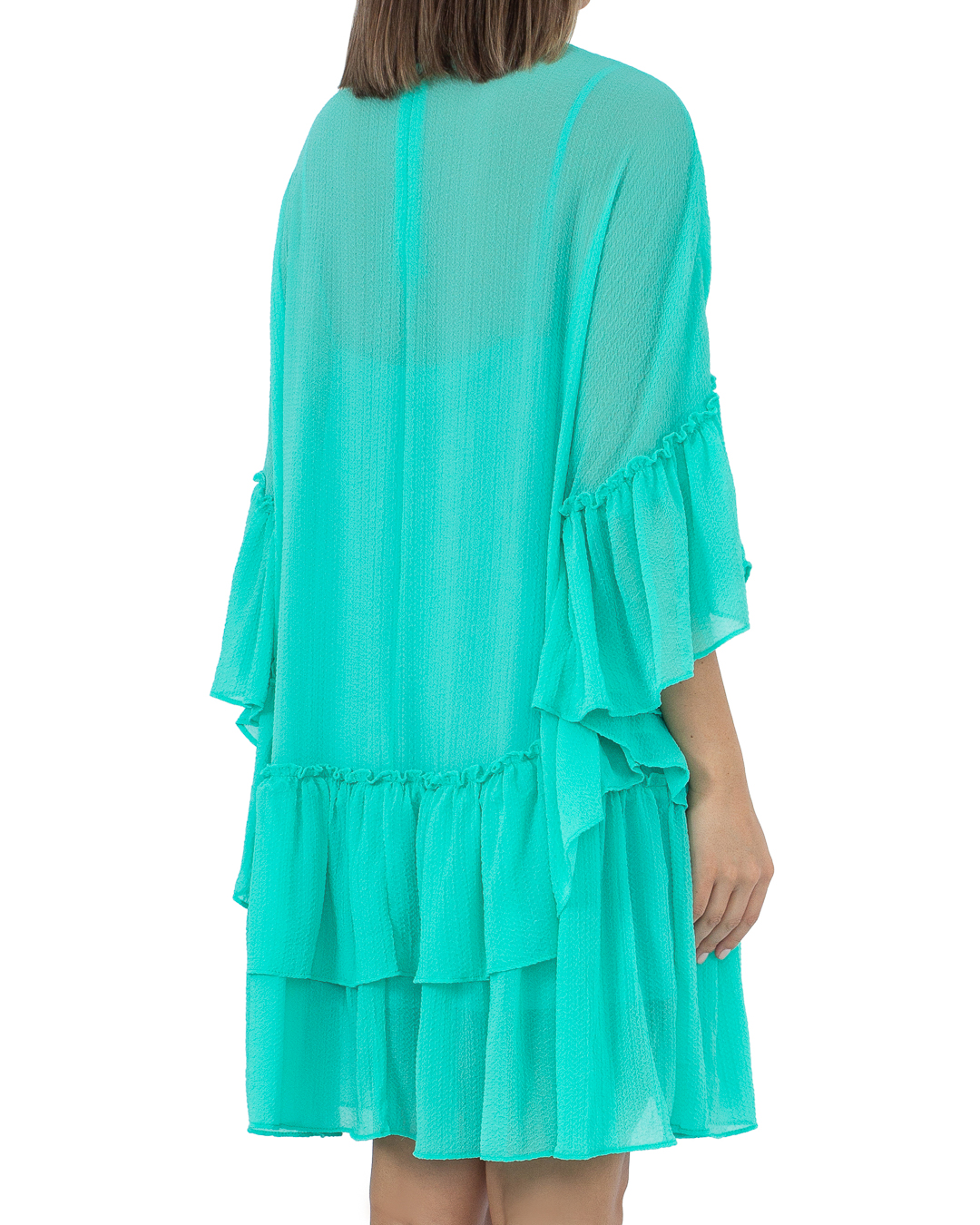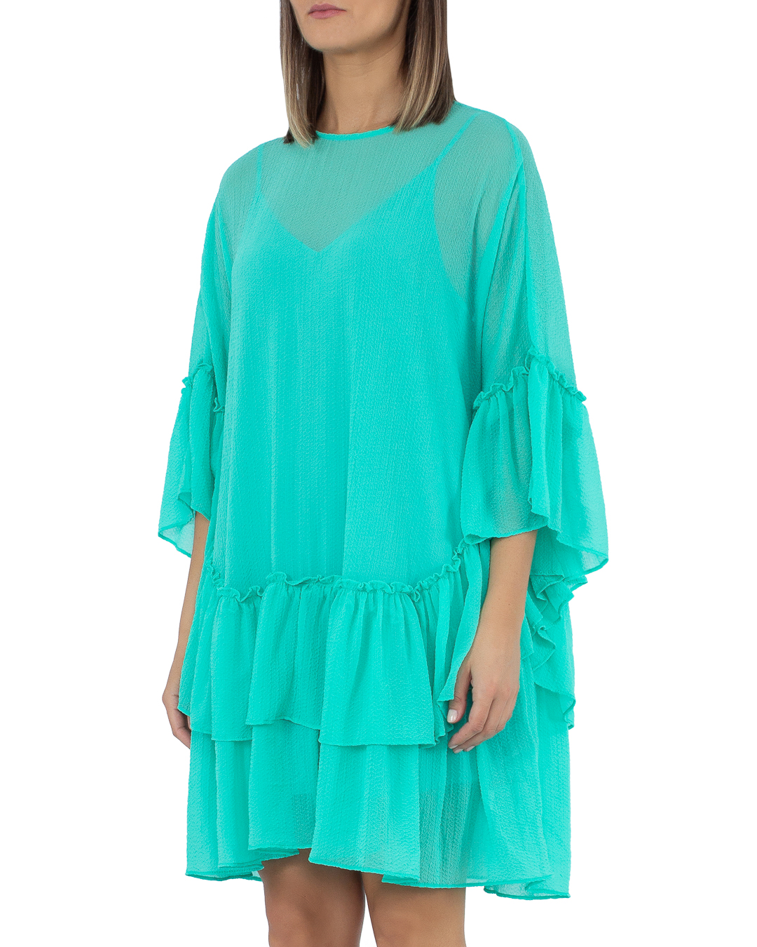Платье длины мини из тонкого полупрозрачного материала с нижней комбинацией. Изделие свободного силуэта с отделкой оборками.