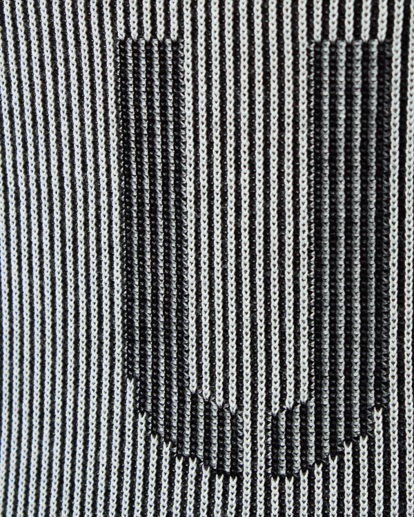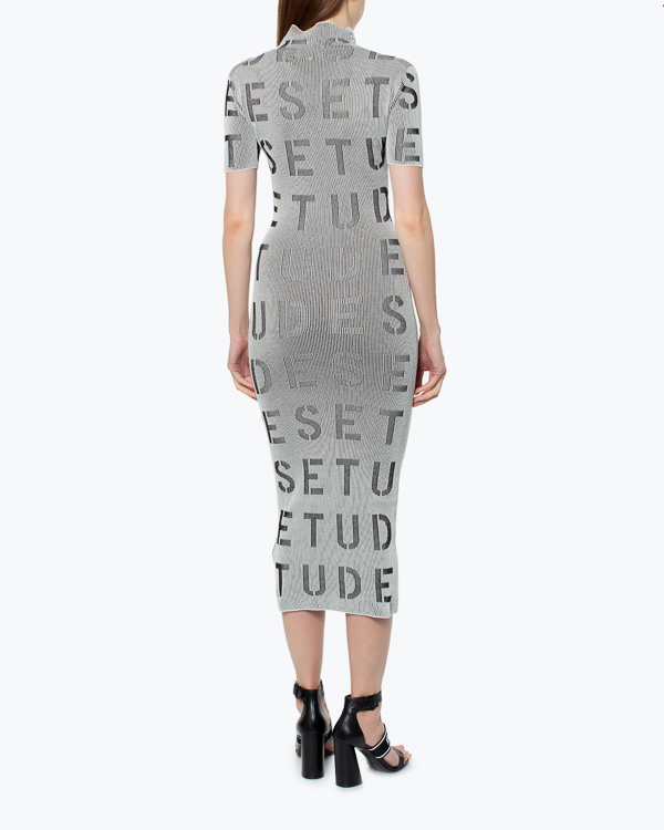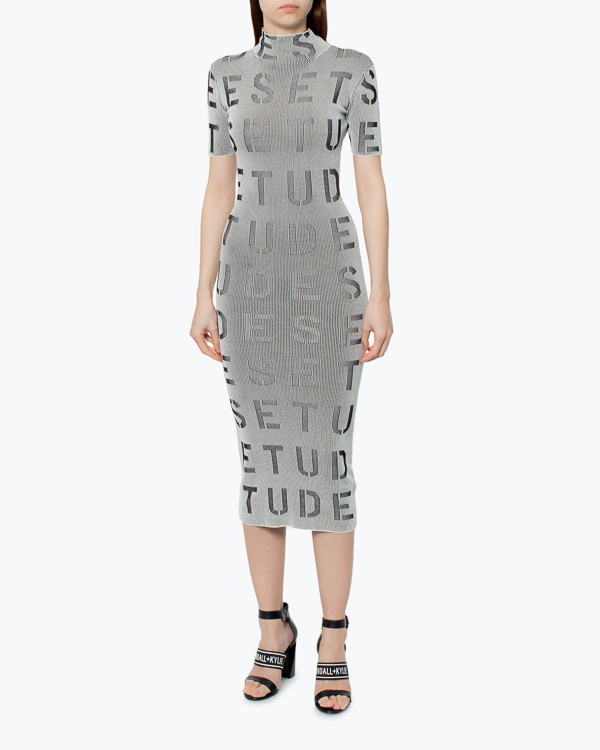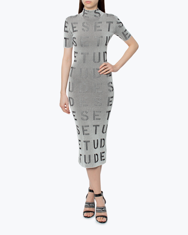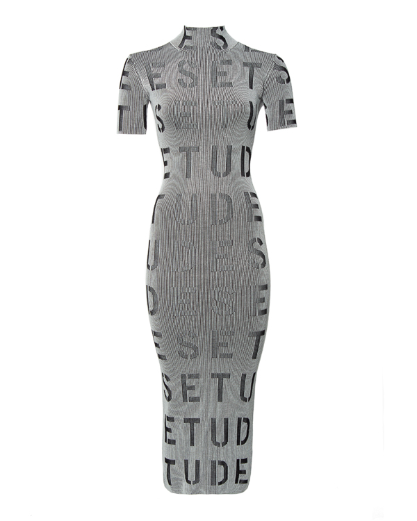 Платье-миди из эластичного хлопка серого оттенка с принтом в рубчик. Облегающее изделие с невысоким воротником-стойкой.