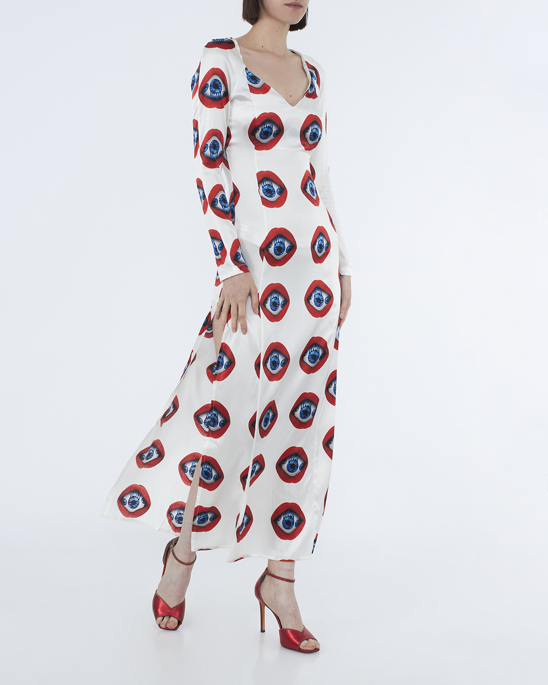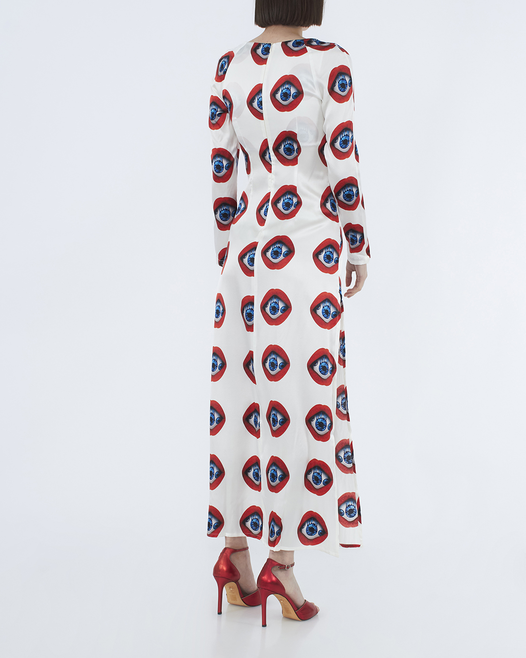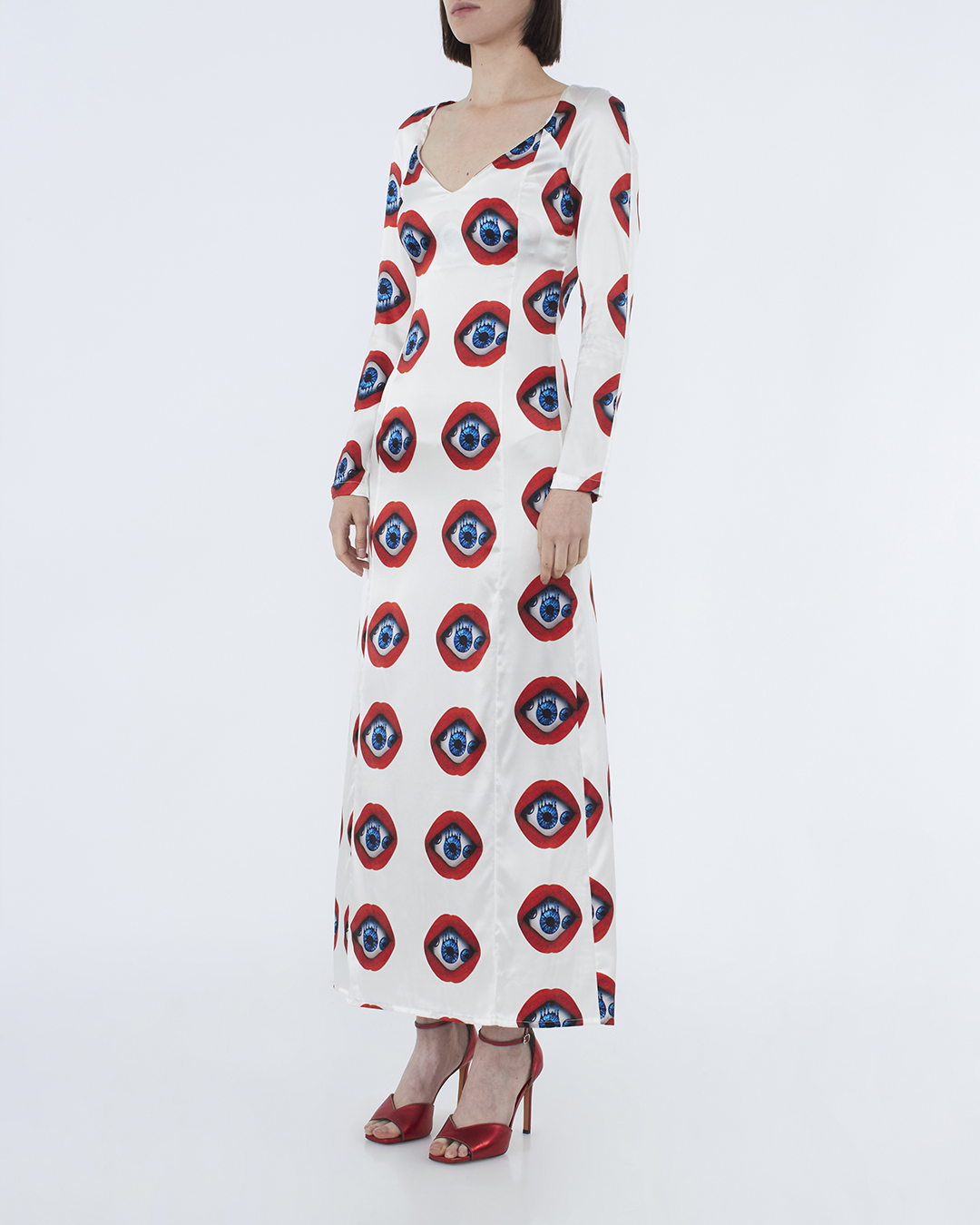 Платье макси из атласного шелка с принтом. Модель отлично подчеркивает фигуру и дополнено длинными рукавами.