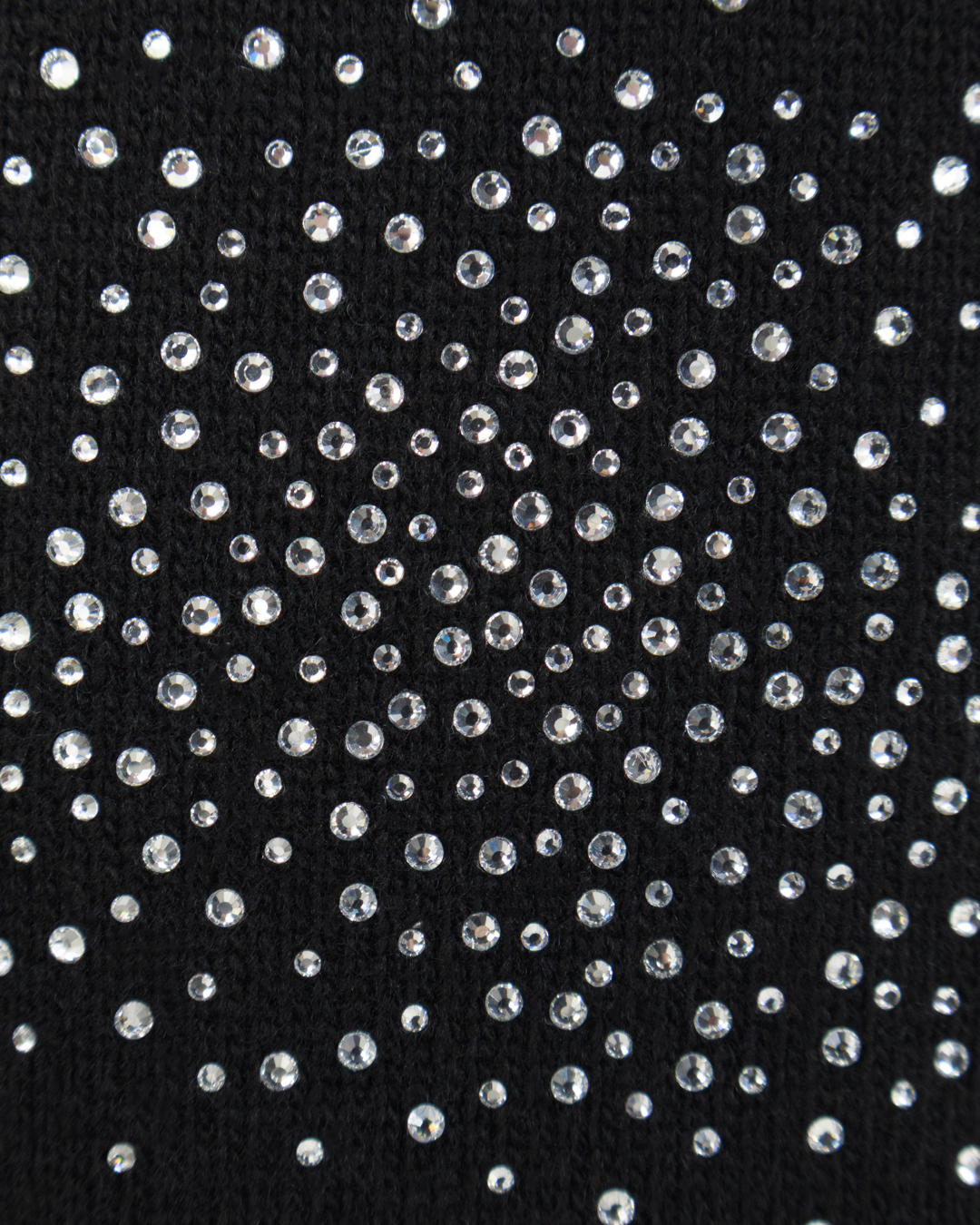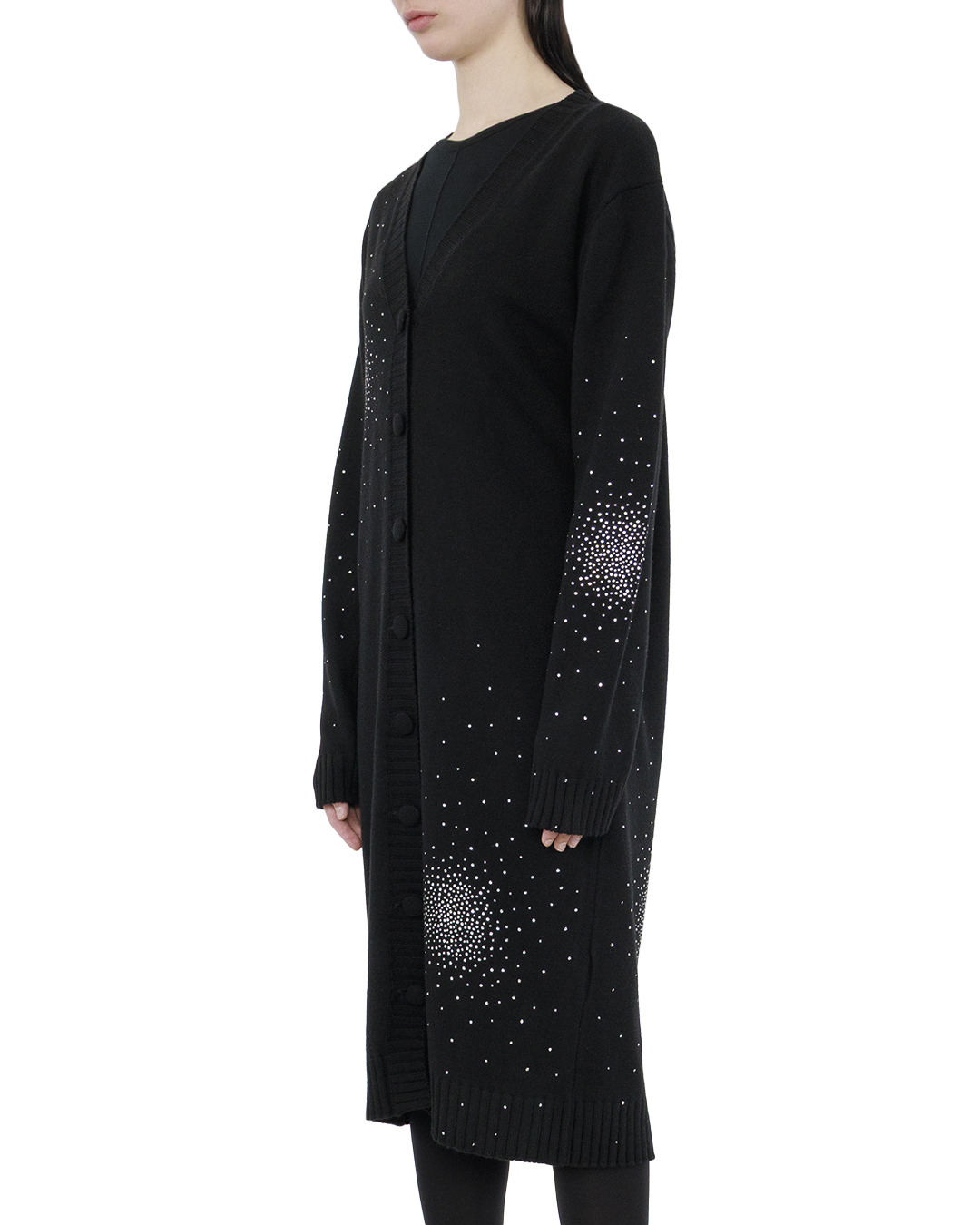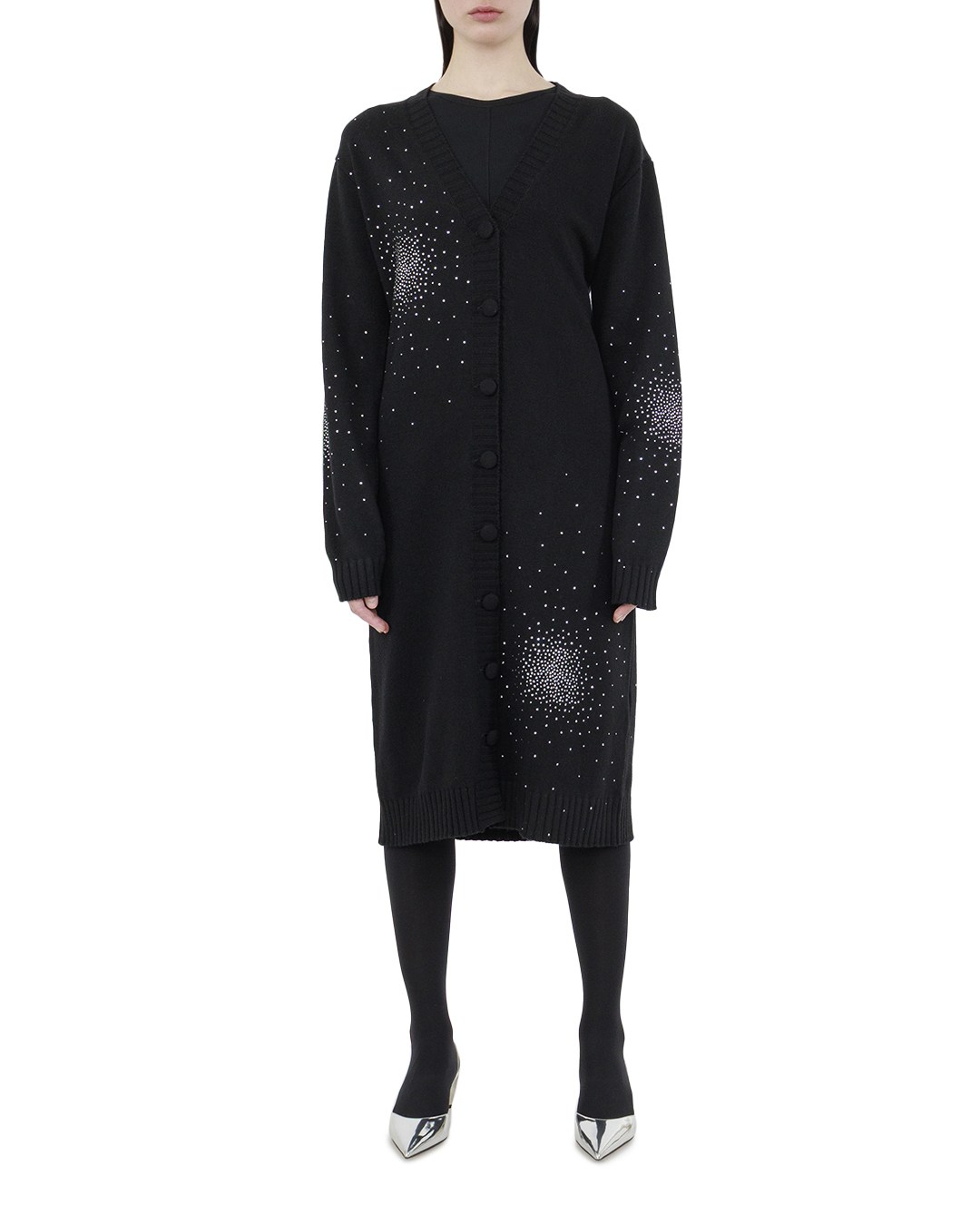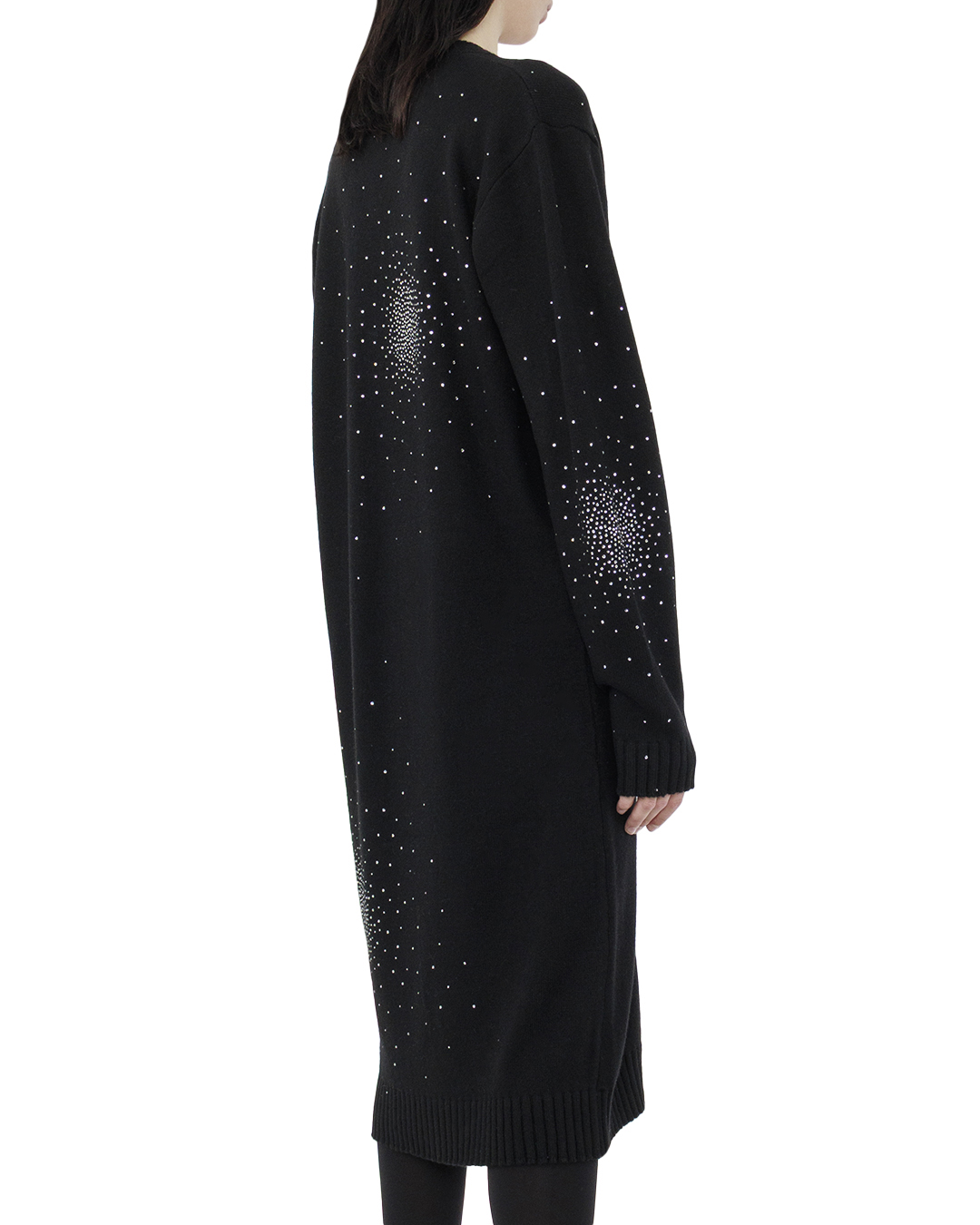 Это платье-кардиган — воплощение утонченности и универсальности, идеально подходящее для создания стильного образа в холодные месяцы. Изготовленное из мягкой и уютной ткани, оно обеспечивает комфорт и изысканность. Элегантный черный цвет добавляет изделию глубину и стиль, позволяя легко сочетать его с любыми аксессуарами. Классический V-образный вырез подчёркивает линию шеи и придаёт модели нотку женственности. Рукава с манжетами и весь кардиган украшены россыпью страз, создающих эффект звёздного неба. Этот изысканный декор добавляет платья блеска и привносит в образ загадочность и романтику. Застёжка на крупные пуговицы подчеркивает современный стиль и функциональность. Длина миди делает платье универсальным выбором как для дневных, так и для вечерних выходов, сохраняя тепло и элегантность. Это платье — идеальный элемент гардероба для женщин, ценящих комфорт, стиль и внимание к деталям, желающих оставаться модными независимо от погоды.