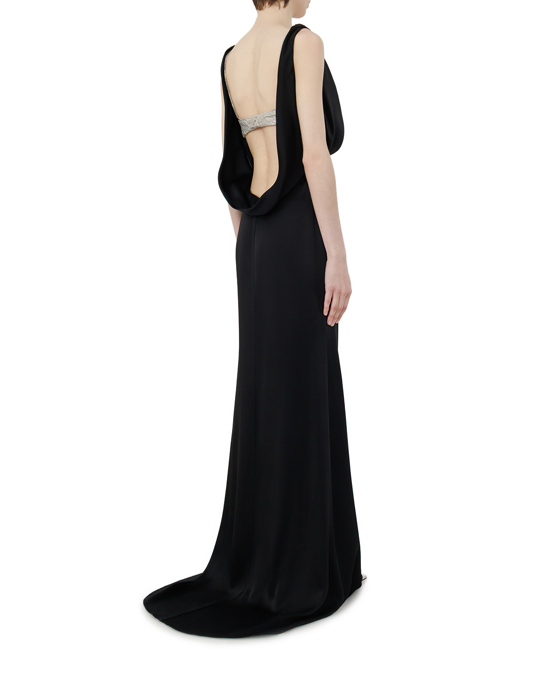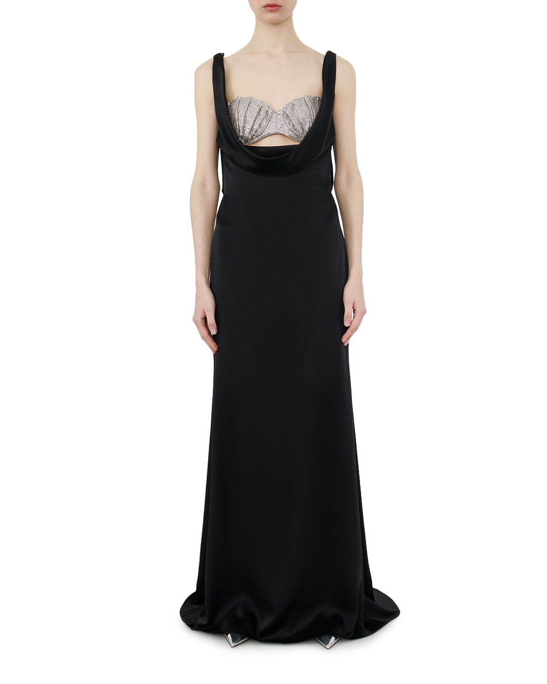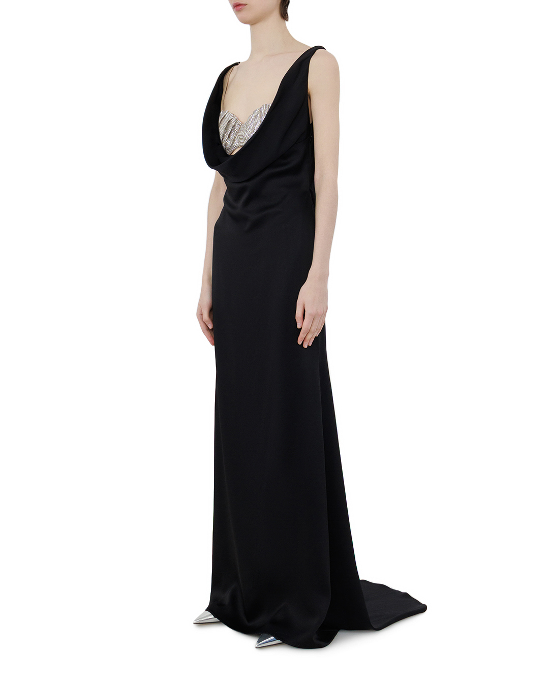 Это элегантное вечернее платье — воплощение роскоши и сдержанной грации. Длинный струящийся силуэт в глубоком чёрном оттенке создаёт образ царственной утончённости, а мягкие складки по подолу добавляют движения и лёгкости. Особую выразительность модели придаёт изысканная отделка в зоне декольте: блестящая вставка с фактурным рельефом контрастирует с матовой основой, создавая завораживающий эффект игры света. Драпированный вырез мягко обрамляет линию шеи, подчёркивая женственность образа. Тонкие бретели не отвлекают от центрального акцента, а плавные линии кроя подчёркивают фигуру, не сковывая движений. Сочетание лаконичности и выразительной деталировки делает это платье идеальным выбором для торжественных событий — оно одновременно сдержанно и роскошно, подчёркивая безупречный вкус своей обладательницы.
