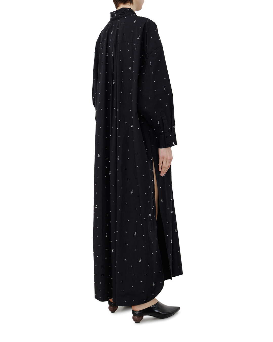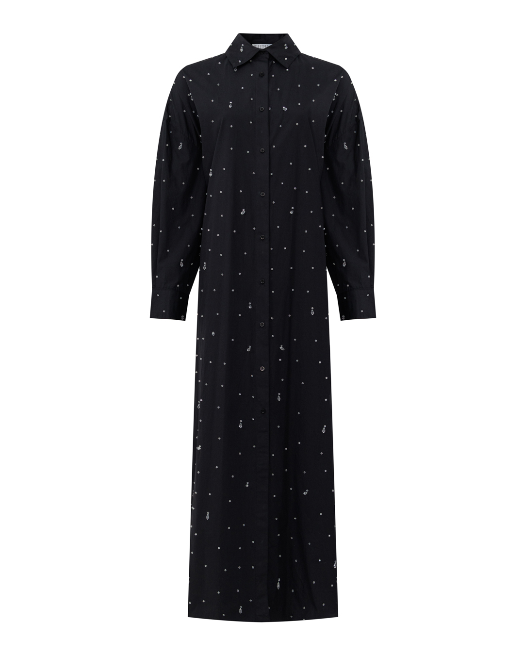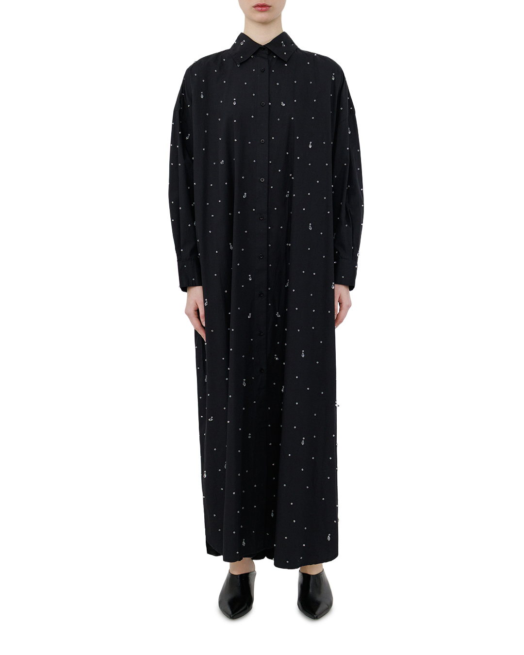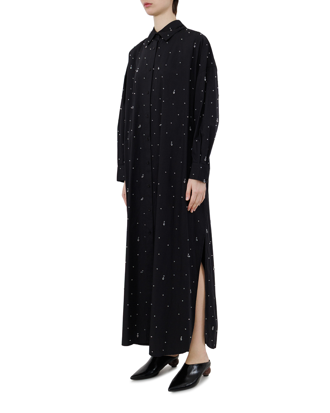 Это элегантное длинное платье-рубашка в чёрном цвете — воплощение утончённой роскоши. Свободный, но изысканный крой создаёт лёгкий, струящийся силуэт, который одновременно сдержан и выразителен. Классический воротник придаёт модели благородную строгость, а застёжка на пуговицы вдоль всей длины добавляет лаконичности и структурированности. Особую изюминку изделию придают деликатно вплетённые в ткань кристаллы — они рассыпаны по полотну словно звёздная пыль, создавая завораживающий мерцающий эффект. Игра света на кристаллах придаёт платью динамичность и глубину, превращая его в настоящий арт-объект. Боковой разрез вносит ноту непринуждённой грации, позволяя играть с образом — от изысканно-торжественного до более лёгкого и воздушного. Рукава полной длины с аккуратными манжетами завершают композицию, подчёркивая безупречный вкус. Сочетание лаконичного кроя и роскошной деталировки в виде кристаллов делает это платье идеальным выбором для особых случаев. Оно с лёгкостью станет центральным элементом вечернего образа, подчёркивая индивидуальность и статус своей обладательницы.