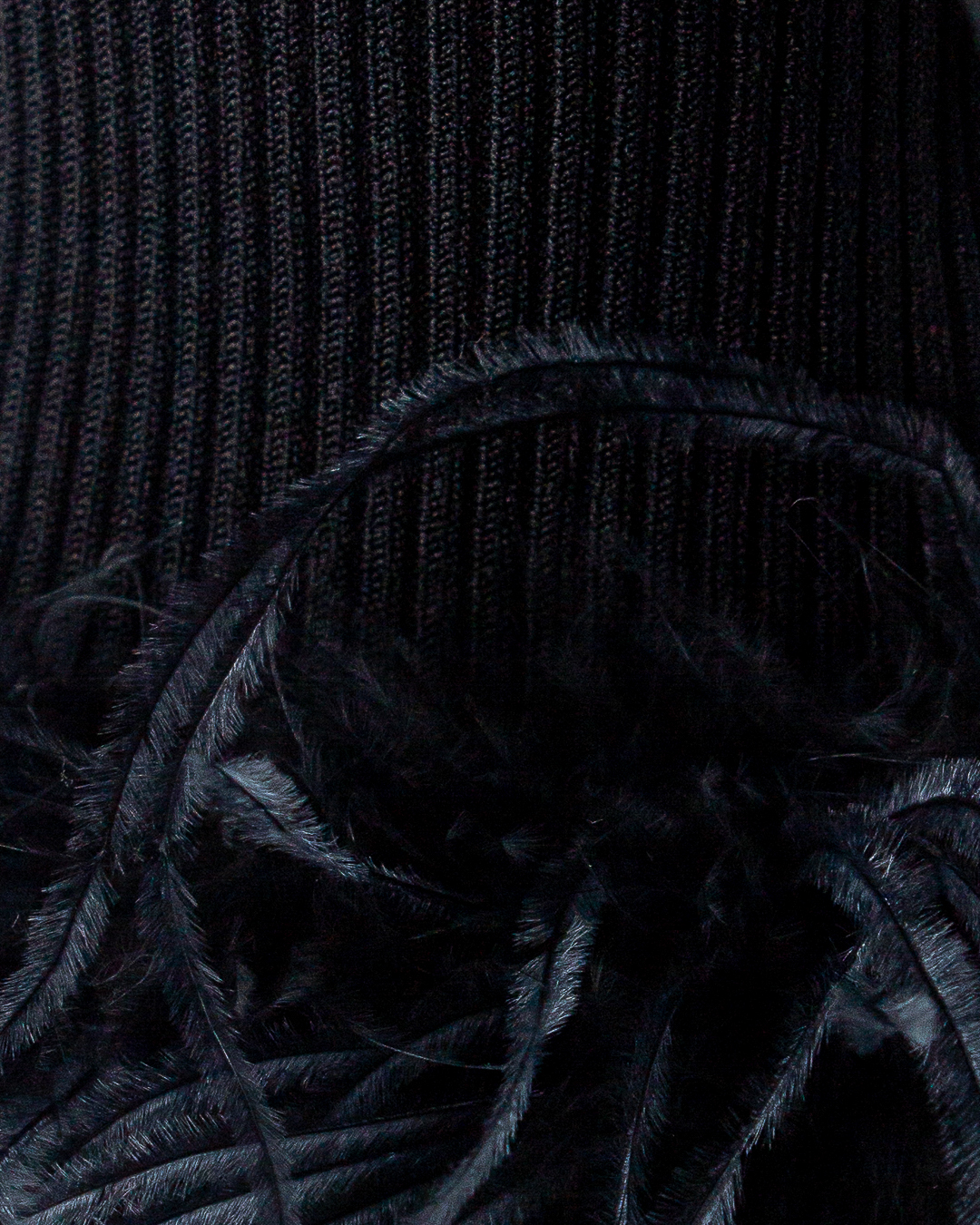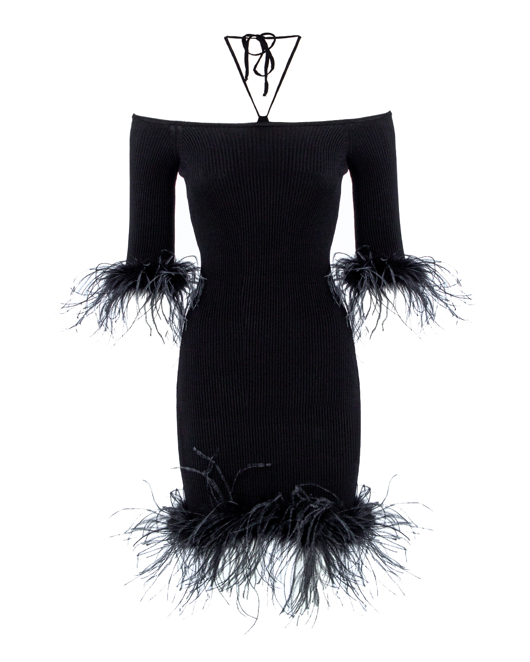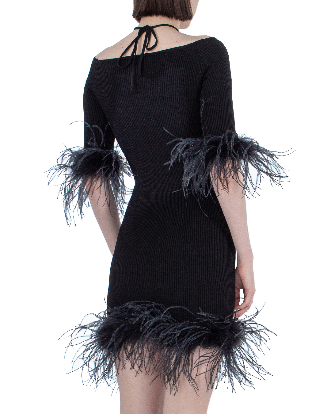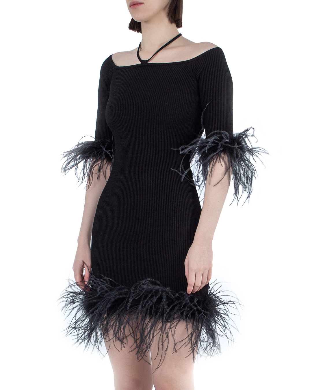 Коктейльное платье-мини из вискозы в черном цвете. Облегающее изделие с открытыми плечами и тонкими завязками вокруг шеи. Платье дополнено отделкой перьями.