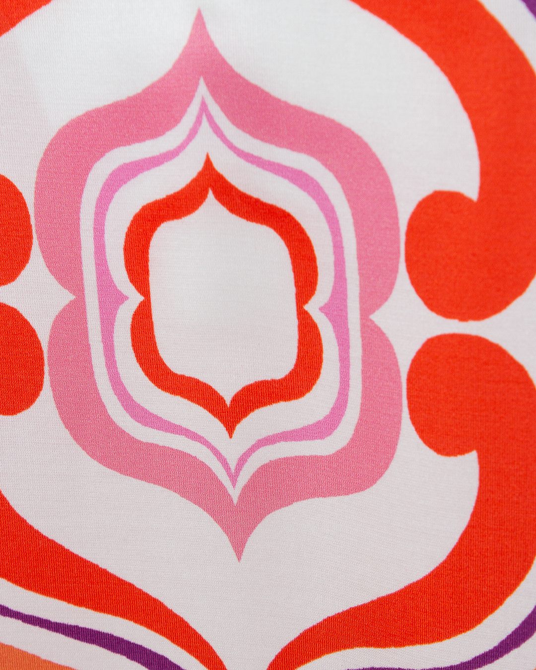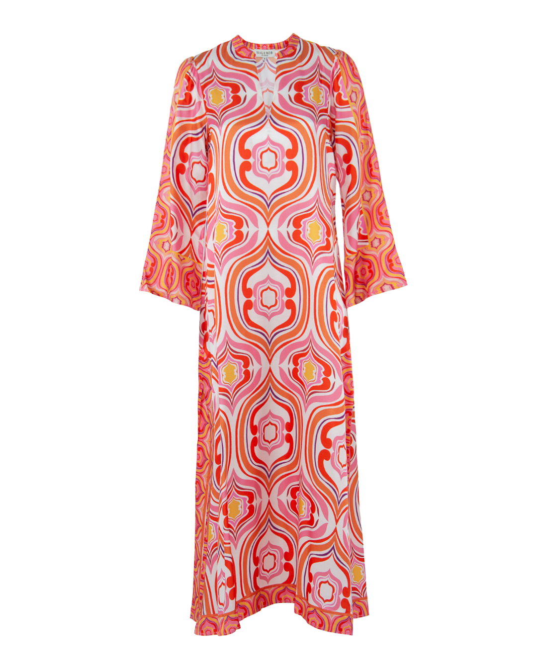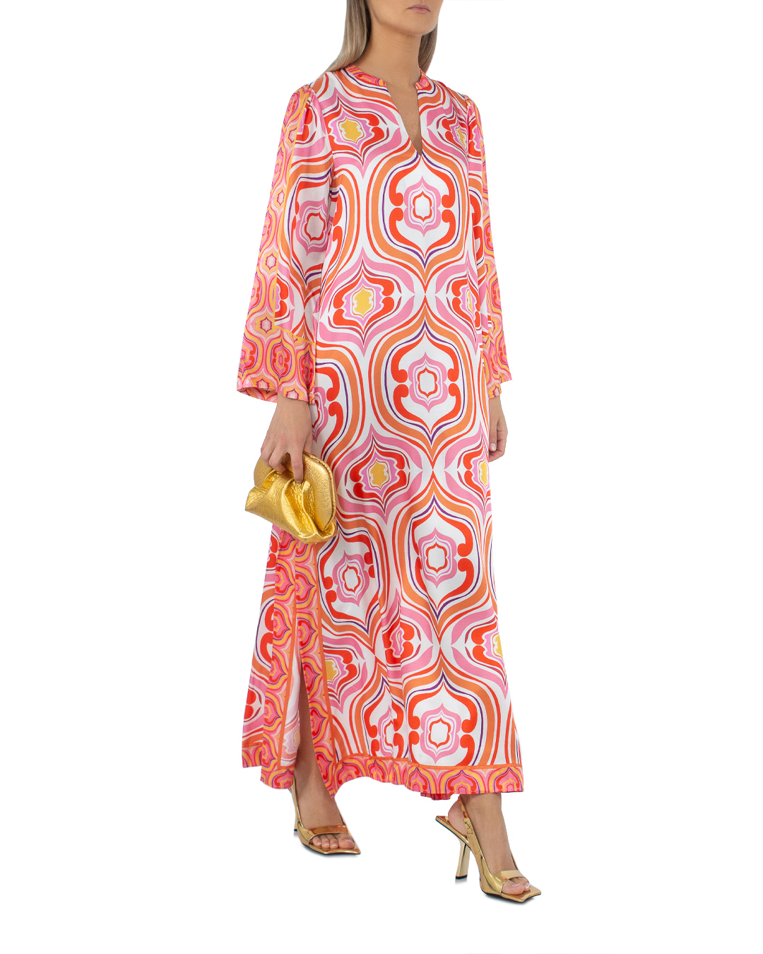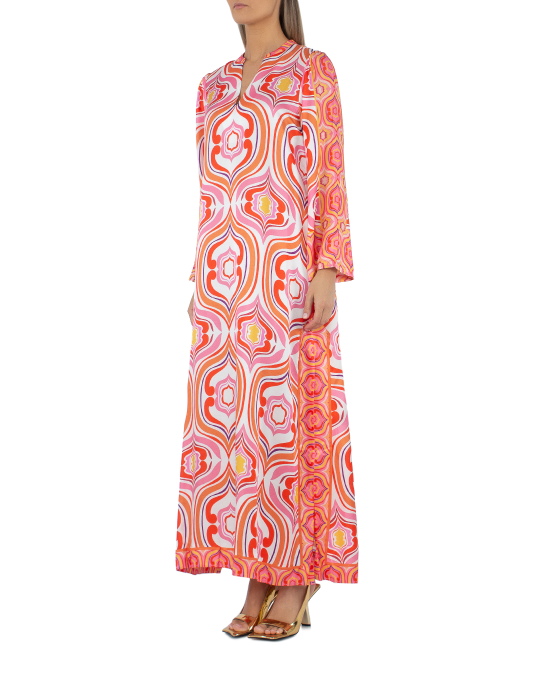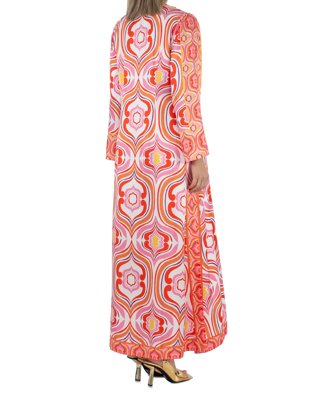 Платье Hale Bob сшили из вискозы и шелка с ярким узором. Модель прямого силуэта длины макси с длинными рукавами и двумя разрезами по бокам.