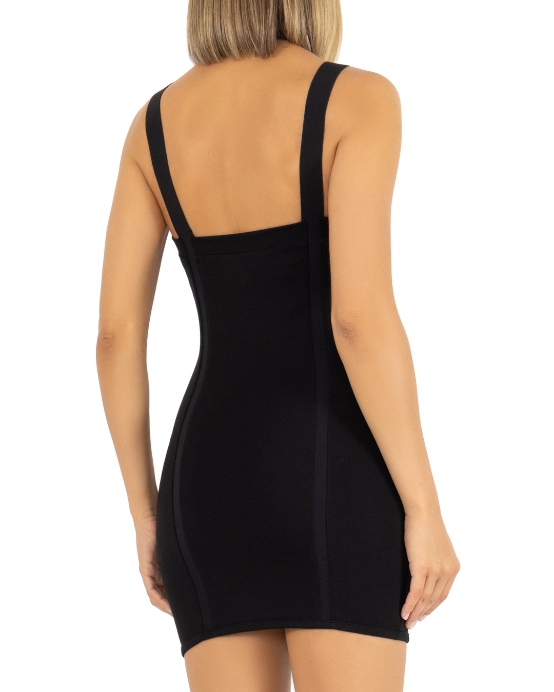 Платье мини HELIOT EMIL из смеси вискозы и нейлона черного цвета с металлическим логотипом бренда. Модель облегающего силуэта с лямками и застежкой на шее.