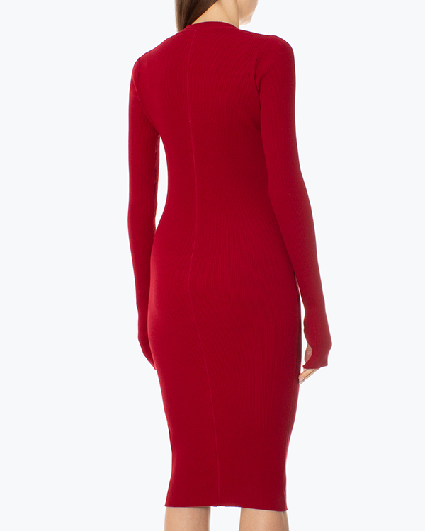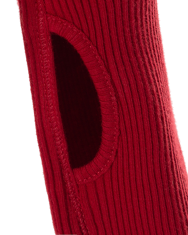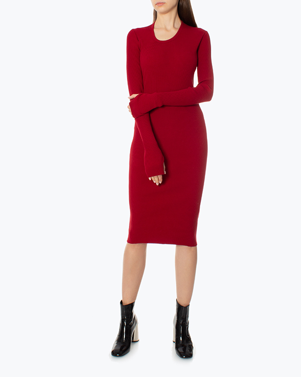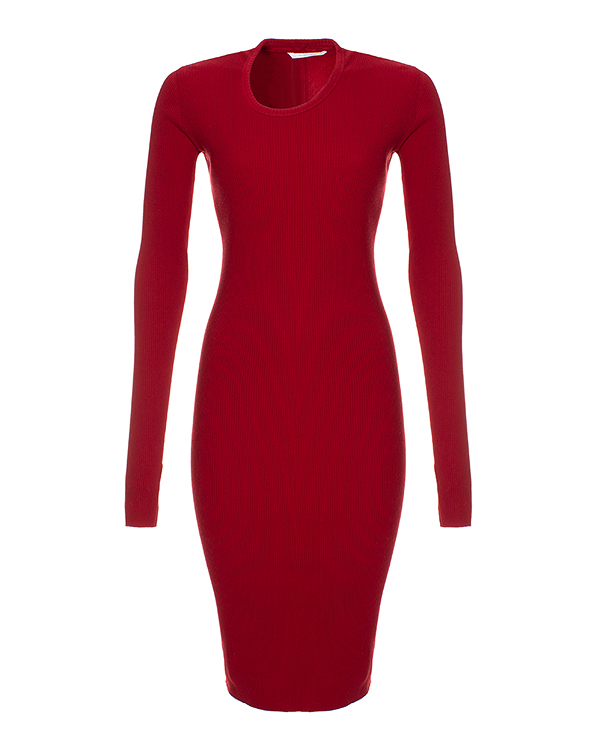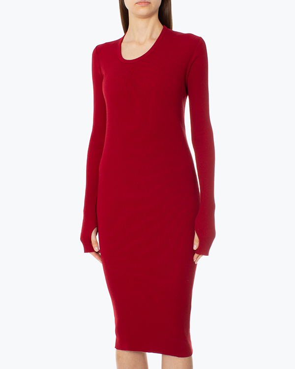 Платье из трикотажного хлопка в рубчик красного оттенка. Облегающее изделие длиной ниже колена со смещенным овальным вырезом. Рукава дополнены вырезами для больших пальцев.