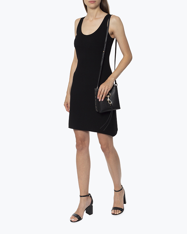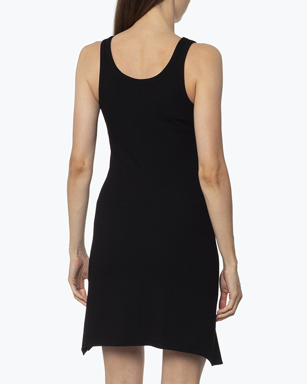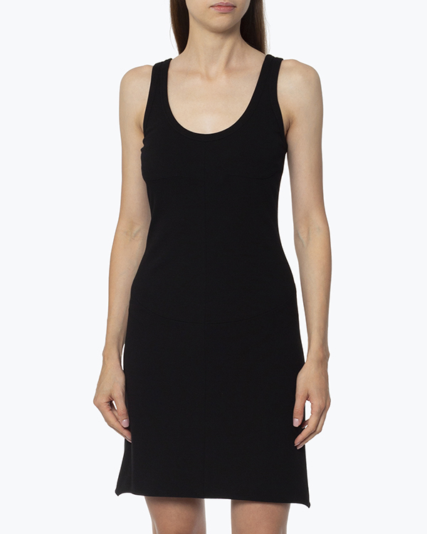 Лаконичное платье-мини из эластичной вискозы черного цвета. Приталенное изделие полуприлегающего силуэта.