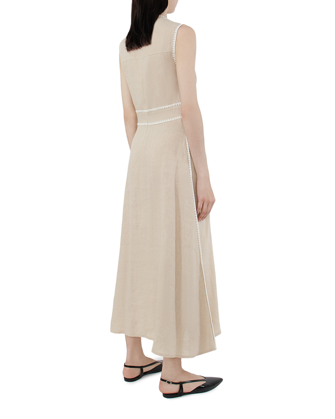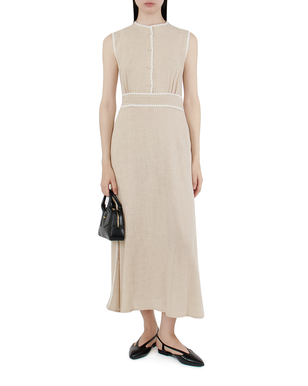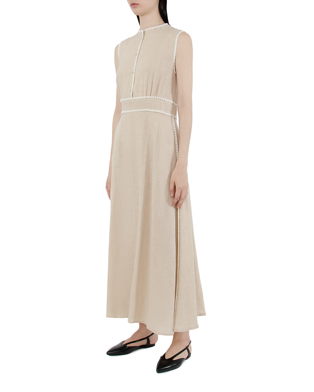Это платье воплощает в себе нежность и элегантность с нотками винтажной романтики. Мягкий бежевый оттенок подчеркивает естественность и сдержанность, создавая идеальный фон для утонченного образа. Ткань струится по фигуре, придавая легкость и воздушность. Высокий воротник-стойка добавляет платью изысканность и утонченность, подчеркивая линию шеи. Застежка на пуговицы спереди обеспечивает удобство и стиль, формируя акцент на вертикальной линии и визуально удлиняя силуэт. Элегантные проймы и аккуратные швы создают чистый, лаконичный силуэт, а декоративная отделка, выполненная из деликатного кружева, добавляет романтичности и привлекательности. Линия талии подчеркивается элегантной узкой вставкой, акцентируя женственность и грациозность фигуры. Длина платья до пола и свободный крой делают его идеальным вариантом как для повседневной носки, так и для более формальных случаев, привнося в образ изящество и уверенность.