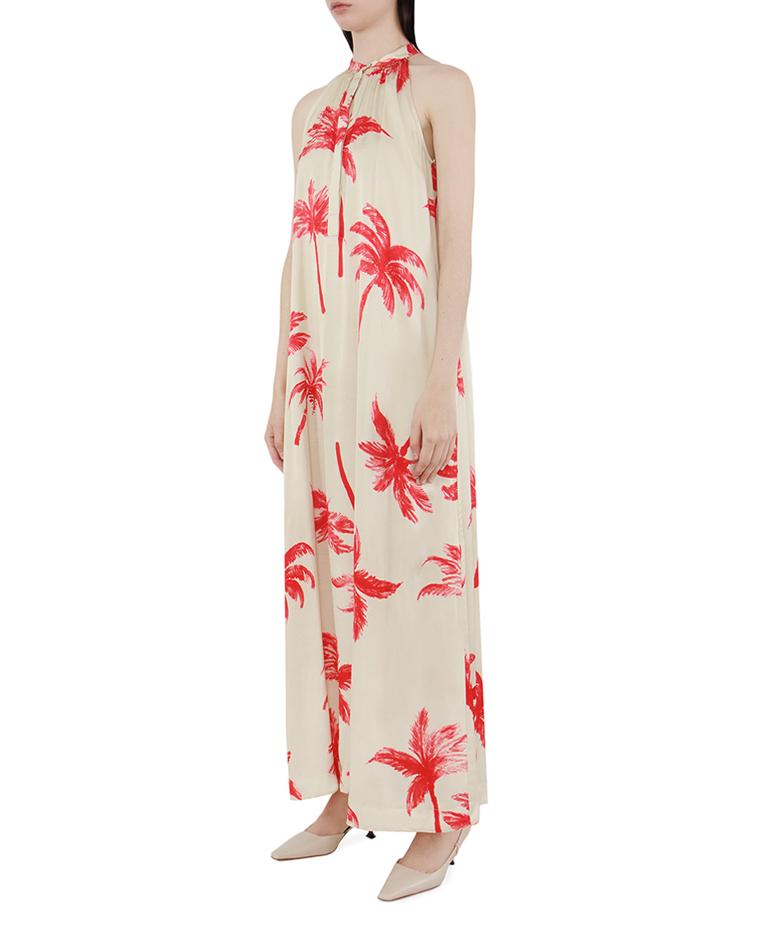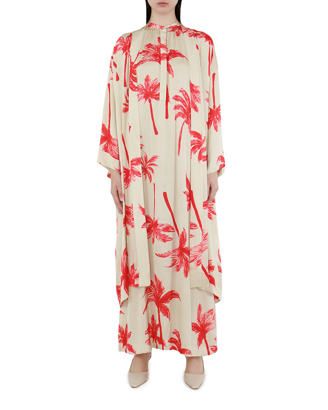 Это платье — идеальный пример летней элегантности с нотками тропического шика. Светлый фон в сочетании с яркими красными узорами пальм создает жизнерадостный и освежающий образ, идеально подходящий для жарких дней. Платье А-силуэта обеспечивает легкость и свободное движение, что придает ощущение воздушности и непринужденности. Высокий ворот с небольшими сборками обрамляет шею, добавляя изящности и легкости. Центральная застежка-декор в верхней части внушает элемент завершенности, а тонкие складки добавляют текстурности и объемности. Эта деталь делает платье более структурированным, сохраняя при этом его плавность. Свободный крой и длина до пола подчеркивают женственность и делают его универсальным для различных мероприятий — будь то пляж или вечерняя прогулка по набережной. Легкая ткань не только комфортна в носке, но и визуально подчеркивает фигуру благодаря своей текучести. С этим платьем любой ваш выход станет ярким и стильным, подчеркивая вашу любовь к уникальности и изяществу.