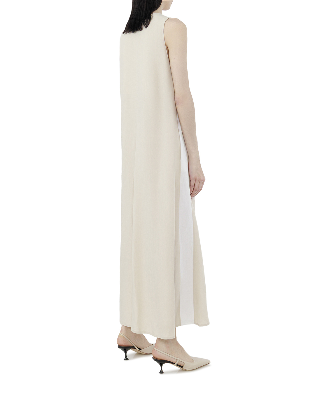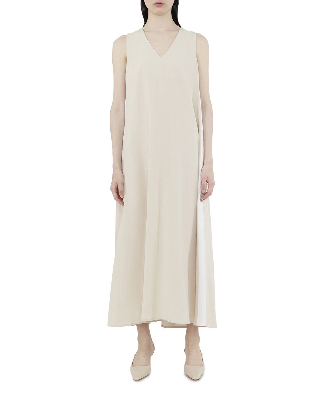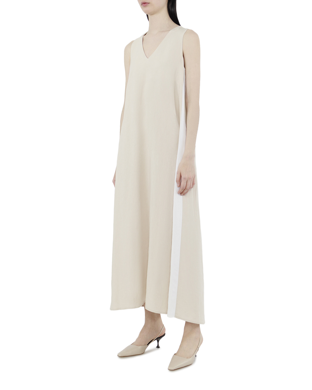 Это платье воплощает элегантность и современную простоту, предлагая стильное решение для утонченного гардероба. Изготовленное из лёгкой ткани, оно создает эффект невесомости и свободы движений. Прямой, свободный крой придаёт образу расслабленность и современность, а глубокий V-образный вырез подчеркивает изящество шеи и декольте, добавляя женственный акцент. Контрастная боковая вставка служит визуальным акцентом, привнося динамику и свежесть в общую цветовую гамму. Этот элемент добавляет платью оригинальность и выделяет его среди других. Безрукавный дизайн идеально подходит для летнего сезона, создавая лёгкость и комфорт. Элегантный бежевый цвет универсален и позволяет легко сочетать с различными аксессуарами и обувью. Это платье идеально сочетает в себе лаконичность формы и утонченность деталей, делая его выбором номер один для ценителей минималистичного шика.