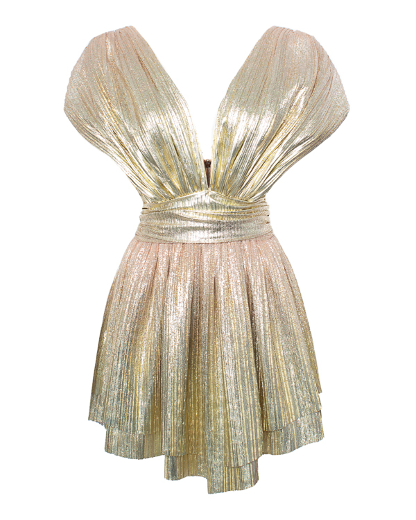 Платье-мини в греческом стиле из мелко-плиссированного материала золотого оттенка. Приталенное изделие с вырезом декольте и на спине. Платье с застежкой на спине на молнию.