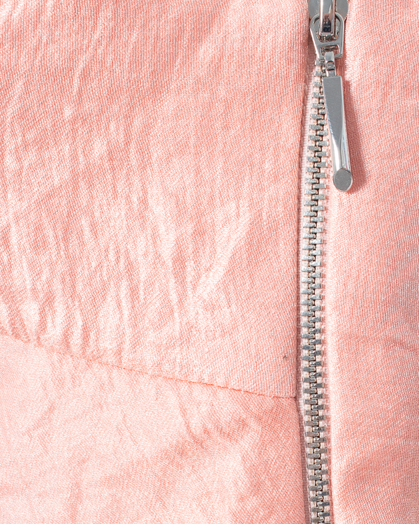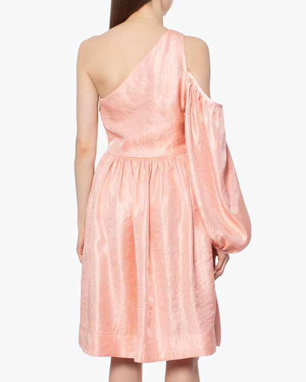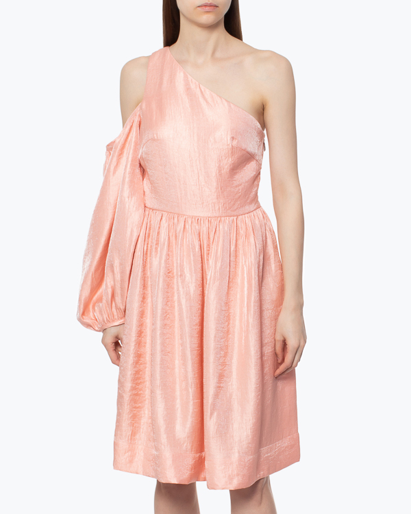 Платье из жатого материала с блеском розового оттенка. Модель с отрезной по линии талии и пышной юбкой длиной ниже колена. Платье выполнен с открытым плечом и одним объемным рукавом-буф.