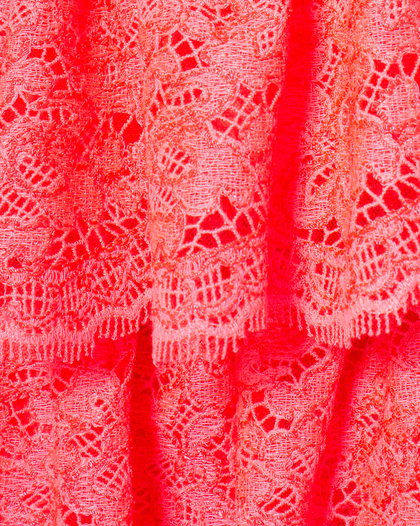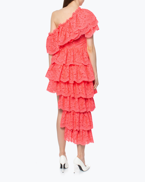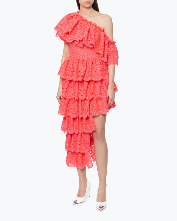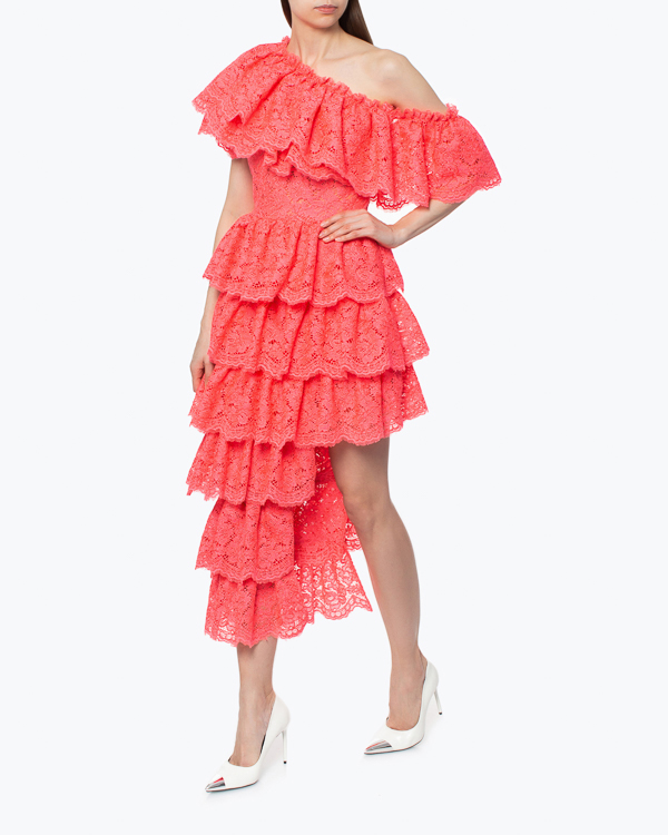 Платье выполнено из плотного кружева неонового розового оттенка. Модель на одно плечо и эластичной фиксирующей линией выреза. Платье прилегающего силуэта с объемным кружевом. Застежка сбоку на потайную молнию и высокий вырез на бедре.