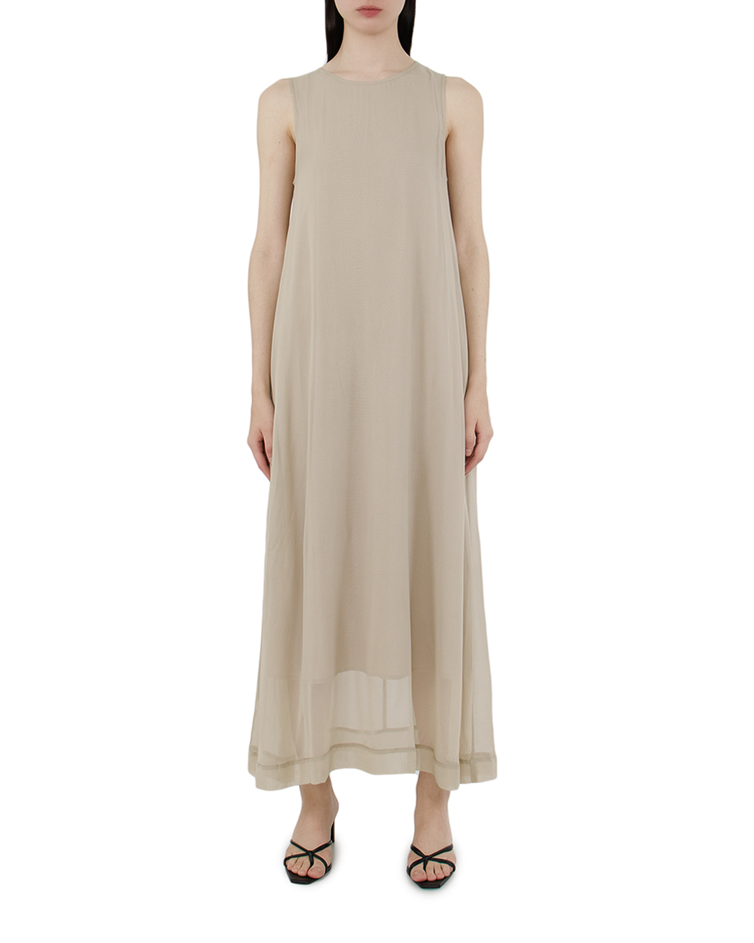 Это платье — воплощение минимализма и легкости, идеально для создания непринужденного, но изысканного образа. Мягкий бежевый оттенок делает его универсальным, позволяя сочетать с различными аксессуарами. Свободный крой и длина в пол создают эффект плавности и воздушности, обеспечивая комфорт и свободу движения. Безупречно выполненная линия без рукавов и круглый вырез горловины акцентируют сдержанную элегантность платья. Особое внимание следует обратить на многослойность ткани, придающую дополнительный объем и глубину образу, сохраняя при этом его легкость. Чистые, лаконичные линии позволяют сосредоточиться на утонченной простоте и классе. Это платье станет идеальным выбором для дневных или вечерних выходов, где требуется подчеркнуть естественную грацию и утонченность. Комбинируя с легкими сандалиями или изысканными туфлями, оно подчеркнет ваш уникальный стиль.