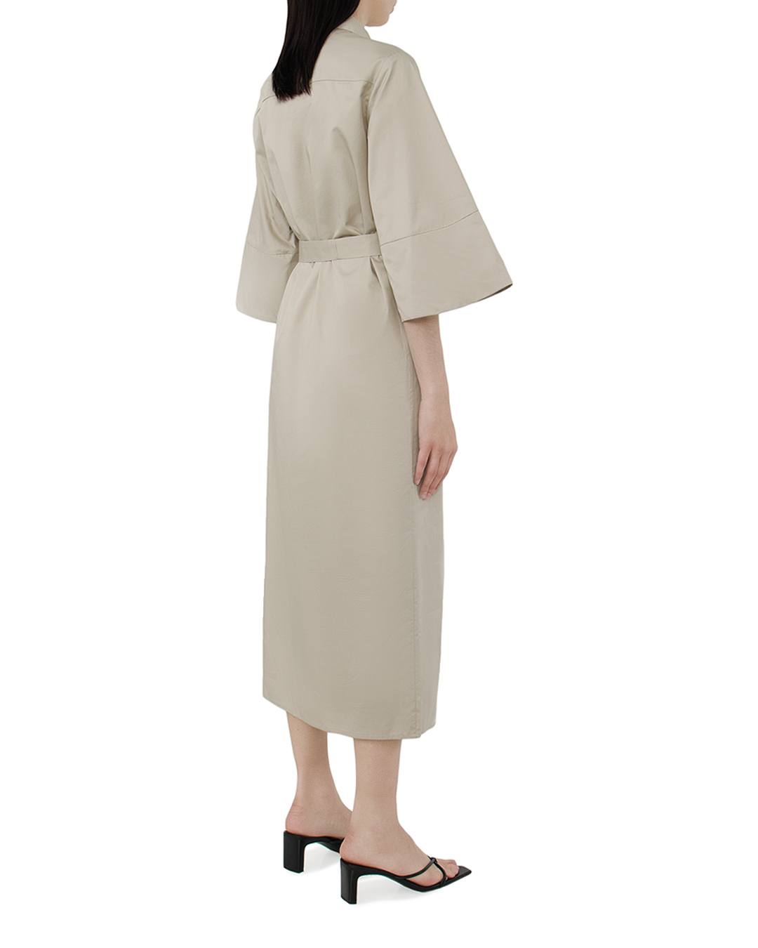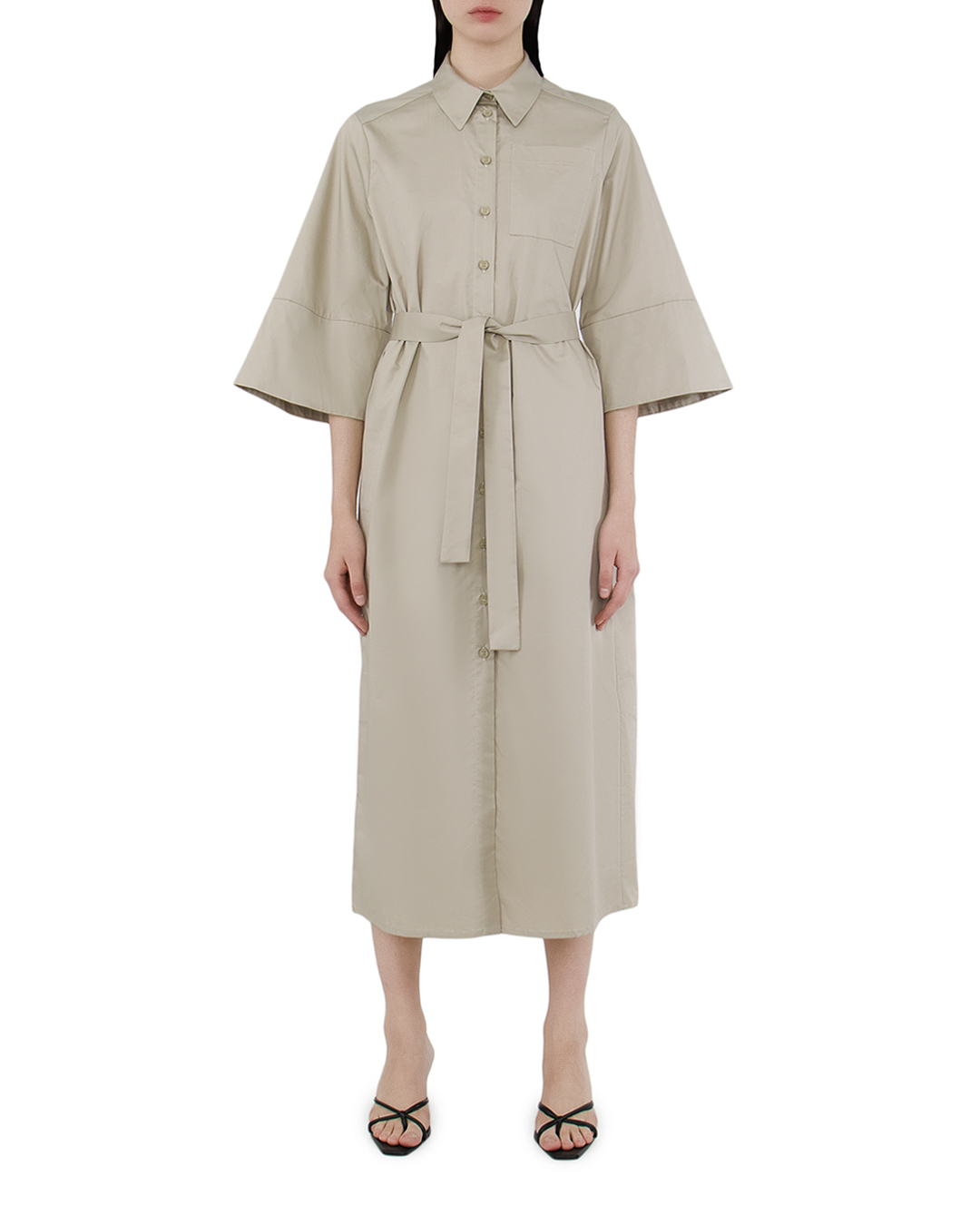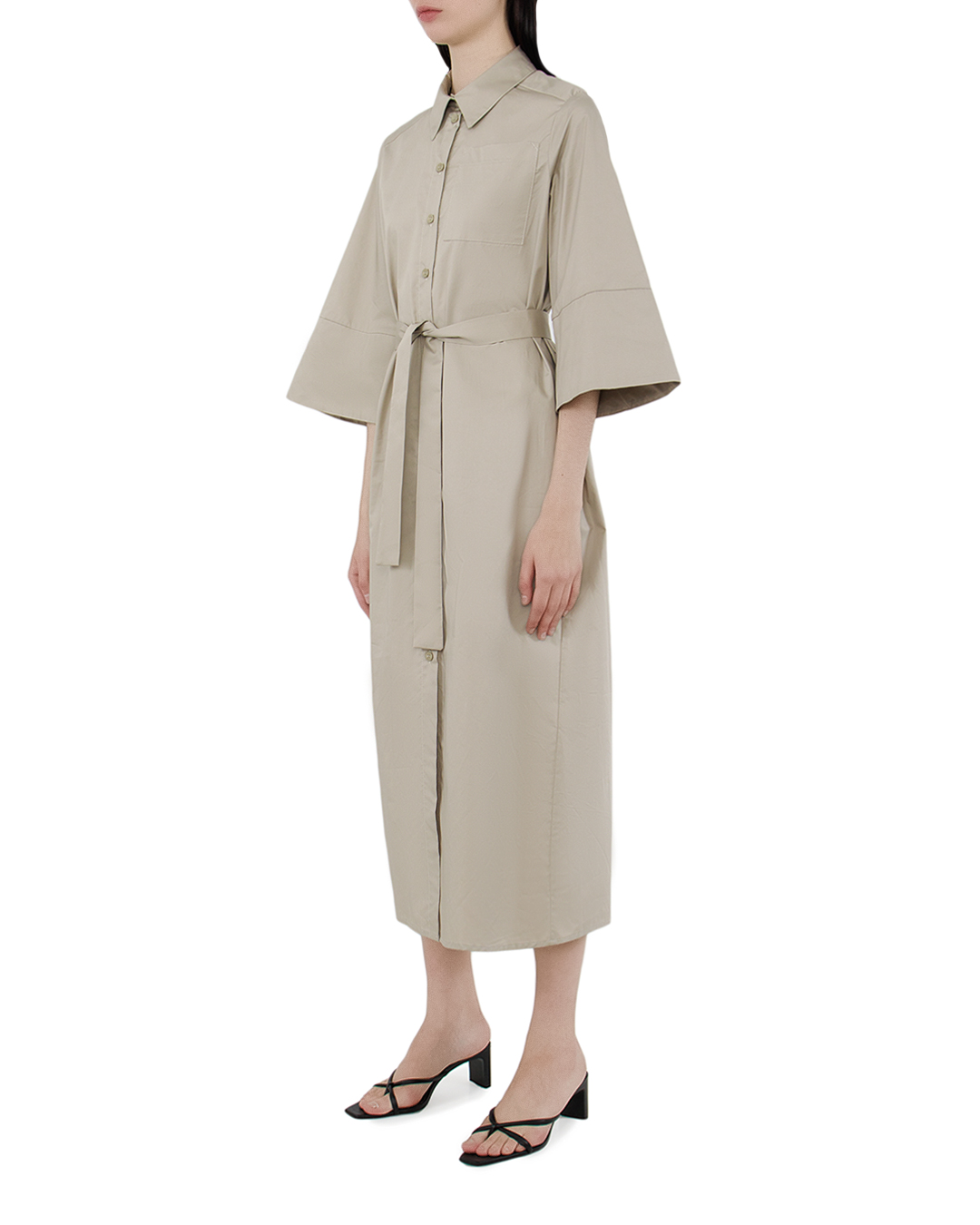 Перед вами платье в стиле "рубашка", вобравшее в себя элементы современного шика и утончённой классики. Оно выполнено в неброской, нежной цветовой гамме, что делает его универсальным и подходящим для любого сезона. Аккуратный отложной воротник добавляет строгих акцентов, в то время как планка с пуговицами по всей длине придаёт платью элегантность и облегчает его надевание. Рукава три четверти с широкими манжетами придают необычный силуэт, который выделяется своей оригинальностью и лёгкостью. Талия подчеркнута съёмным поясом, который может быть завязан как пояс-бант, добавляя индивидуальности и акцентируя внимание на грациозных линиях фигуры. Минималистичный нагрудный карман служит не только функциональной деталью, но и элементом дизайна, создающим сбалансированный облик. Текстура материала и изысканная простота создают гармоничный образ, где каждый элемент продуман и безупречно исполнен.