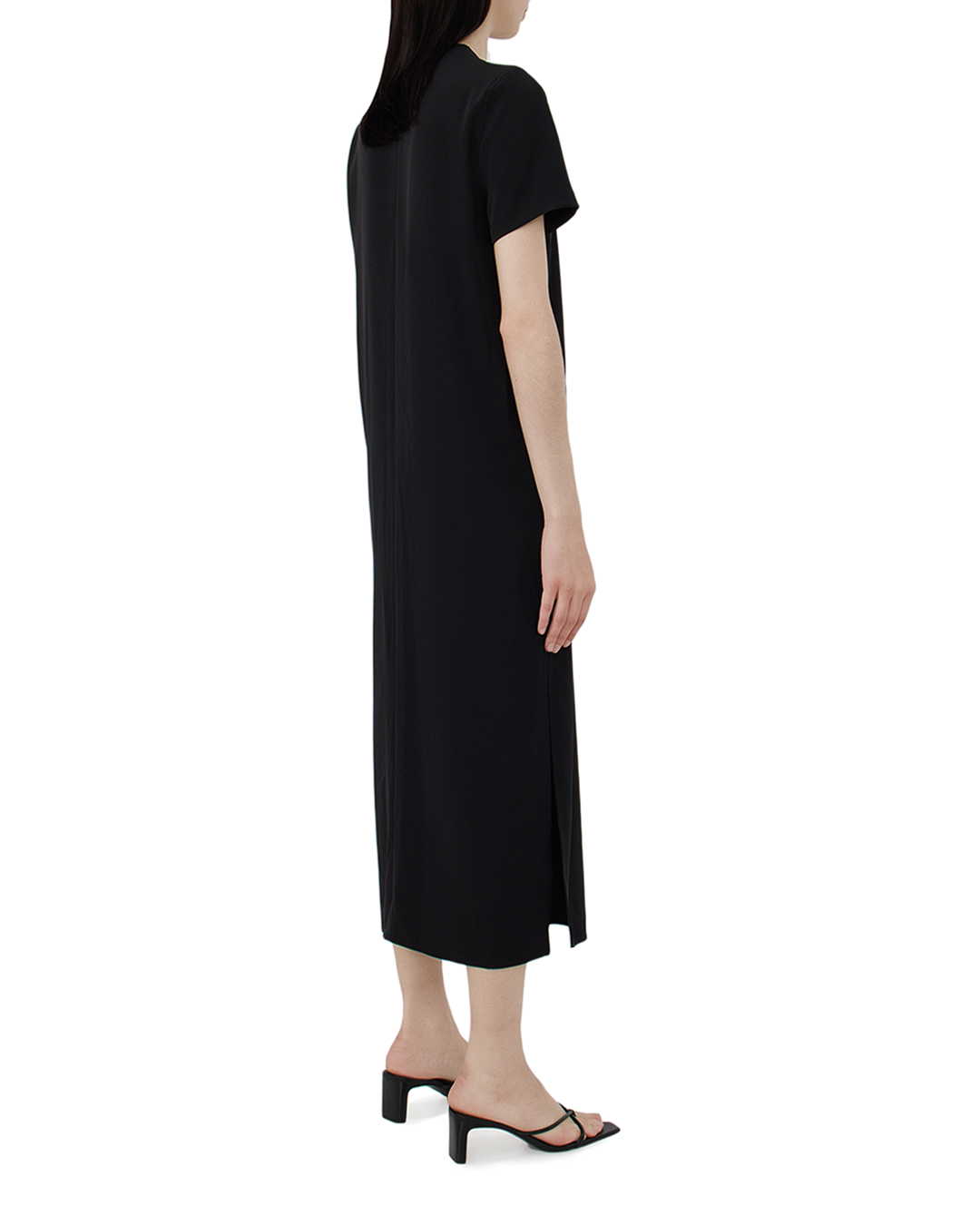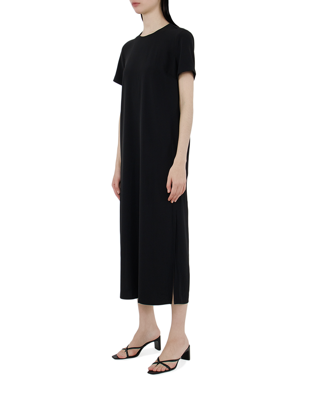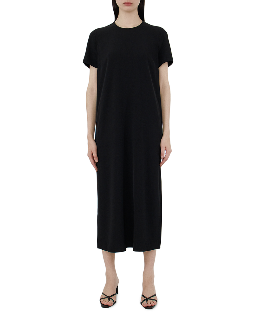 Это платье — воплощение элегантного минимализма, идеально подходящее для создания универсального и стильного образа. Глубокий чёрный цвет подчеркивает его изысканность и делает его основой гардероба. Классический прямой силуэт и длина миди обеспечивают комфорт и свободу движений, сохраняя при этом утонченную эстетику. Короткие рукава и округлый вырез добавляют лаконичности, делая платье универсальным вариантом для различных случаев. Боковые разрезы на подоле — это изящная деталь, которая вносит элемент динамики и игривости, позволяя создать более легкий и свободный образ. Чистые линии и непринуждённый крой подчеркивают современный стиль и практичность. Платье великолепно сочетается с различной обувью, от изящных каблуков до стильных мюлей, делая его идеальным выбором как для повседневных прогулок, так и для вечерних встреч, где ценится простота и хороший вкус.