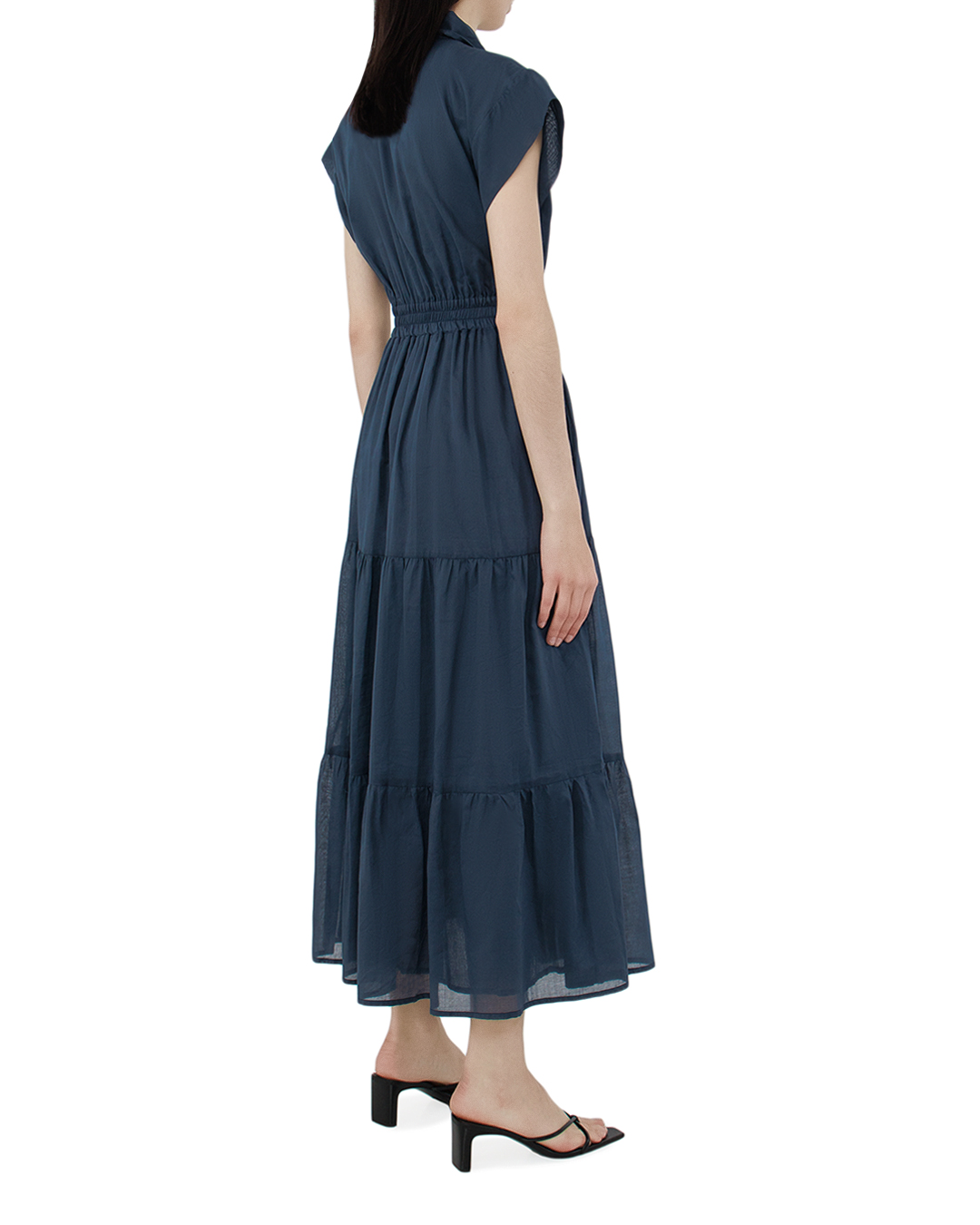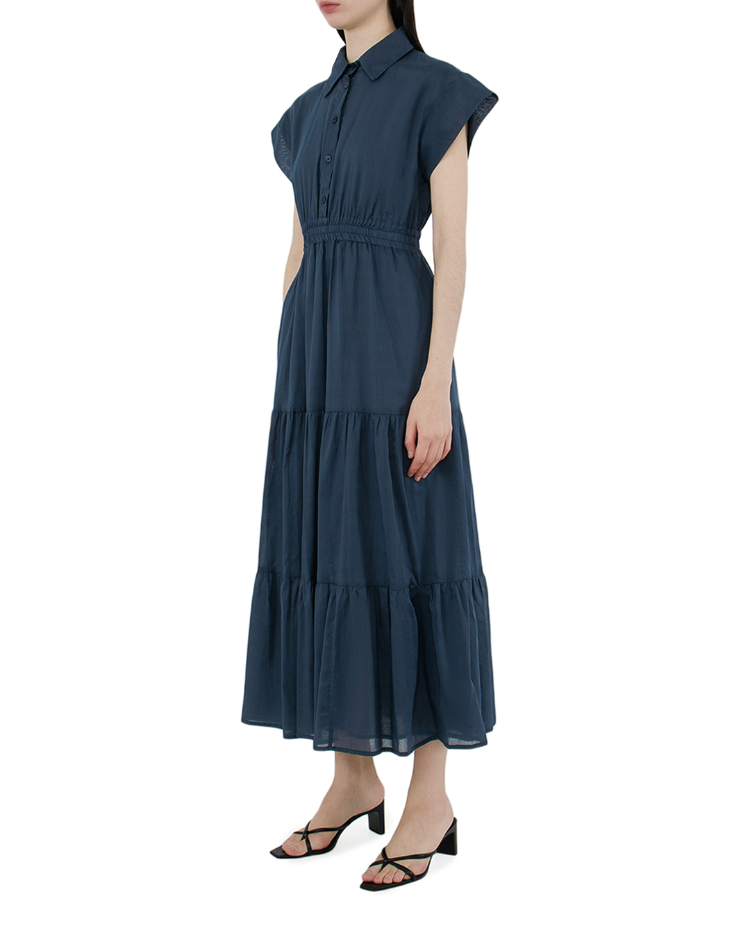 Это платье представляет собой изысканное сочетание классики и современного романтизма. Глубокий синий оттенок придает модели элегантность и утонченность, идеально подходя для разнообразных обстоятельств. Платье с короткими рукавами и отложным воротником подчеркивает классический стиль, создавая образ, который всегда актуален. Застежка на пуговицы на лифе добавляет структурированности и строгости. Приталенный верх с эластичной талией акцентирует женственность и формирует идеальный силуэт. Многоярусный низ создает объем и движение, добавляя динамики и лёгкости образу. Эта модель великолепно смотрится в сочетании с изящными сандалиями или элегантными туфлями, создавая идеальный ансамбль для летних вечеров или дневных прогулок, когда важно выглядеть безупречно и чувственно.