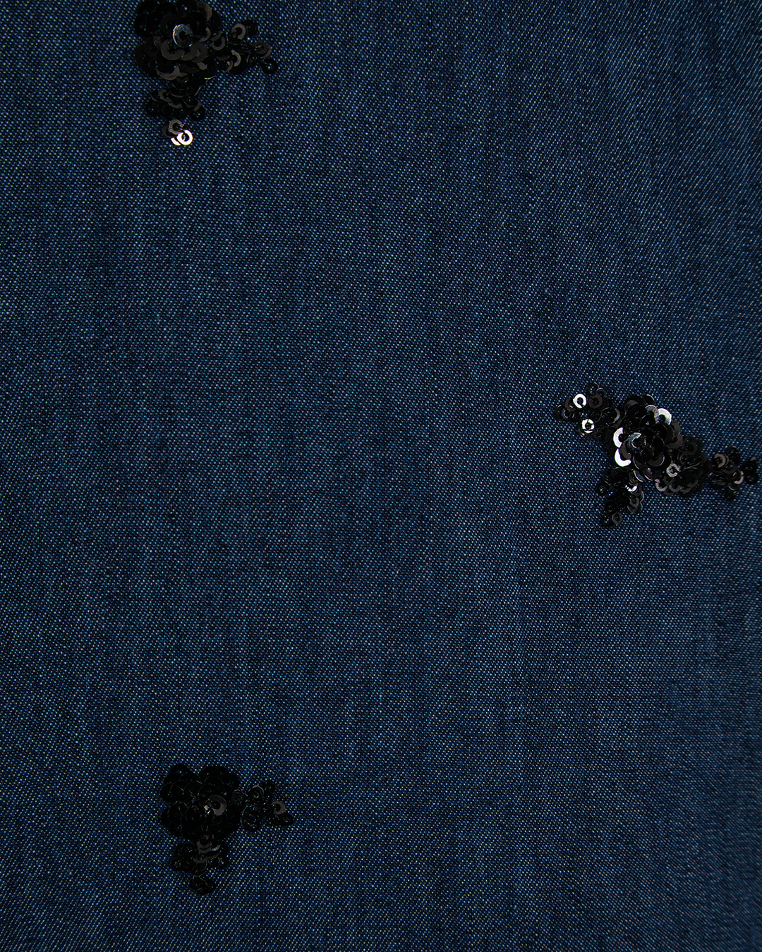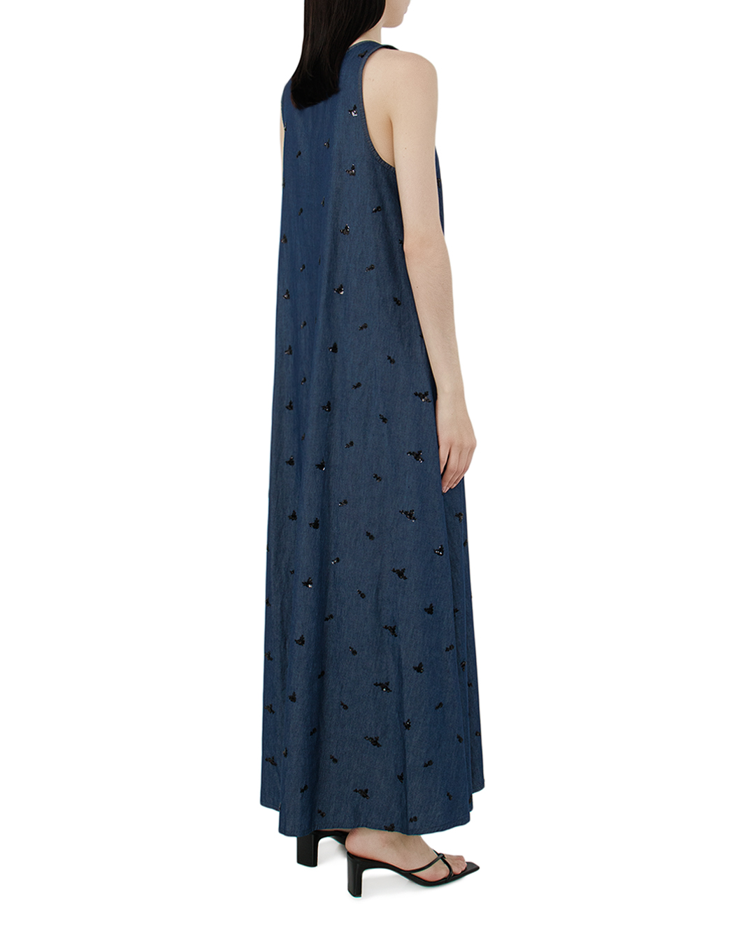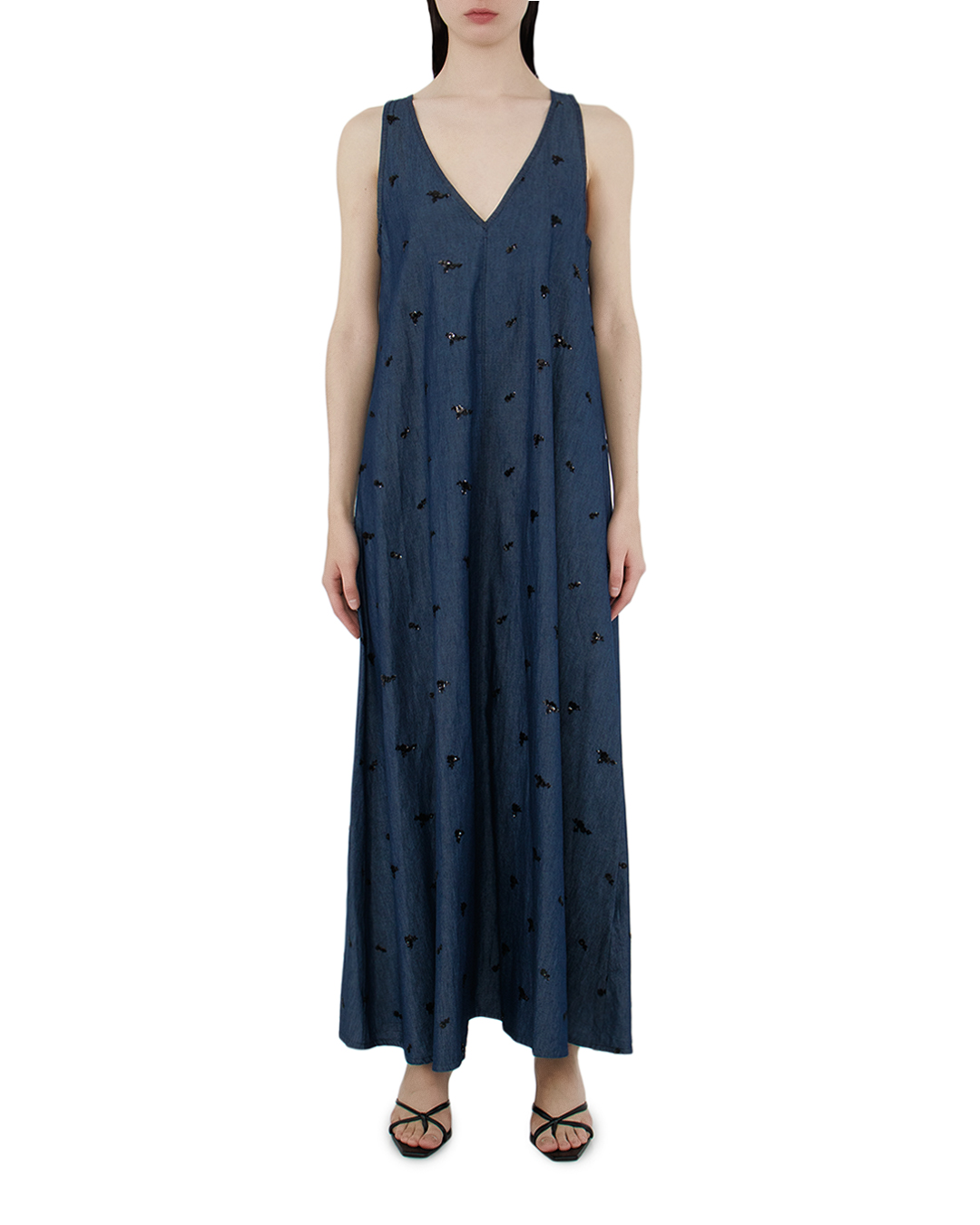Это потрясающее платье — квинтэссенция бохо-шика и легкости, идеально подходящее для создания свободного и модного образа. Глубокий синий оттенок привносит нотку сдержанной элегантности и универсальности. Свободный, струящийся силуэт платья обеспечивает комфорт и делает его идеальным выбором для теплой погоды. V-образный вырез визуально удлиняет силуэт, придавая образу женственность и изящество. Особое внимание привлекают изысканные вышивки и пайетки, рассеянные по всей поверхности платья. Эти элементы добавляют мерцающий акцент, создавая эффект динамичного движения ткани при ходьбе. Длинная длина платья в пол придаёт ему романтичность и изысканность, идеально сочетаясь с сандалиями или босоножками на платформе. Этот наряд станет идеальным выбором для вечерних прогулок, летних фестивалей или непринуждённых мероприятий на открытом воздухе, где комфорт и стиль идут рука об руку.