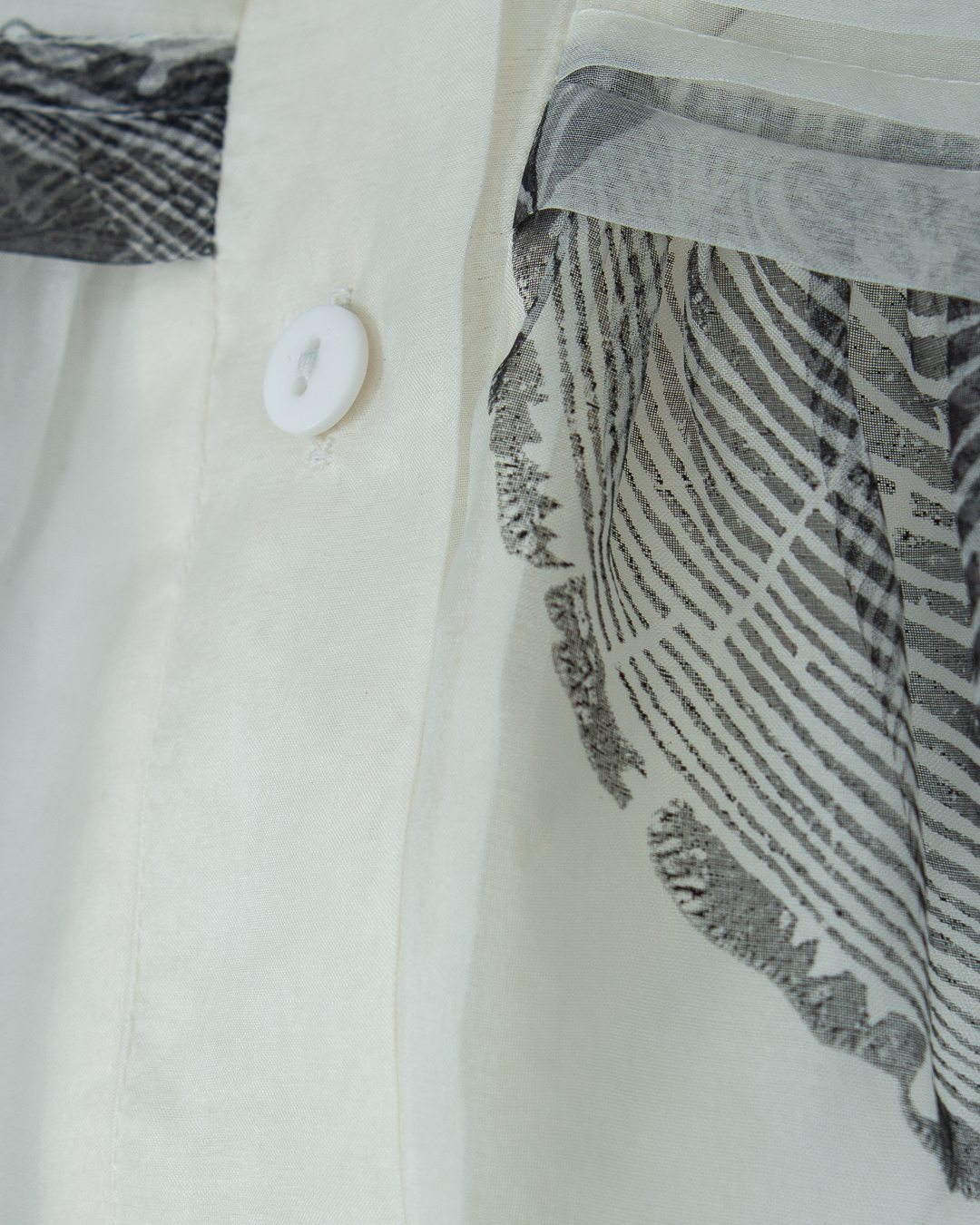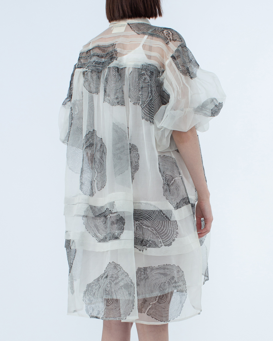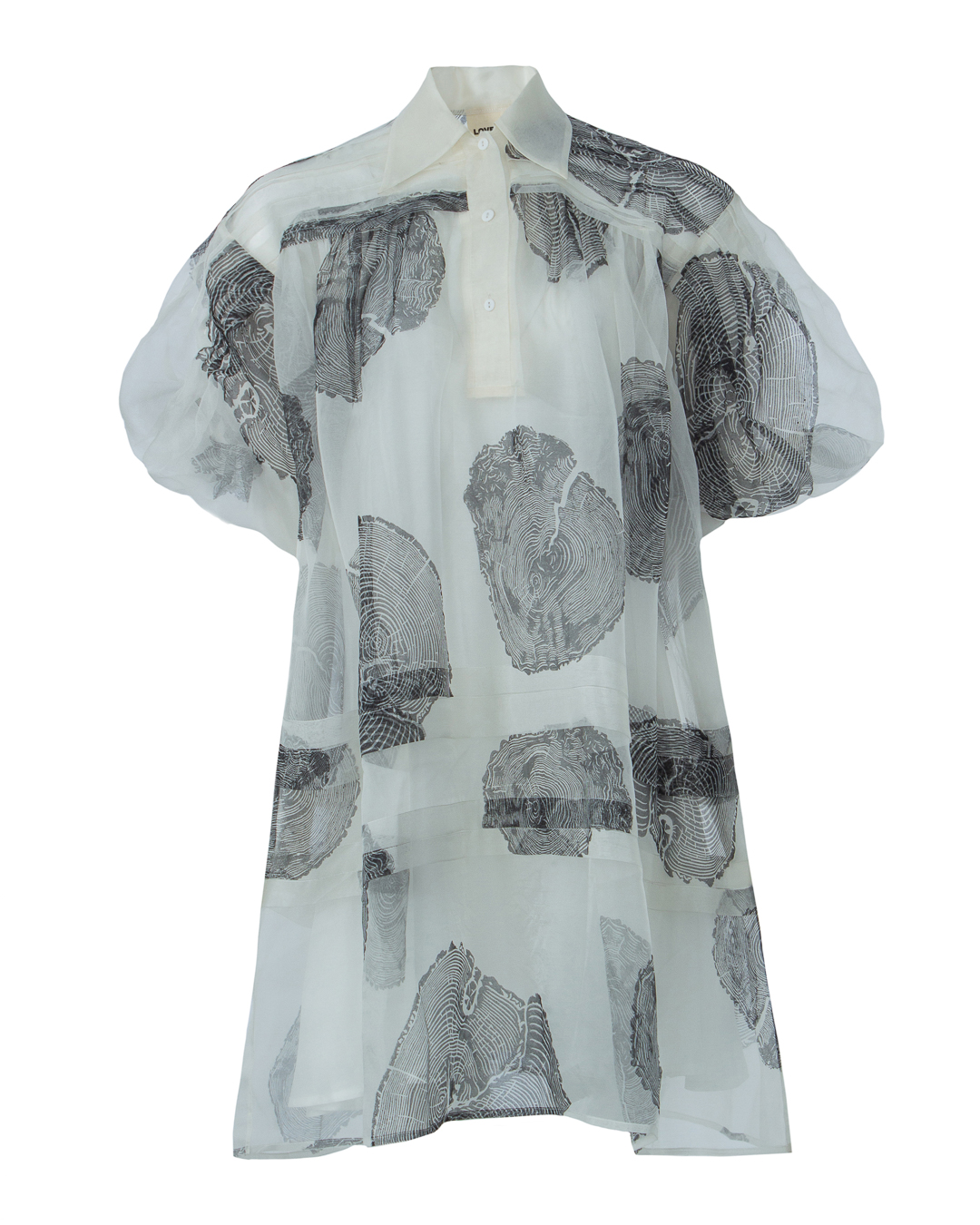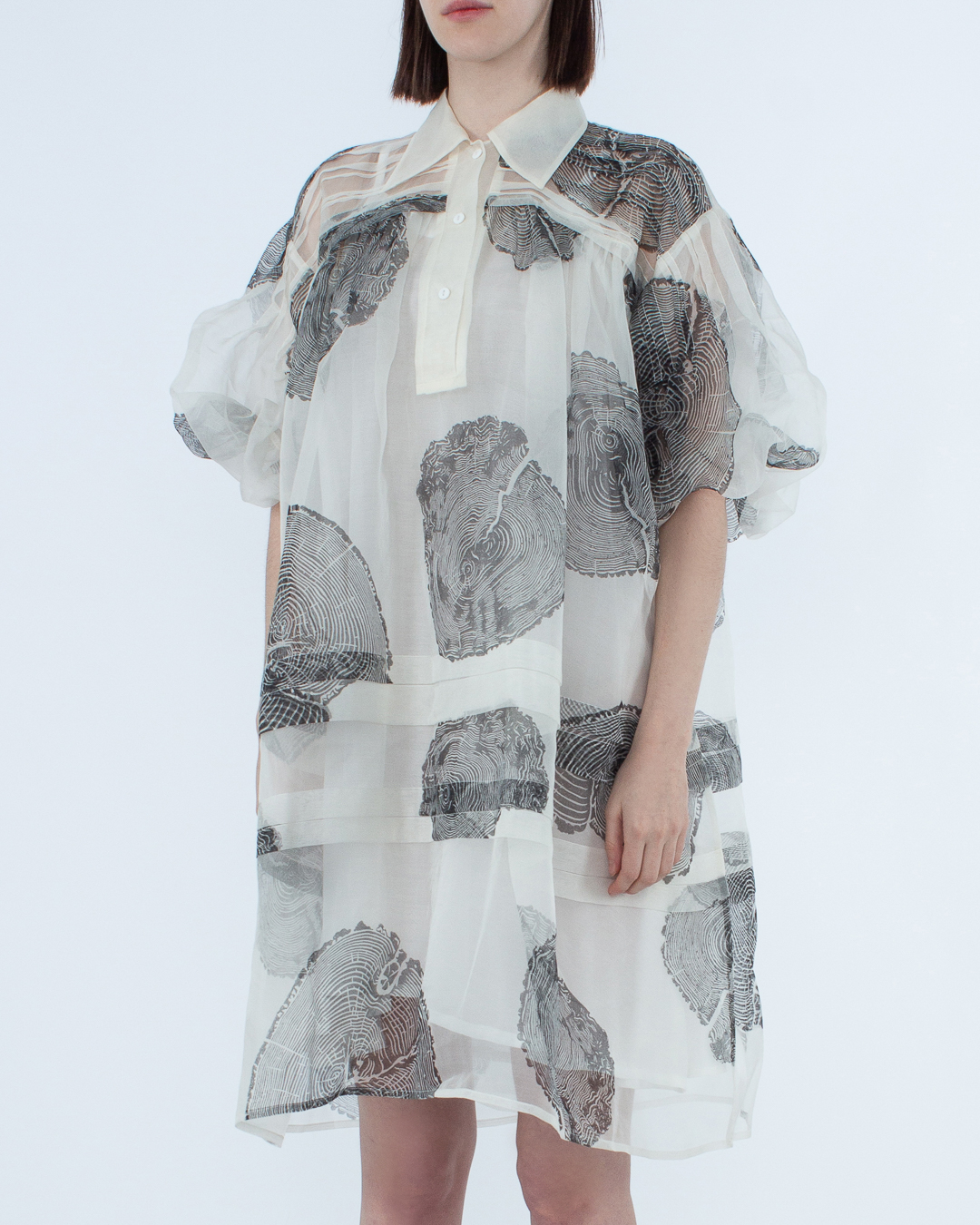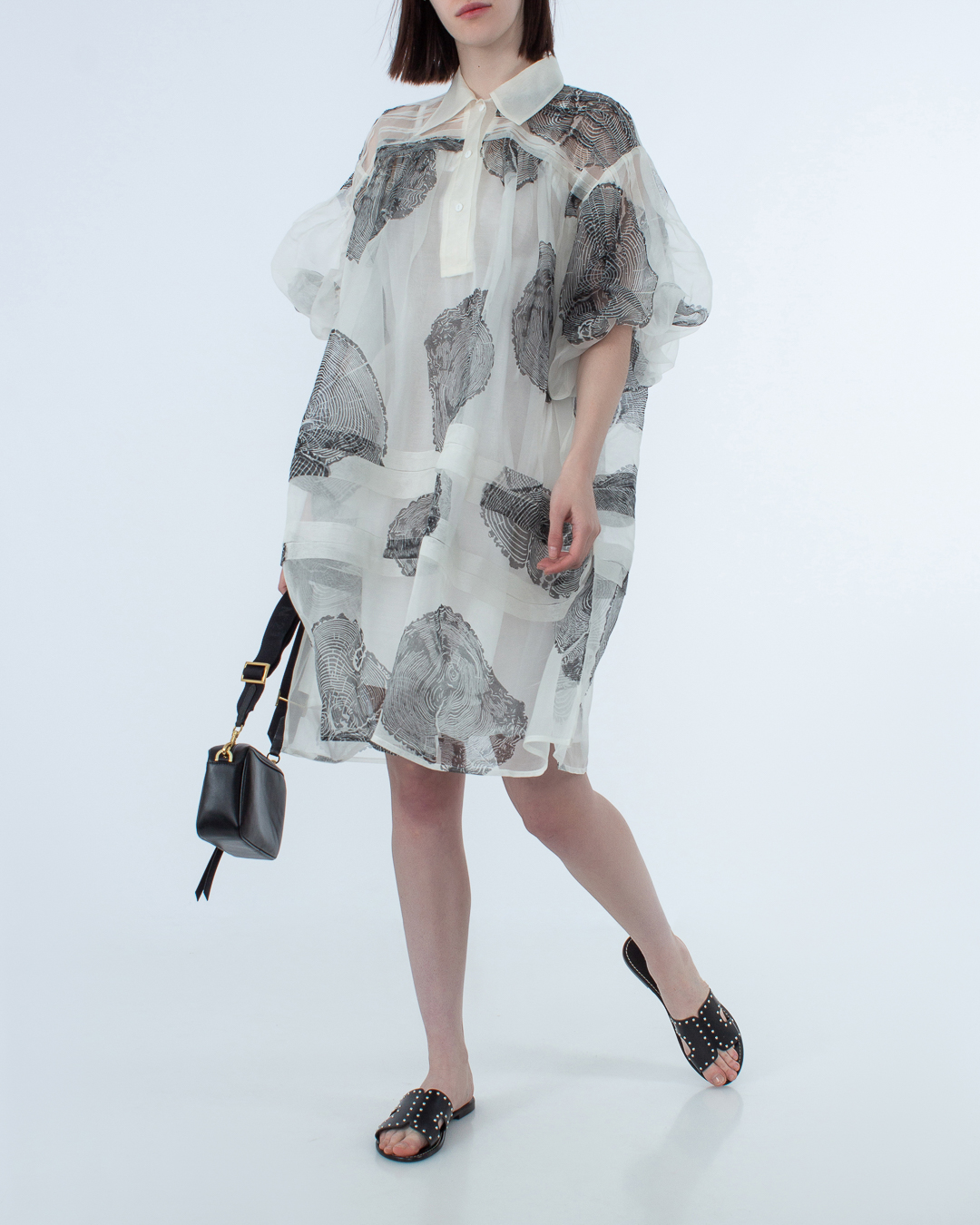Платье LOVEBIRDS из новой коллекции сшили из тонкого полупрозрачного шелка с абстрактным принтом. Модель свободного силуэта с застежкой на пуговицы и планку дополнено отложным воротником и широкими рукавами-буф.