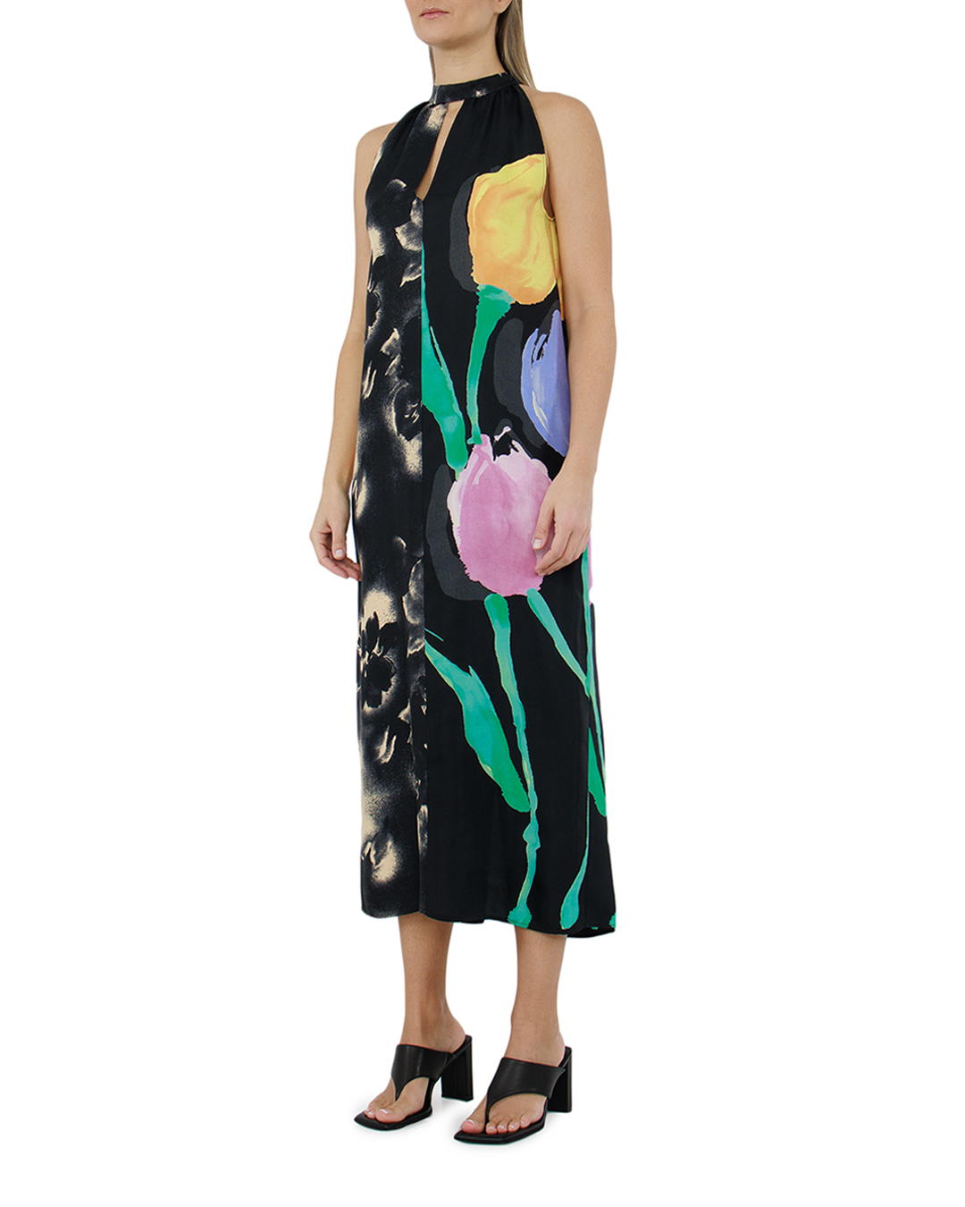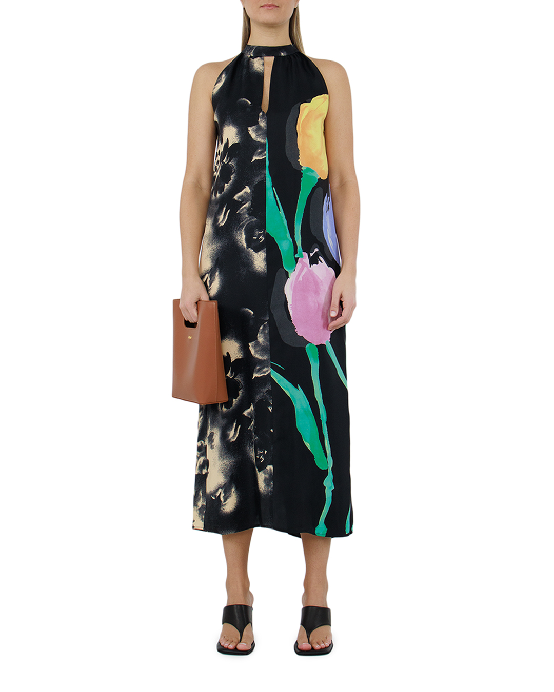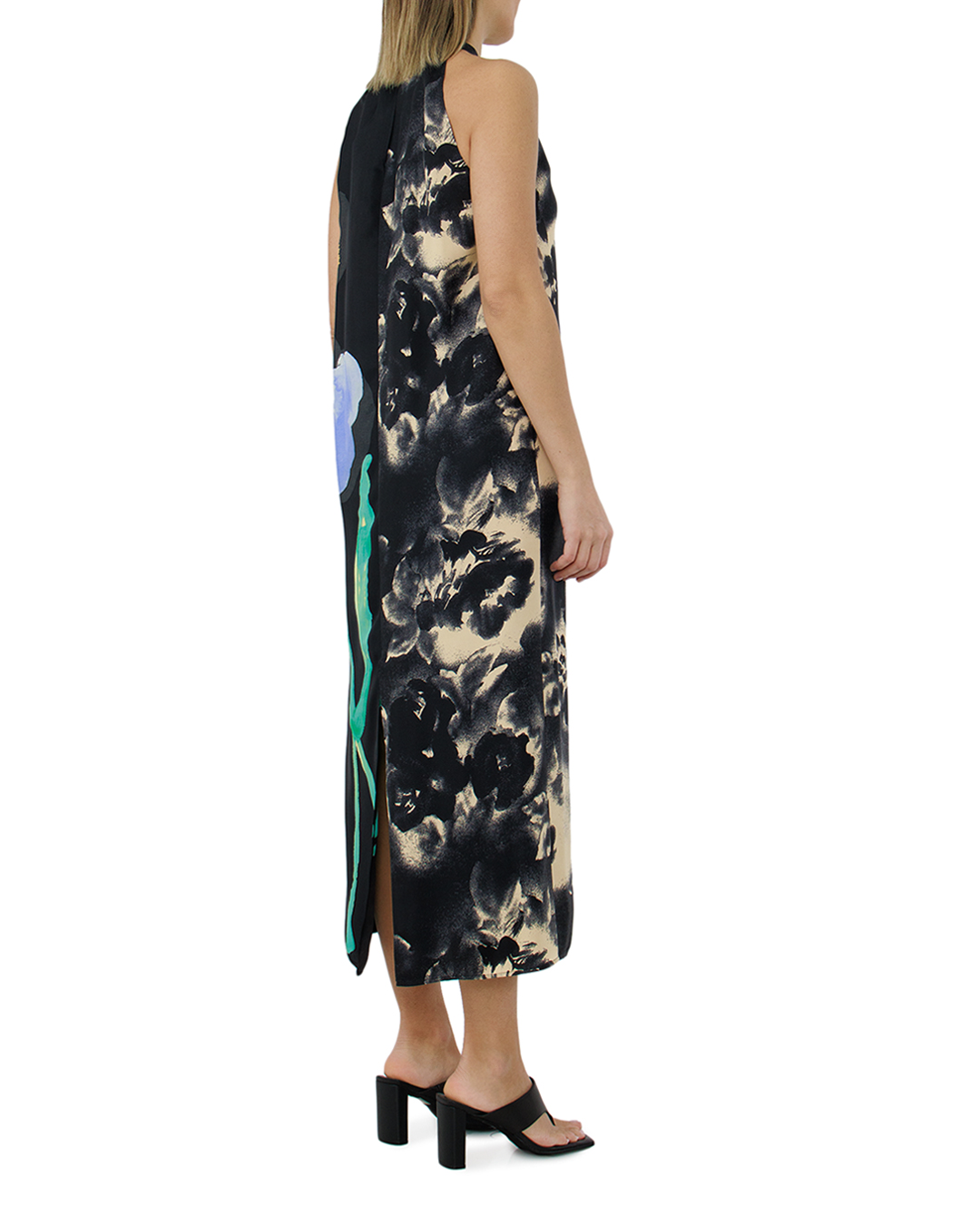 Это платье-халтер олицетворяет высшую степень утонченности и выразительности. Восхитительный А-силуэт плавно ниспадает вдоль фигуры, даря легкость и небрежную элегантность, а высокий вырез на шее подчеркивает шею и плечи, создавая впечатление изысканности и благородства. Ткань, из которой выполнено платье, обладает мягким переливом, создавая эффект текучести и сияния. Смелый комбинированный принт, сочетающий абстрактные цветочные мотивы с крупными мазками, придает изделию артистичность и индивидуальность. Яркие цветовые акценты оживают на фоне глубоких темных тонов, привнося в образ свежесть и динамику. Задняя часть платья украшена деликатной застежкой на пуговице у шеи, которая добавляет модели практичность и утилитарность. Легкие драпировки вдоль спины подчеркивают плавные линии, усиливая эффект струящегося силуэта. Эта модель станет идеальным выбором для вечерних выходов или особых мероприятий, благодаря своему изысканному дизайну и уникальной подаче цвета. Платье подчеркнет вашу индивидуальность и чувство стиля.