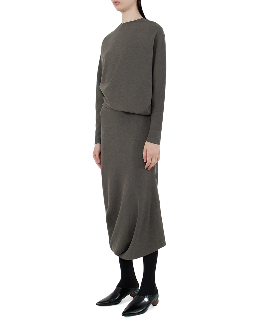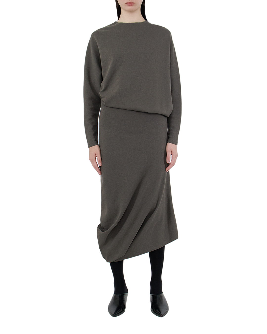 Это изысканное платье воплощает в себе соединение минимализма и элегантности, что позволяет создать утончённый и современный образ. Выполненное из мягкой ткани, оно обеспечивает комфорт при носке, создавая эффект невесомости и изящества. Лаконичный крой с длинными рукавами и скромным округлым вырезом подчёркивает естественную красоту силуэта, не отвлекая внимание от главного — вашего стиля. Свободно ниспадающий верх создает мягкую драпировку, добавляя динамичность и текучесть в образ. Элегантная длина миди завершает образ, оставаясь универсальным вариантом для разнообразных случаев и сезонов. Мягкие складки на юбке придают изделию движение и глубину, добавляя нотку непринуждённости и лёгкости. Платье идеально комбинируется с различными аксессуарами, позволяя вам создать как повседневный, так и вечерний наряд. Это платье станет превосходным выбором для тех, кто ценит стильную простоту и безупречное качество.