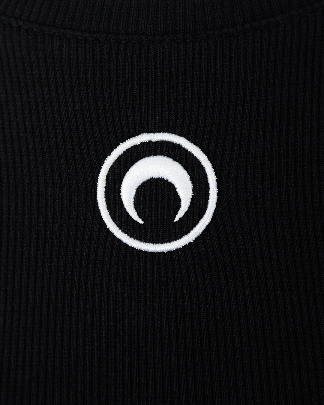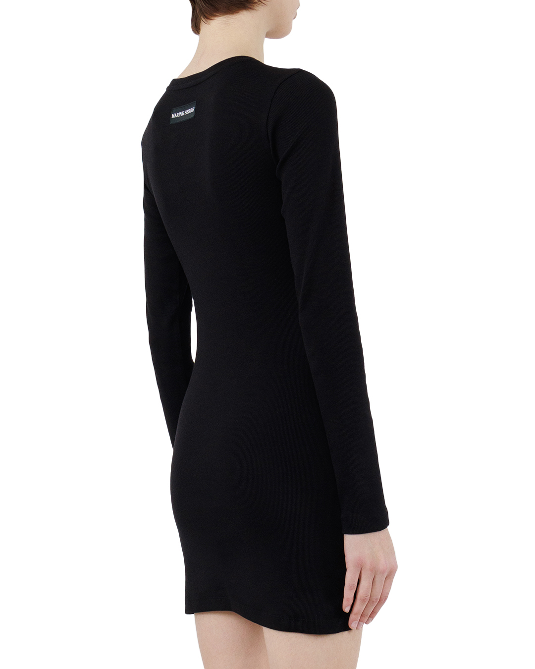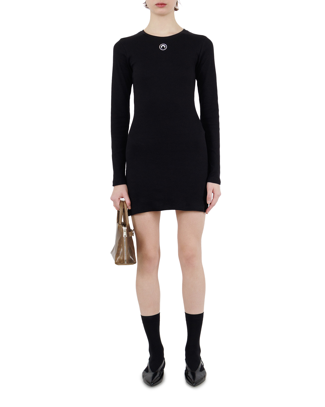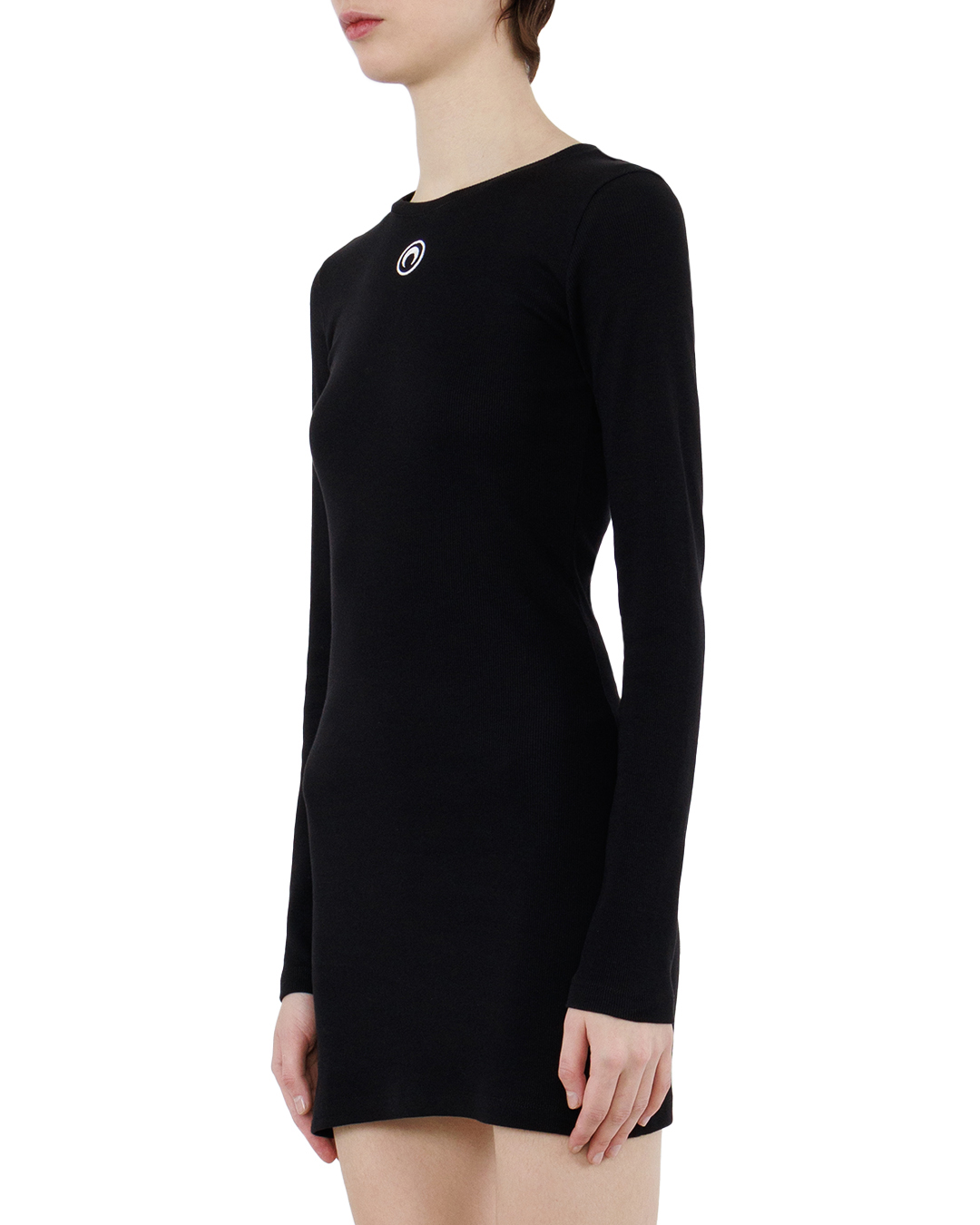 Это платье — квинтэссенция утонченного минимализма и элегантности. Изготовленное из высококачественного трикотажа, оно обтекает фигуру, создавая безупречный и соблазнительный силуэт. Глубокий черный цвет действует как идеальный фон, подчеркивающий каждую линию и детали изделия. Центральным акцентом служит тонкая вышивка логотипа в области декольте, добавляющая изысканный и стильный штрих. Круглый вырез горловины и длинные рукава обеспечивают баланс между классическим и современным стилем, дополняя лаконичный образ. Этот крой позволяет платью легко интегрироваться в различные образы — от делового до вечернего. Благодаря универсальному дизайну и акценту на детали, это платье станет незаменимым элементом гардероба для тех, кто ценит элегантность и индивидуальность.