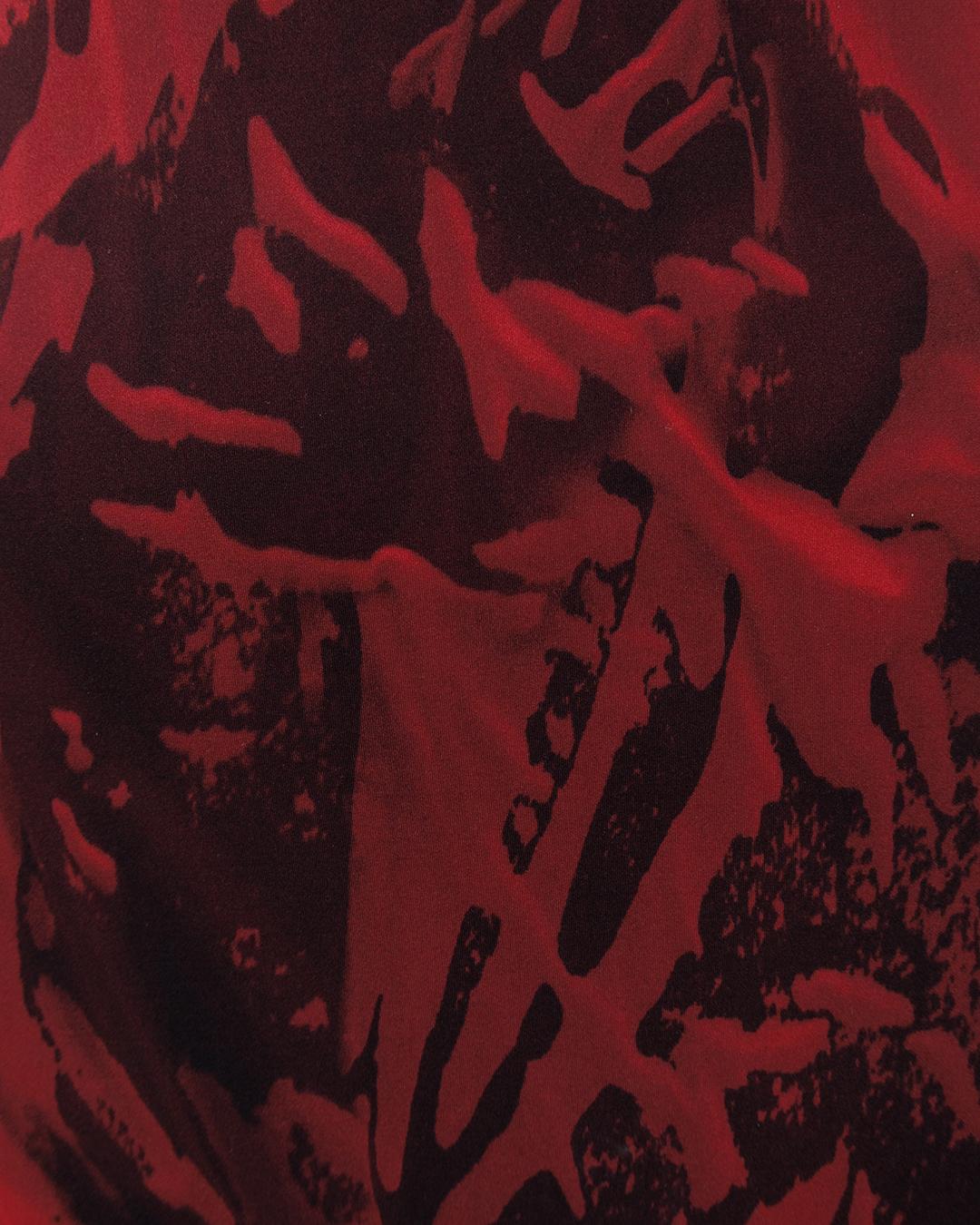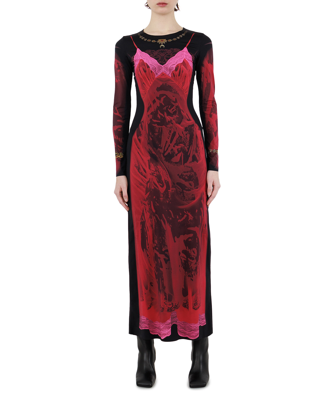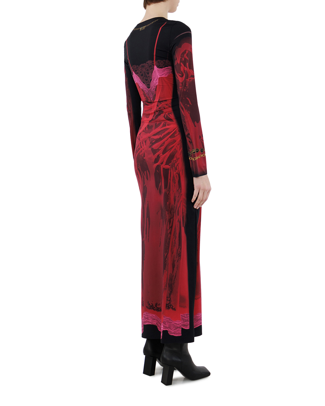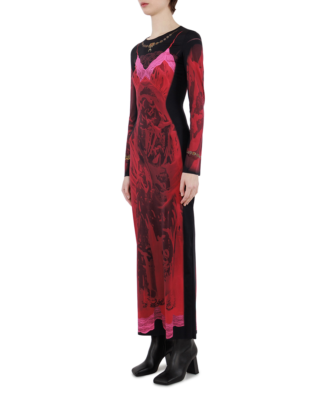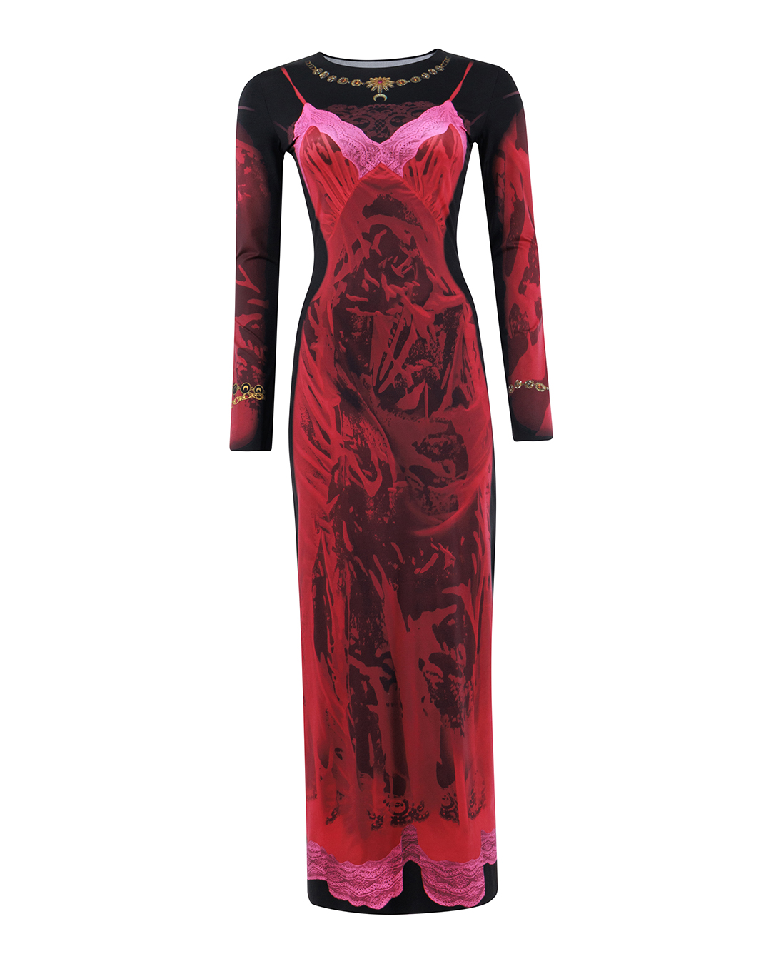 Это платье — впечатляющее произведение модного искусства, полностью украшенное завораживающим принтом. Ткань платья струится, создавая элегантный силуэт, подчеркивающий женственность и элегантность. Принт, выполненный в насыщенных красных оттенках, создает эффект динамики и глубины, притягивая взгляд и делая изделие центром внимания. Его художественный характер превращает платье в уникальное полотно, на котором оживают замысловатые мотивы. Ложные детали, такие как розовые кружевные вставки и декоративные элементы, искусно воспроизведены с помощью принта, добавляя особого шарма и визуальной многослойности. Узоры на рукавах и вырезе горловины демонстрируют детальное внимание к каждой линии и форме. Это платье идеально подходит для тех, кто ищет нечто уникальное и выразительное, чтобы подчеркнуть свой индивидуальный стиль и уверенность.