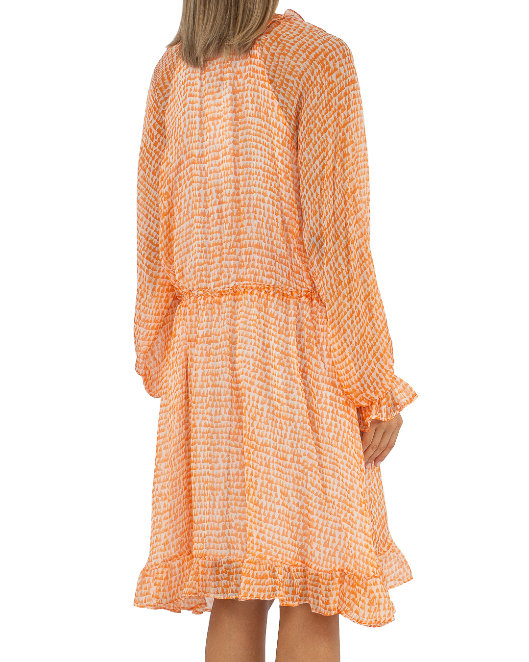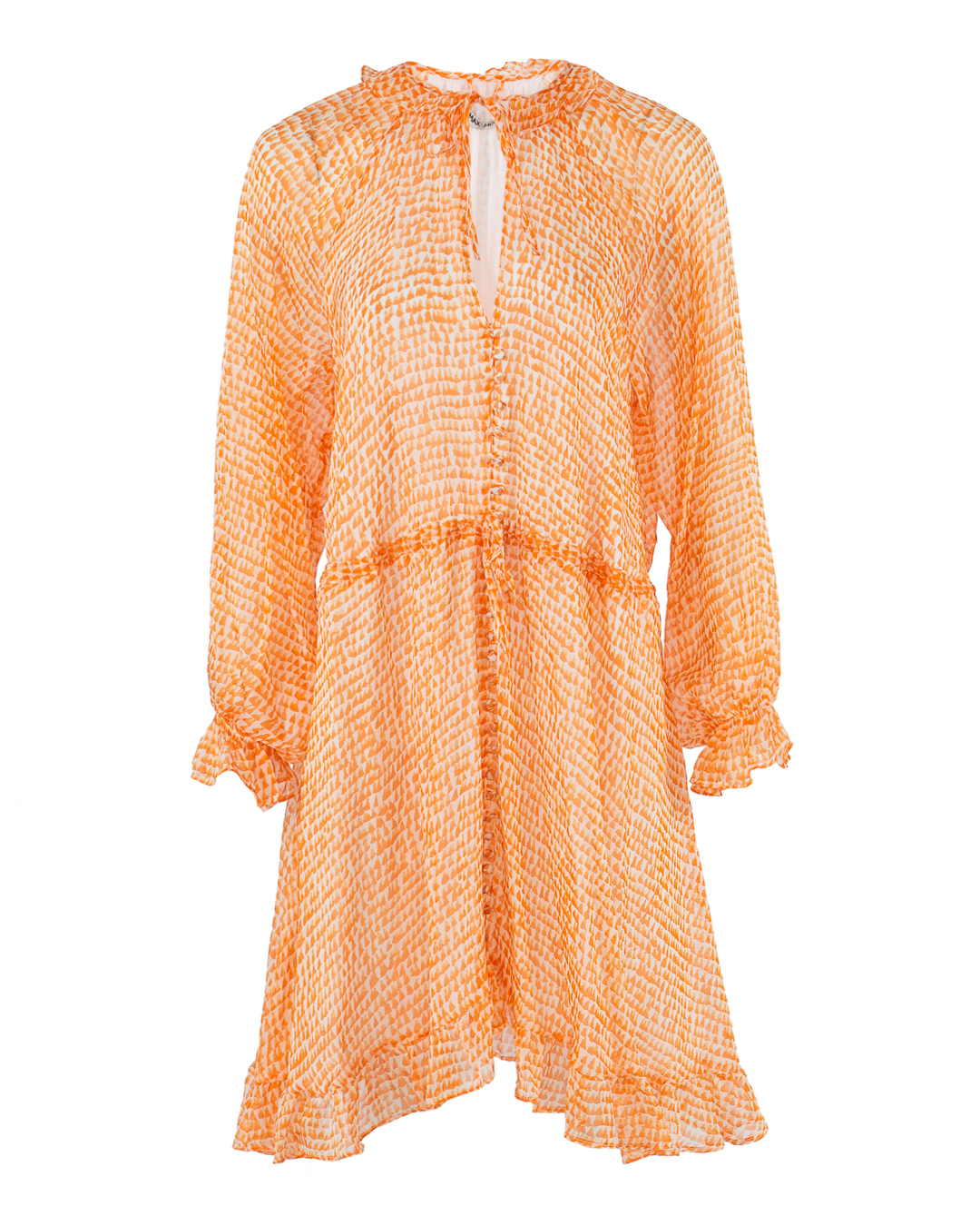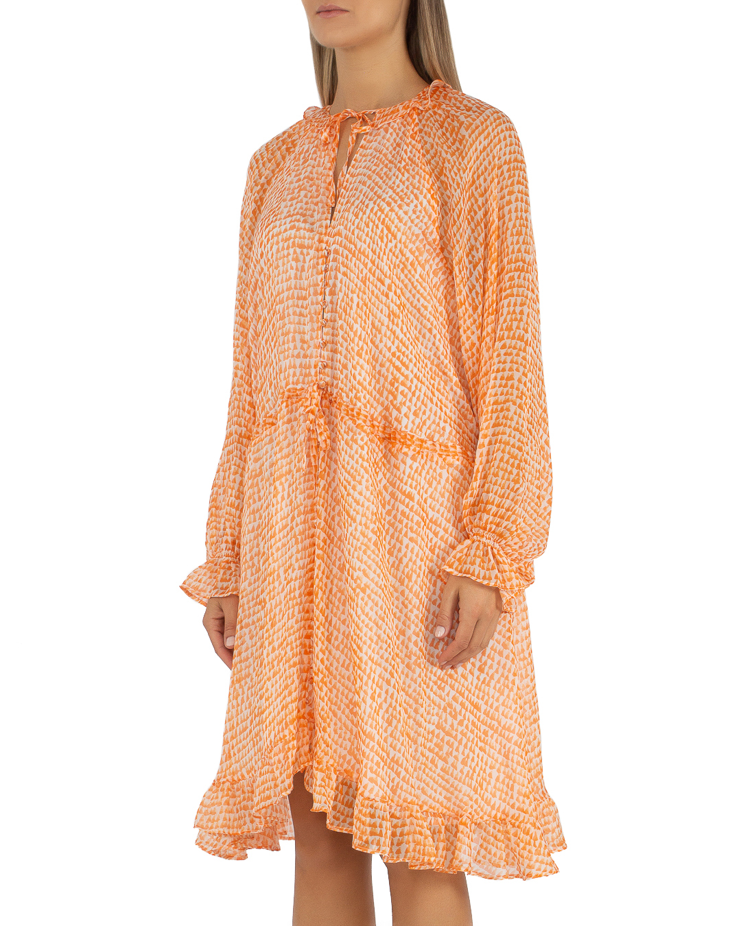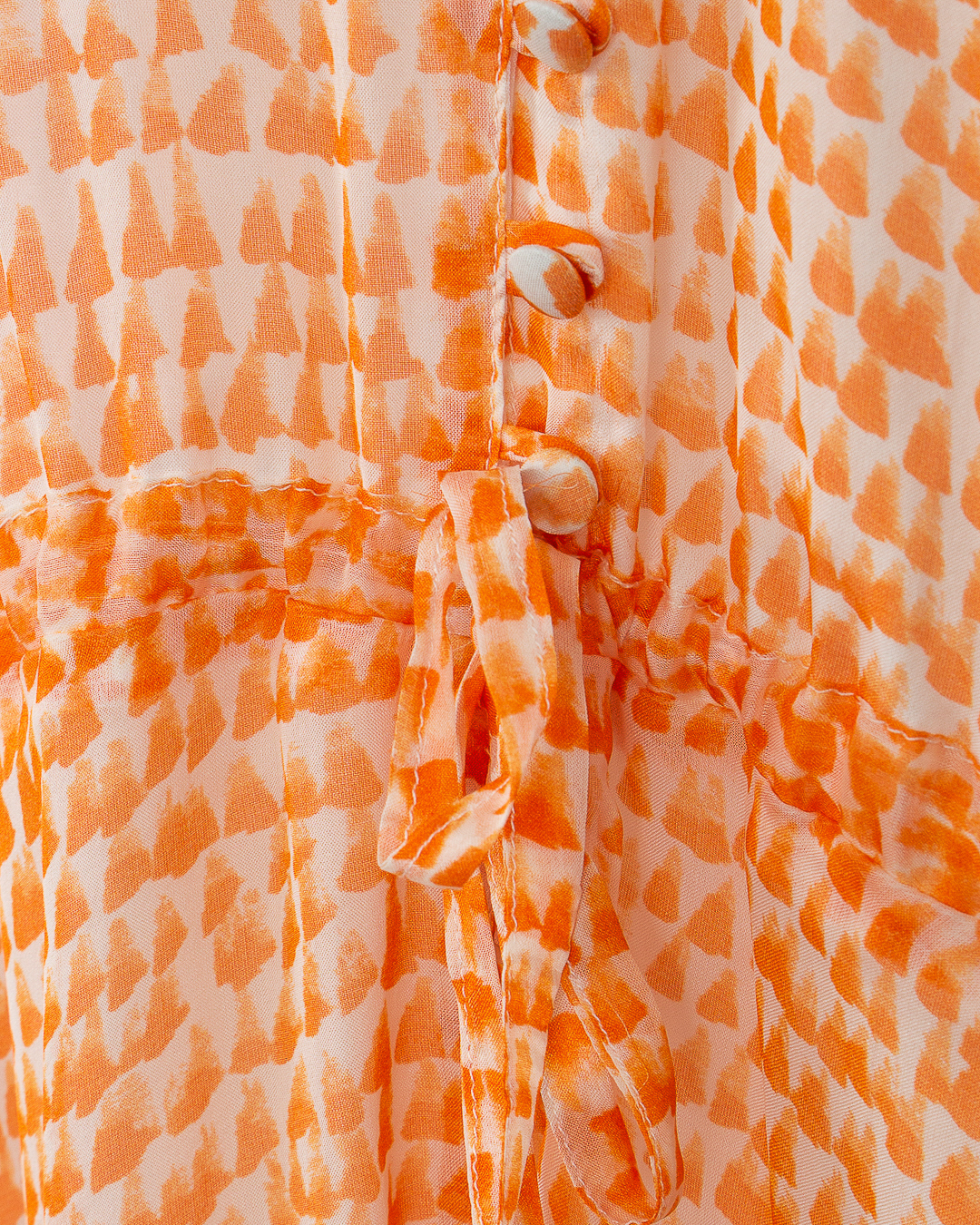 Платье MAX&MOI сшили из тонкого шелка с принтом. Модель прямого свободного силуэта с застежкой на пуговицы и завязками по линии талии.