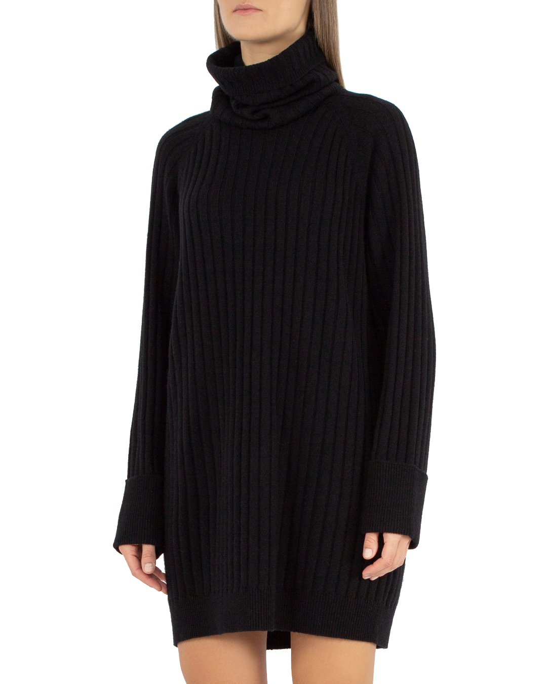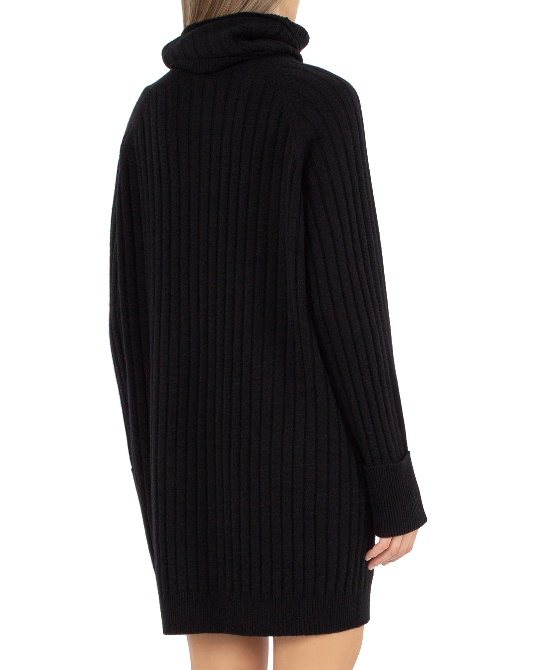 Платье MAX&MOI из мягкой шерсти с добавлением кашемира черного цвета. Модель прямого силуэта длины мини в крупный рубчик с высоким воротником.