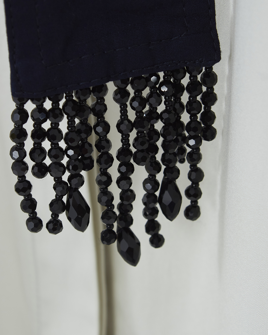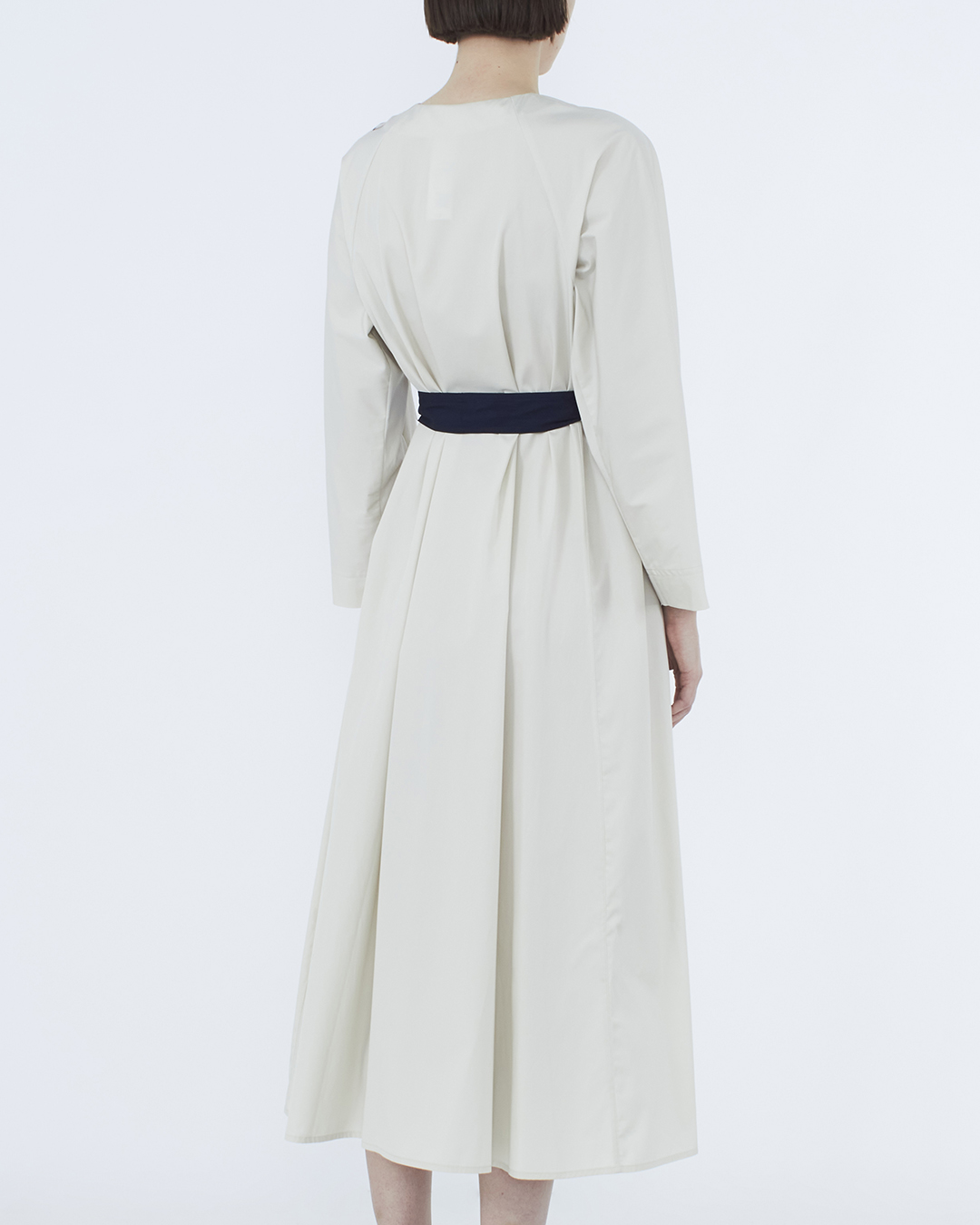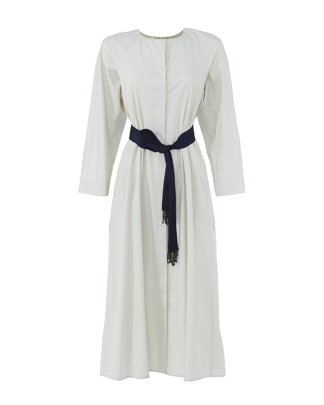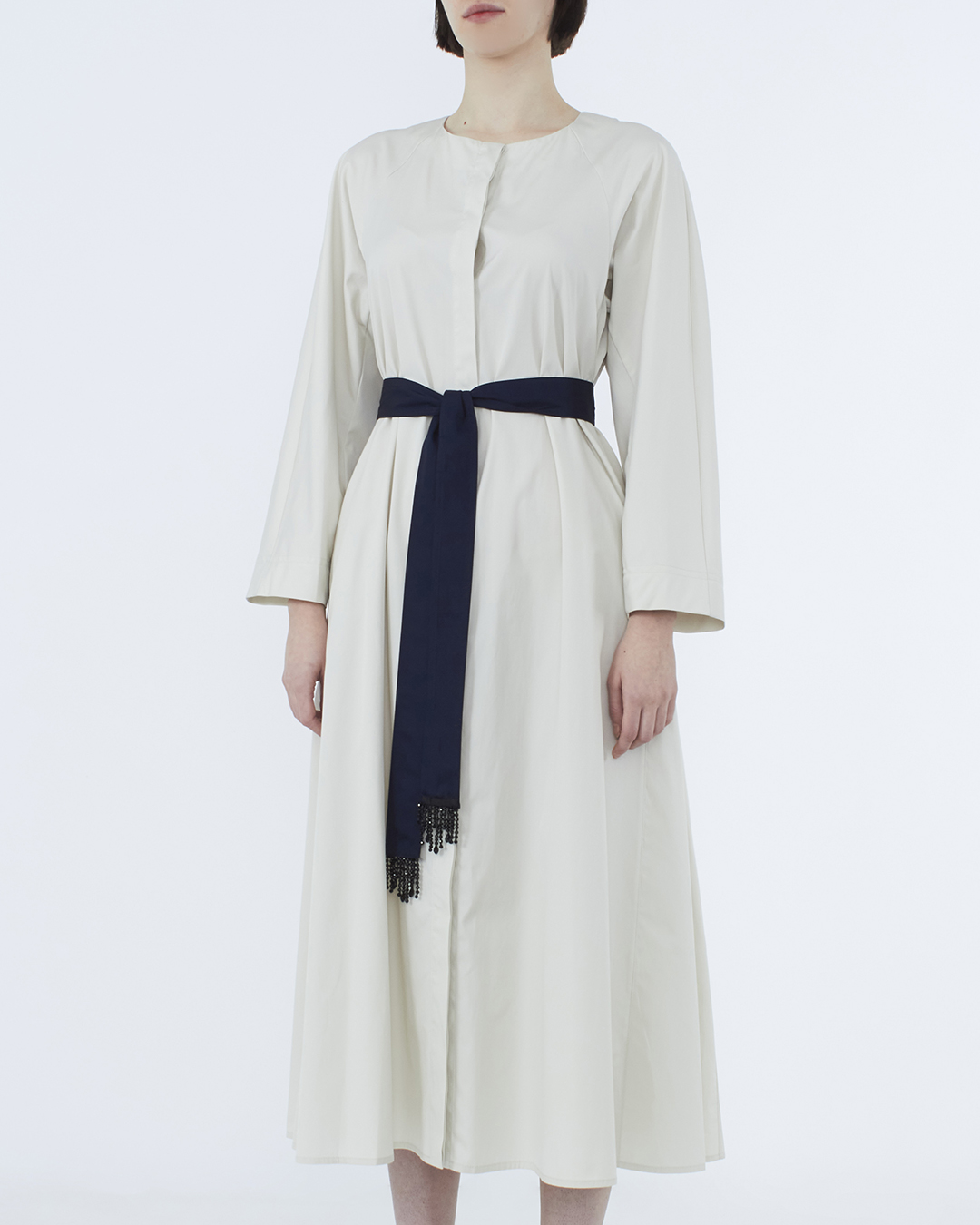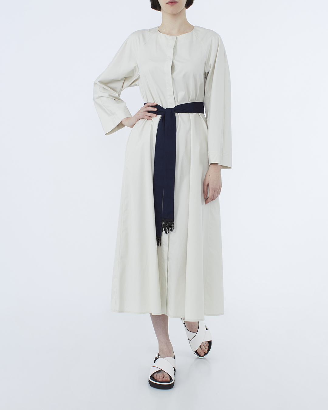 Платье Max Mara сшили из хлопка молочного оттенка. Модель длины макси лаконичного кроя с круглой линией выреза. Платье дополнено контрастным поясом с отделкой стеклярусом.