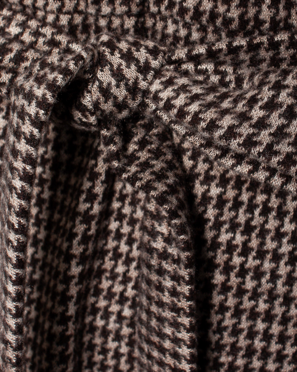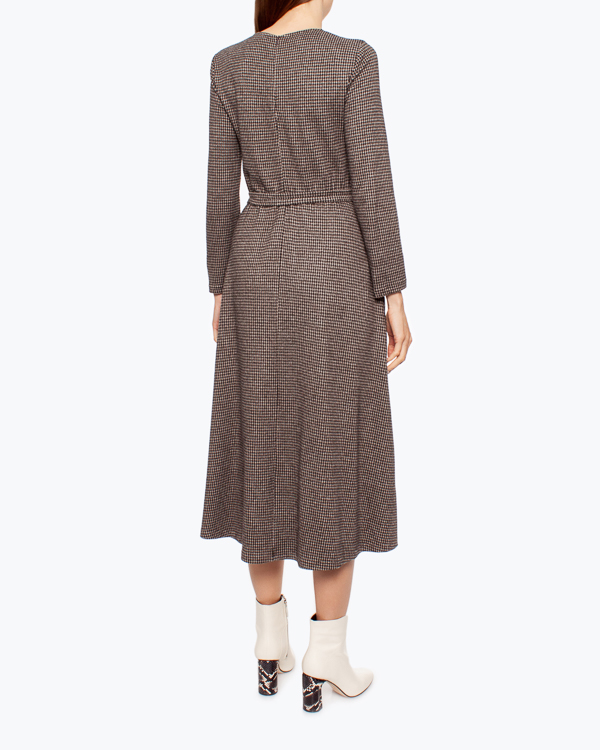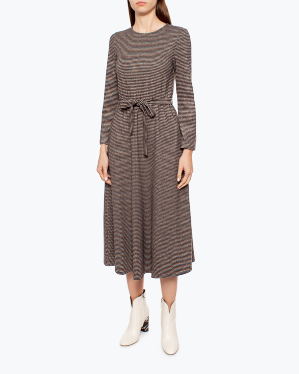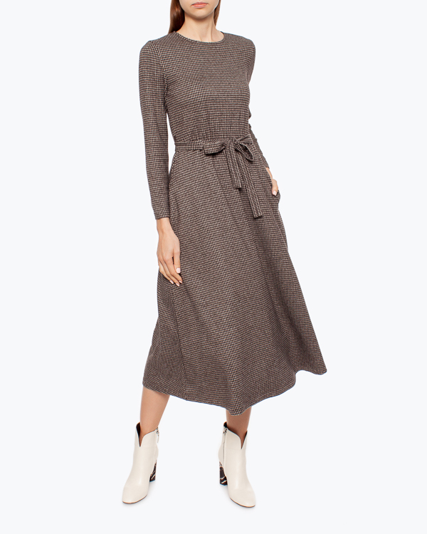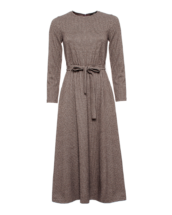 Платье из мягкой викозы с узором. Модель приталенного силуэта длины миди. Застежка на потайную молнию на спине, пояс из основного материала.