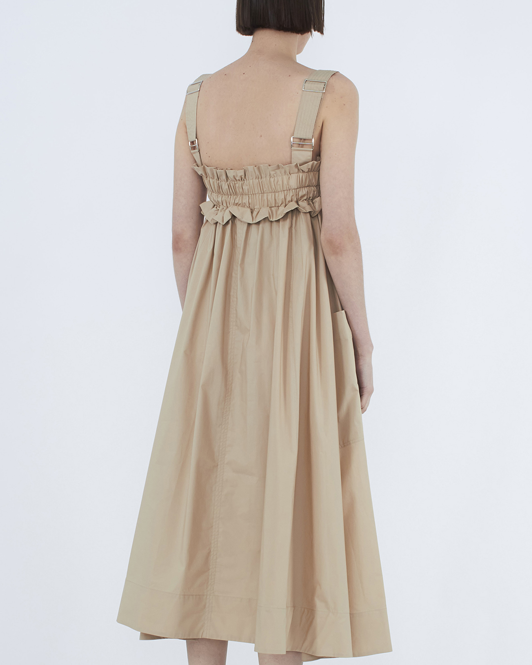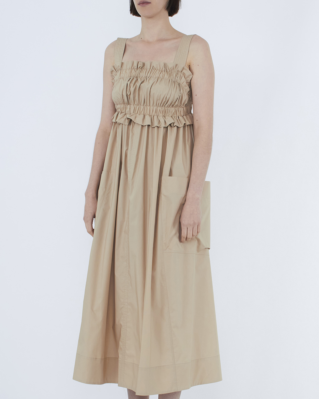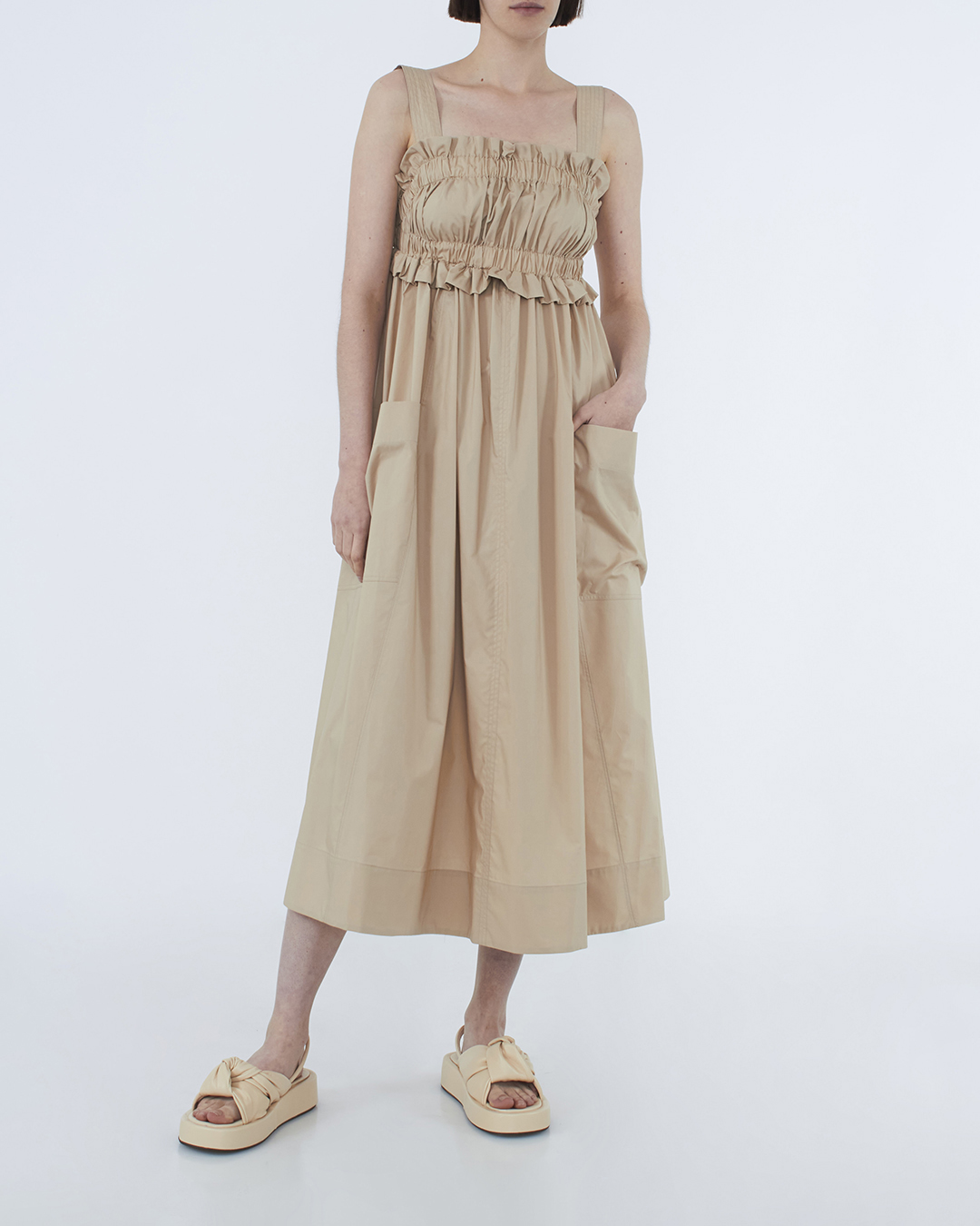Платье MEIMEIJ сшито из хлопка бежевого оттенка. Модель с эластичной линией верха и широкими бретелями дополнена накладными вместительными карманами.