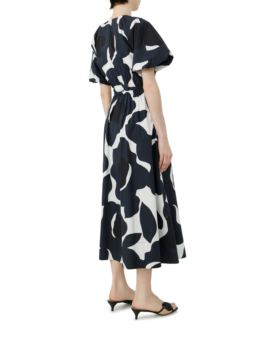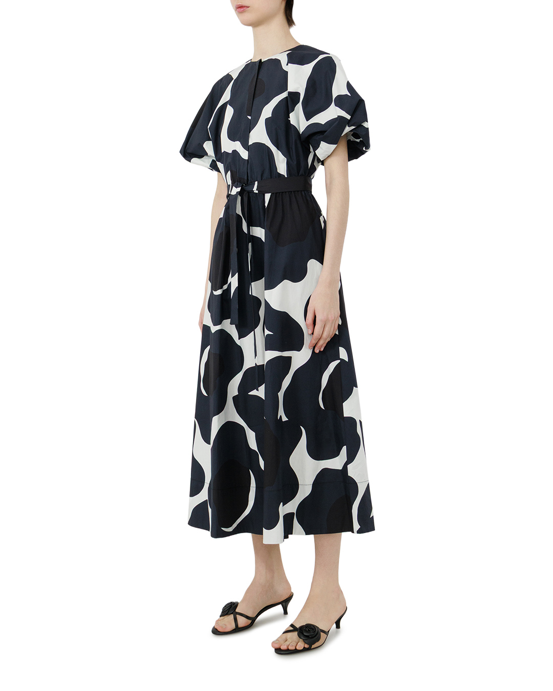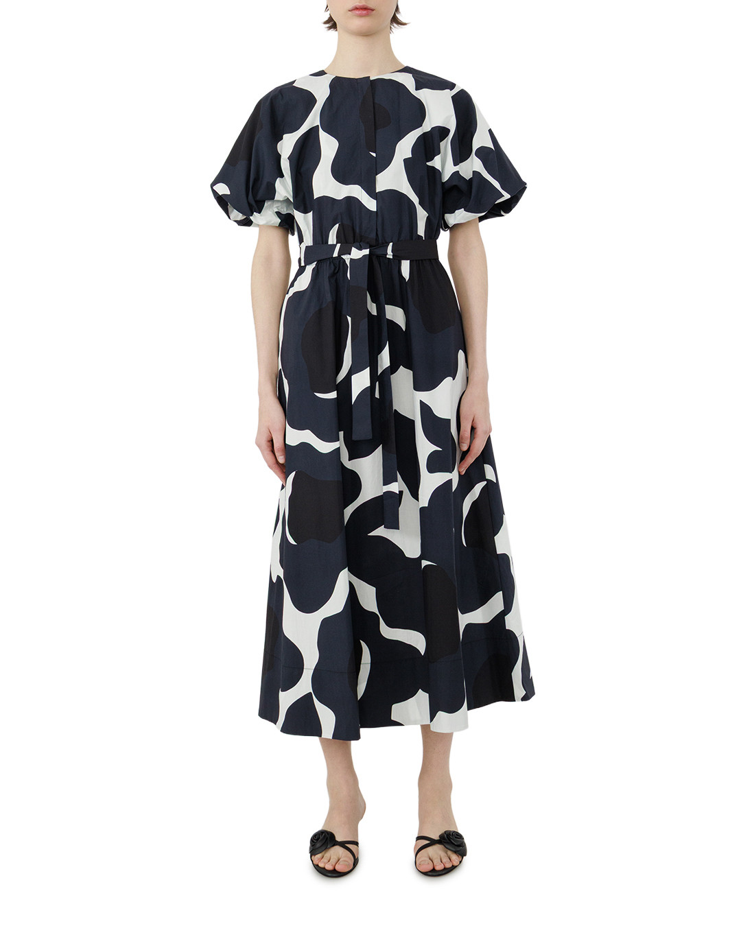 Это платье — гармония графичности и лёгкости. Свободный силуэт с расклёшенной юбкой создаёт ощущение воздушности, а короткие рукава-крылышки добавляют игривости. Контрастный чёрно-белый принт с абстрактными формами превращает вещь в выразительный арт-объект, где каждый элемент узора работает на динамику образа. Пояс-завязка подчёркивает талию, мягко структурируя силуэт и балансируя между расслабленностью и собранностью. Сочетание лаконичного кроя и смелого рисунка делает платье одновременно стильным и универсальным — оно легко станет центром любого образа.