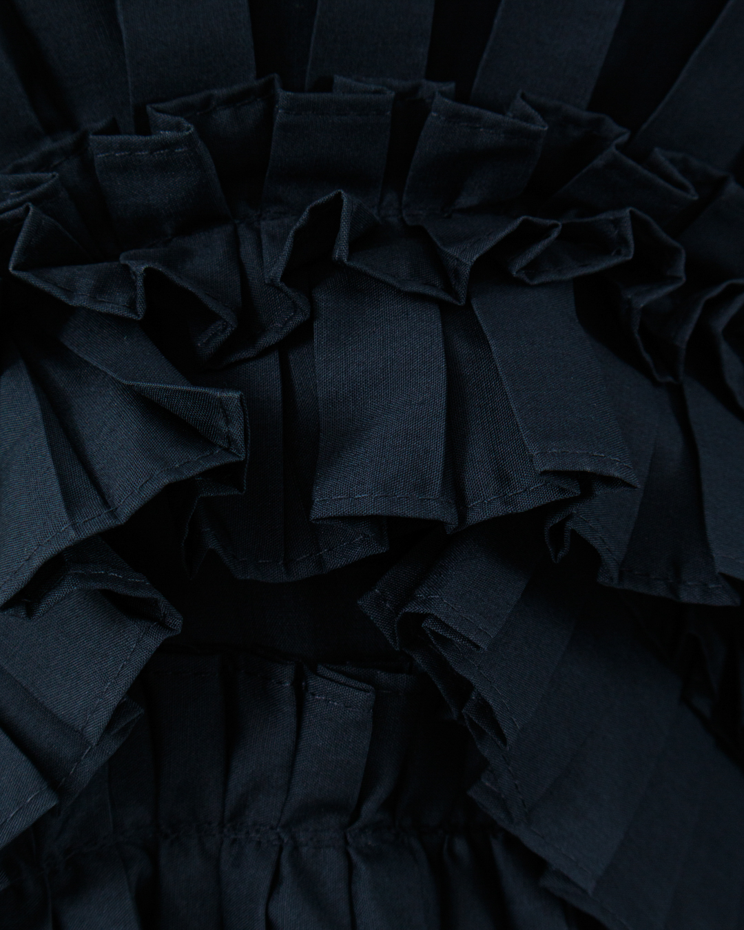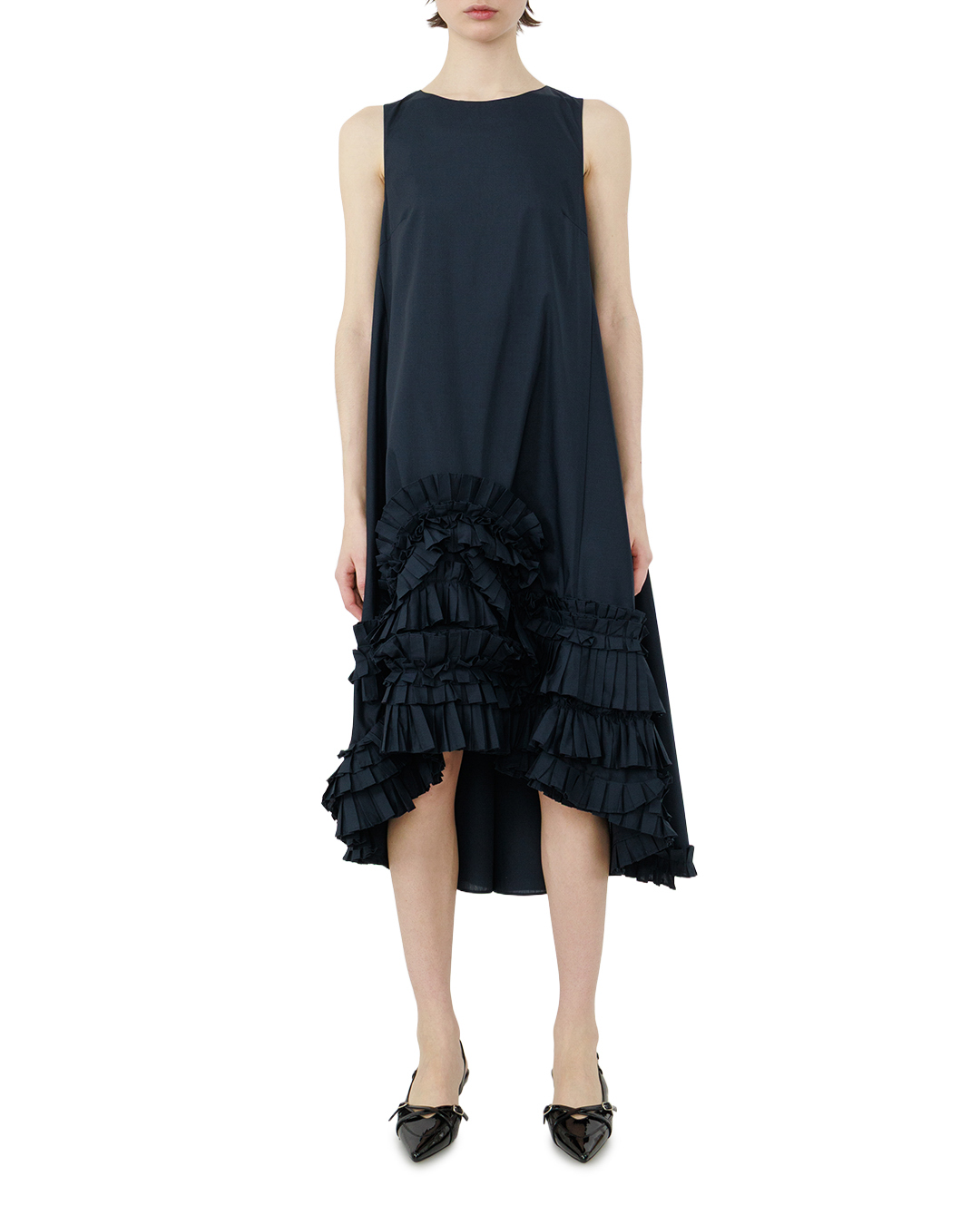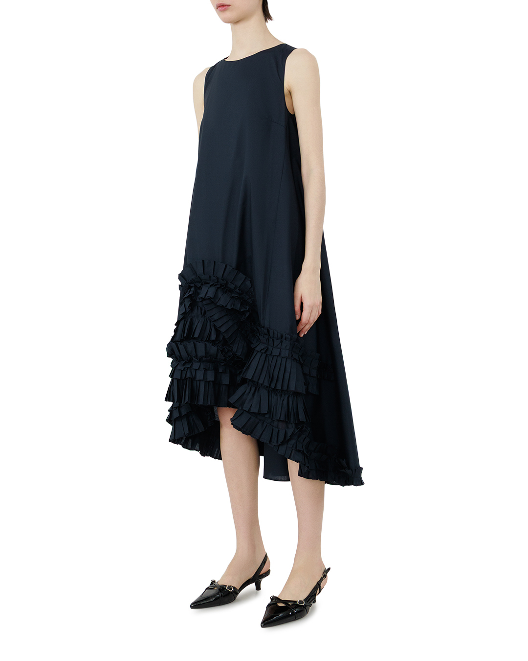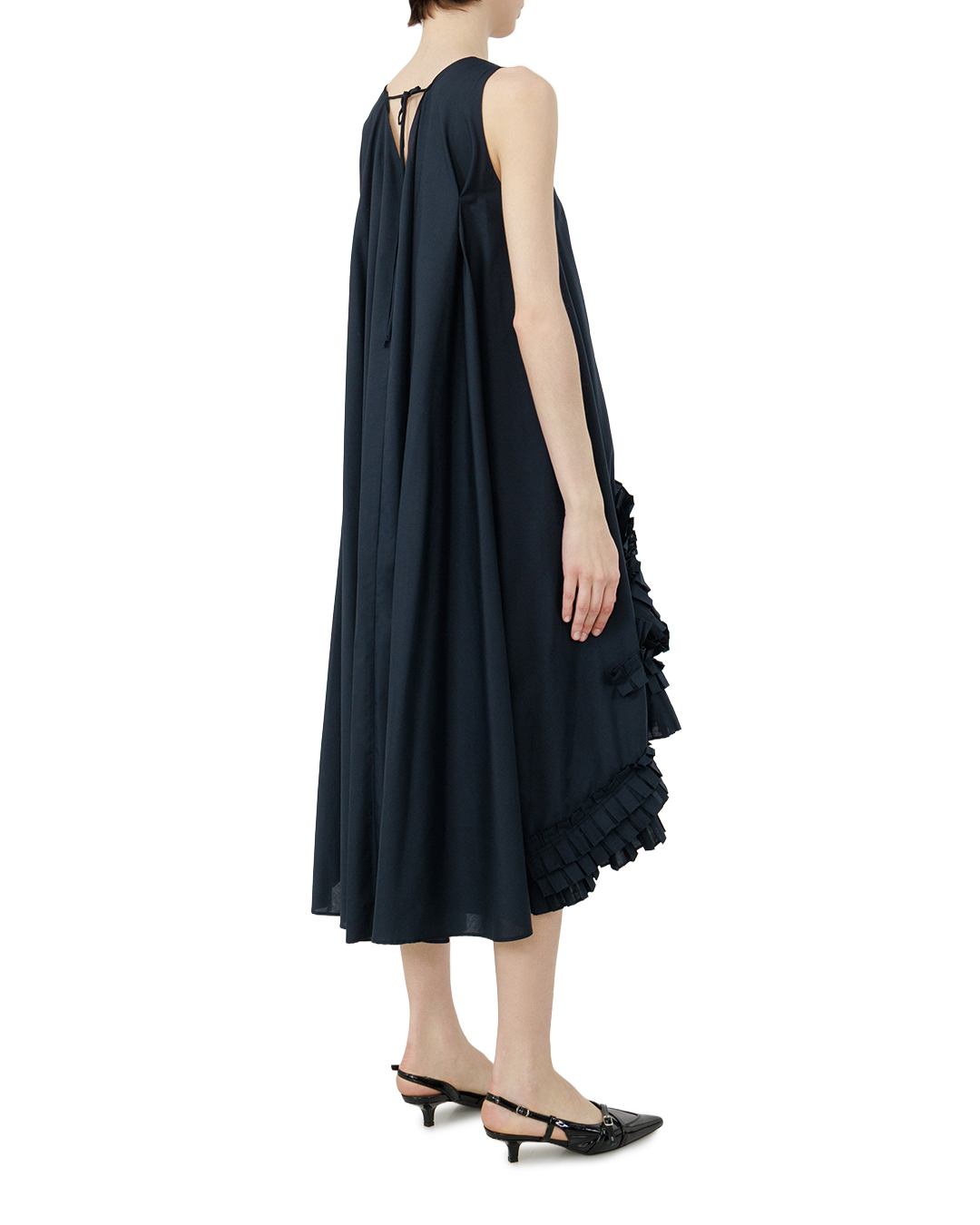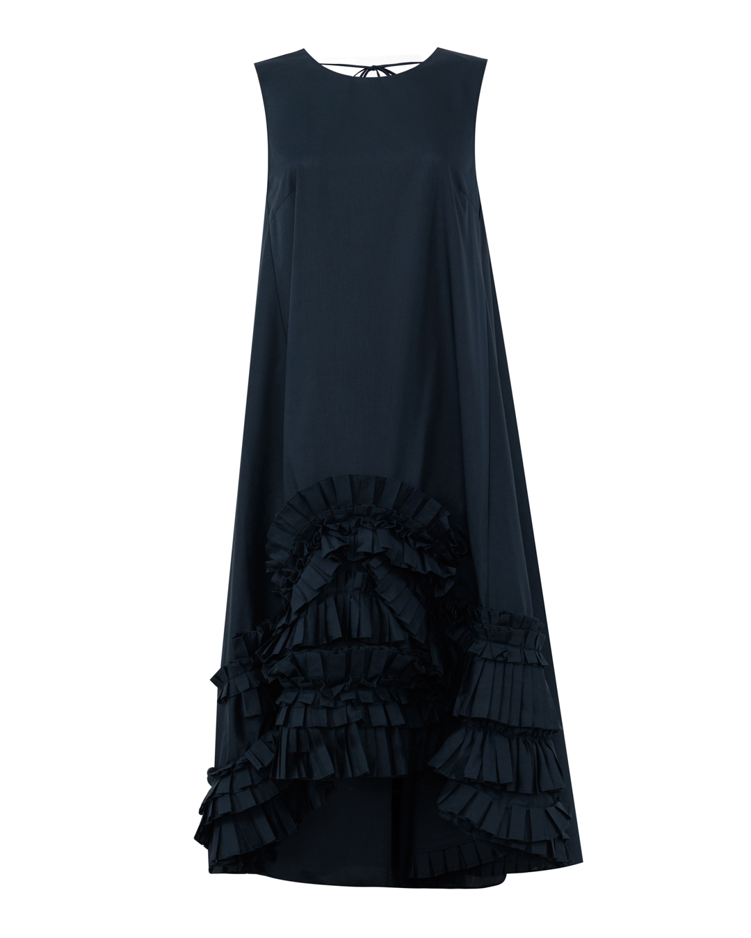 Это платье — олицетворение лаконичной элегантности. Силуэт А-образного кроя мягко подчёркивает фигуру, а пояс, завязанный бантом, создаёт выразительный акцент на талии. Отсутствие рукавов придаёт образу лёгкость и свободу, а округлый вырез горловины добавляет сдержанной грации. Плавные драпировки по линии талии формируют деликатный объём, усиливая женственность силуэта. Монохромный чёрный цвет делает модель универсальной, а чистота линий подчёркивает утончённость дизайна.