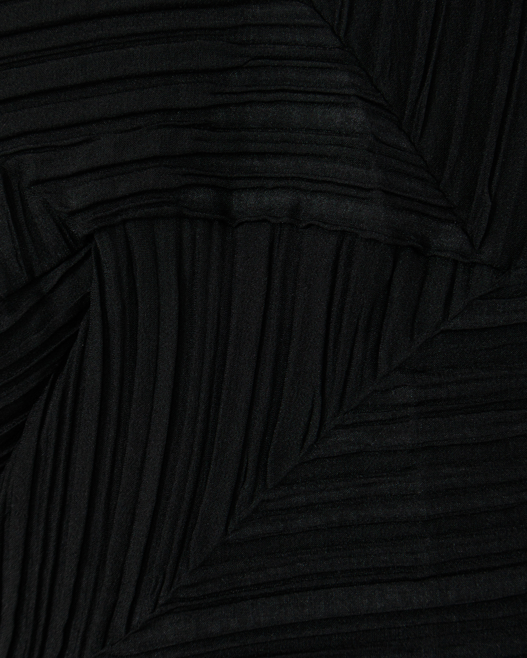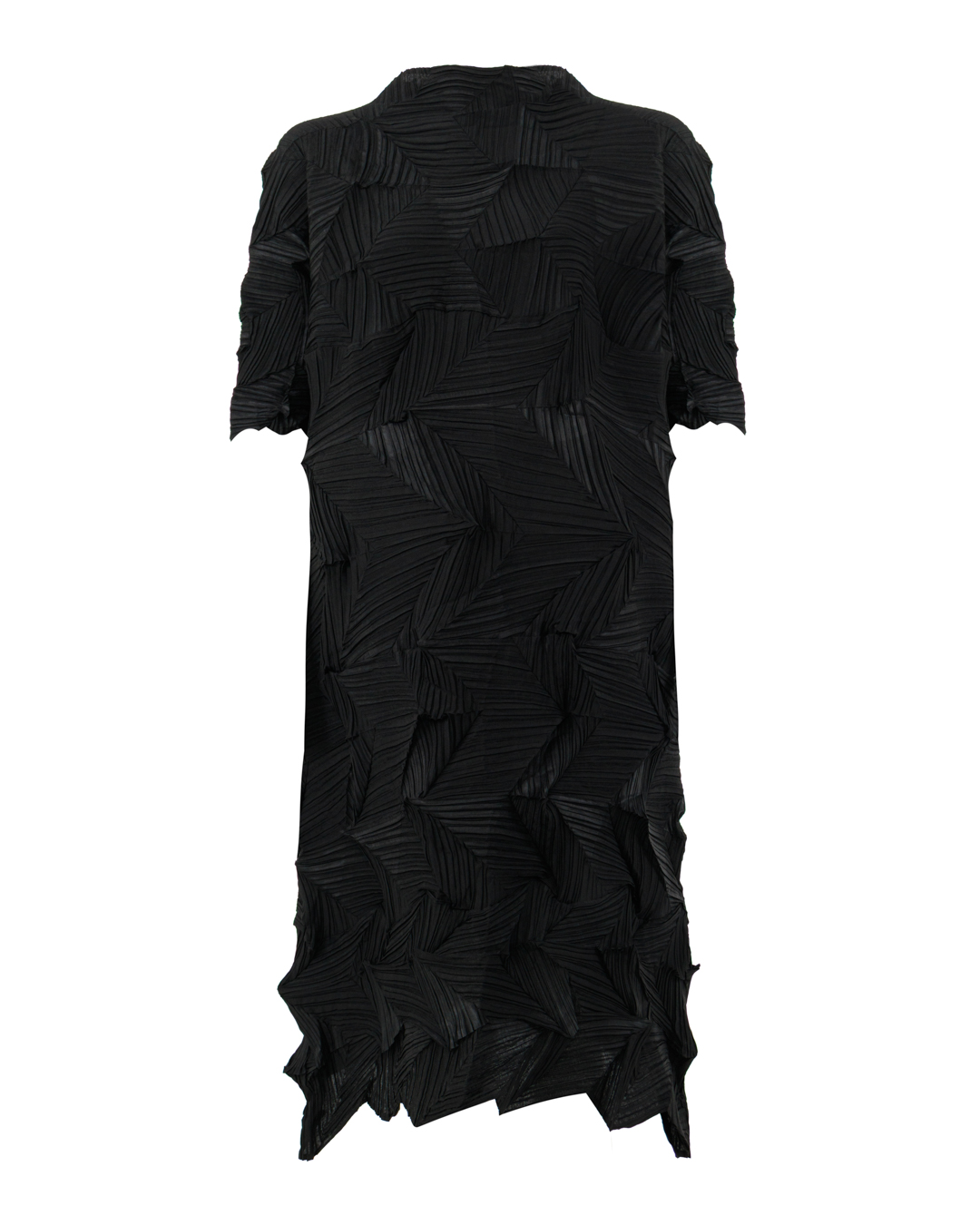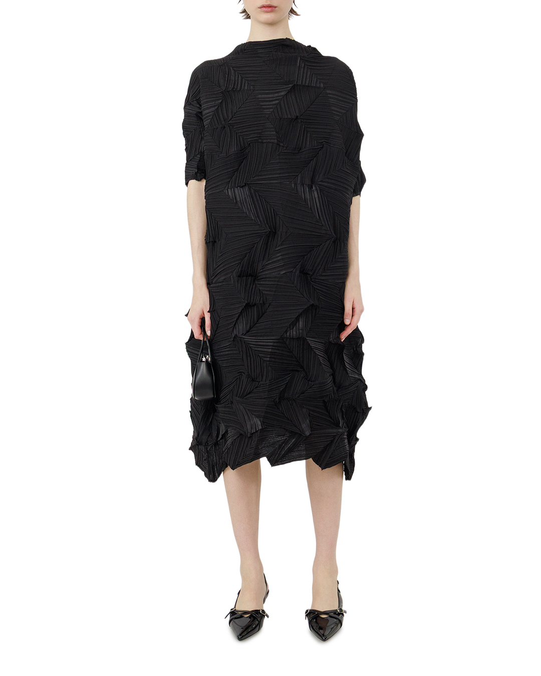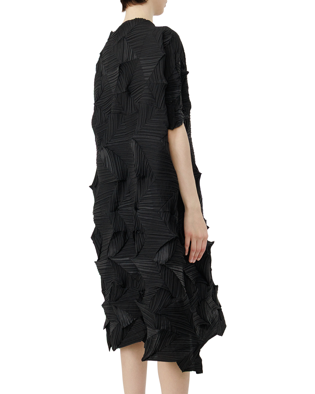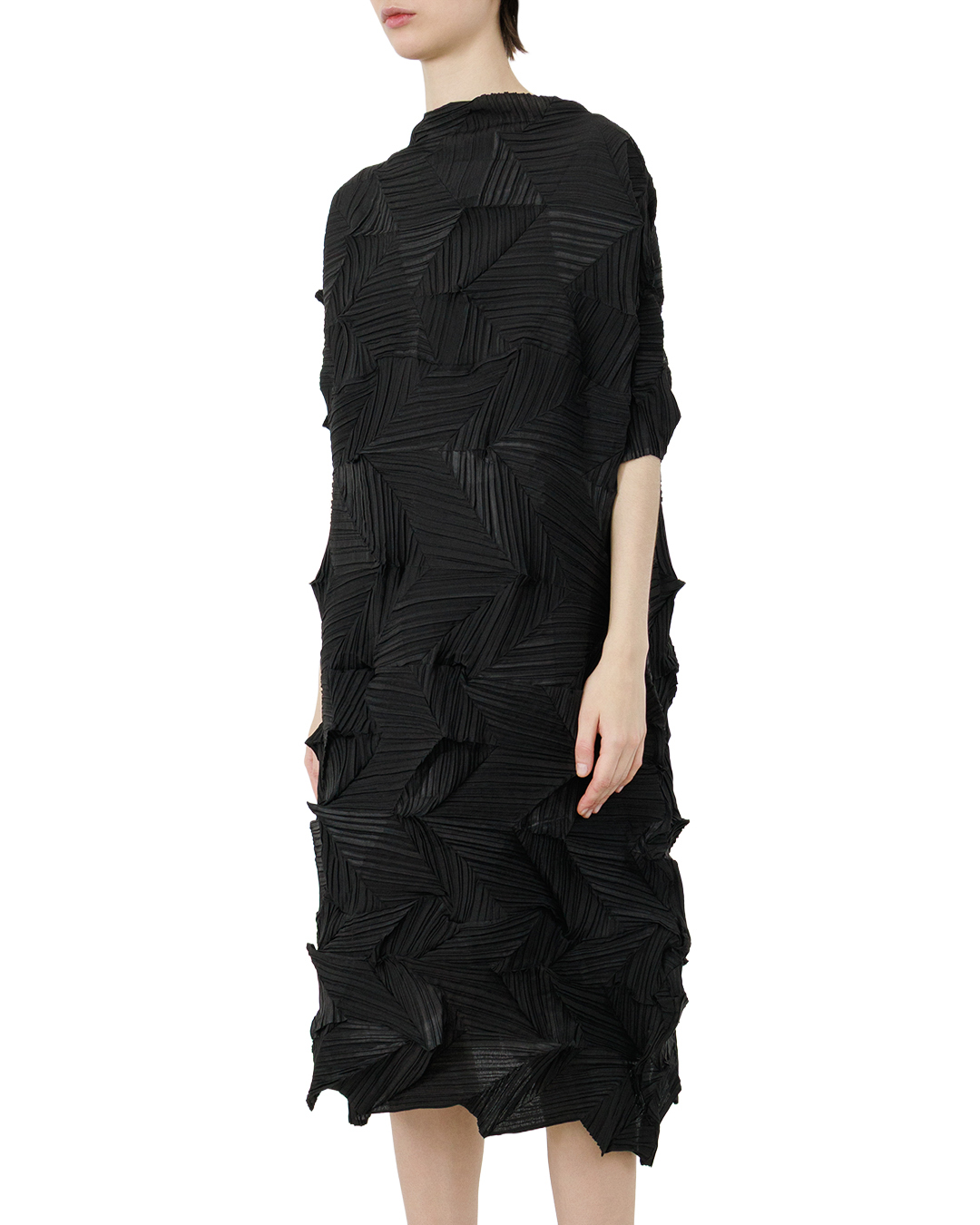 Это платье — воплощение авангардной элегантности. Свободный, слегка удлинённый силуэт дополнен короткими рукавами, что создаёт баланс между строгостью и лёгкостью. Главная изюминка — выразительная фактура ткани с геометрическими складками, напоминающими абстрактный узор: они придают вещи скульптурность и глубину, превращая платье в арт-объект. Асимметричный низ с неровной каймой добавляет динамики, размывая классические каноны кроя. Монохромный чёрный цвет подчёркивает графичность модели, а игра светотени на складках оживляет образ, делая его одновременно загадочным и утончённым.