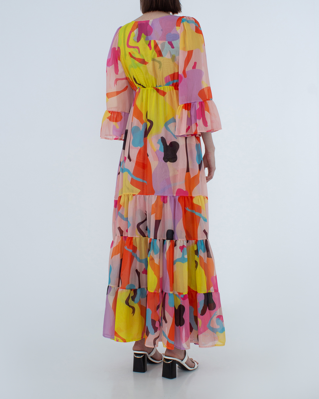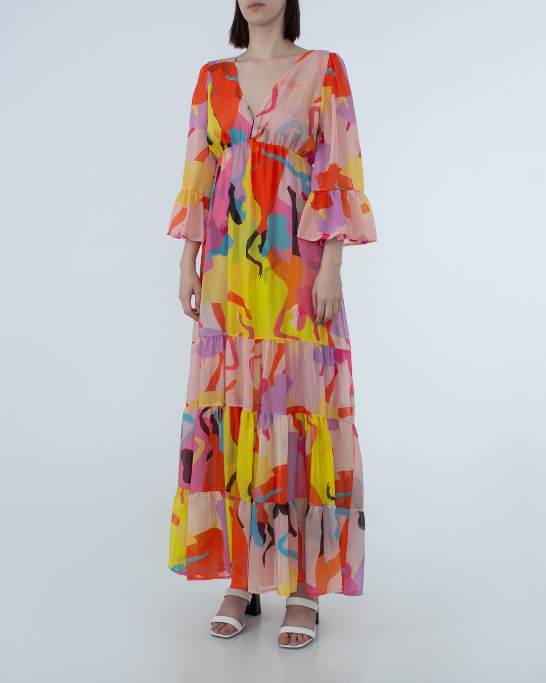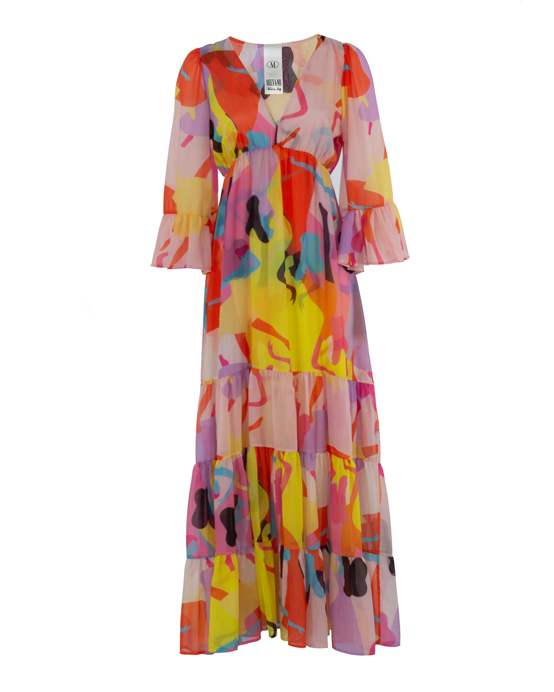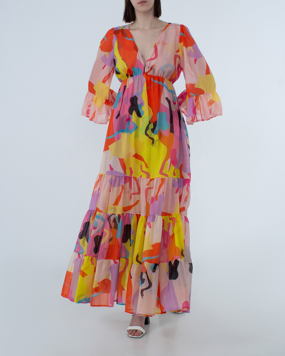 Платье MILVA-MI сшили из тонкого хлопка с ярким абстрактным принтом. Модель длины макси выполнена с отрезной по линии груди и пышной юбкой со сборкой материала. Платье дополняют V-образный вырез и широкие укороченные рукава.