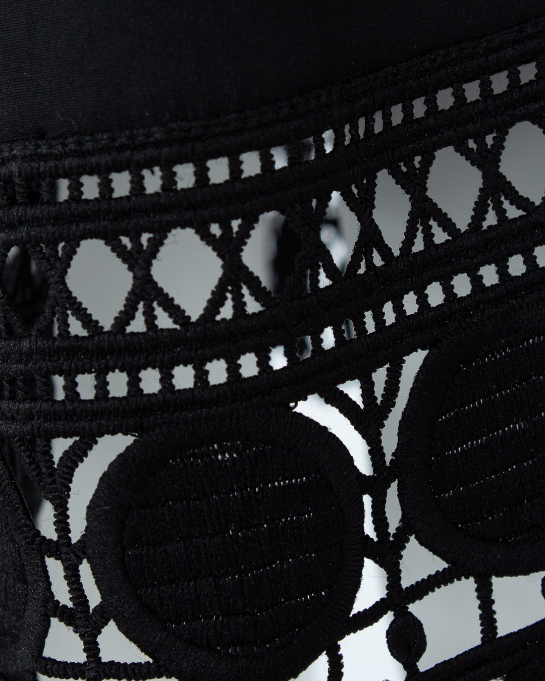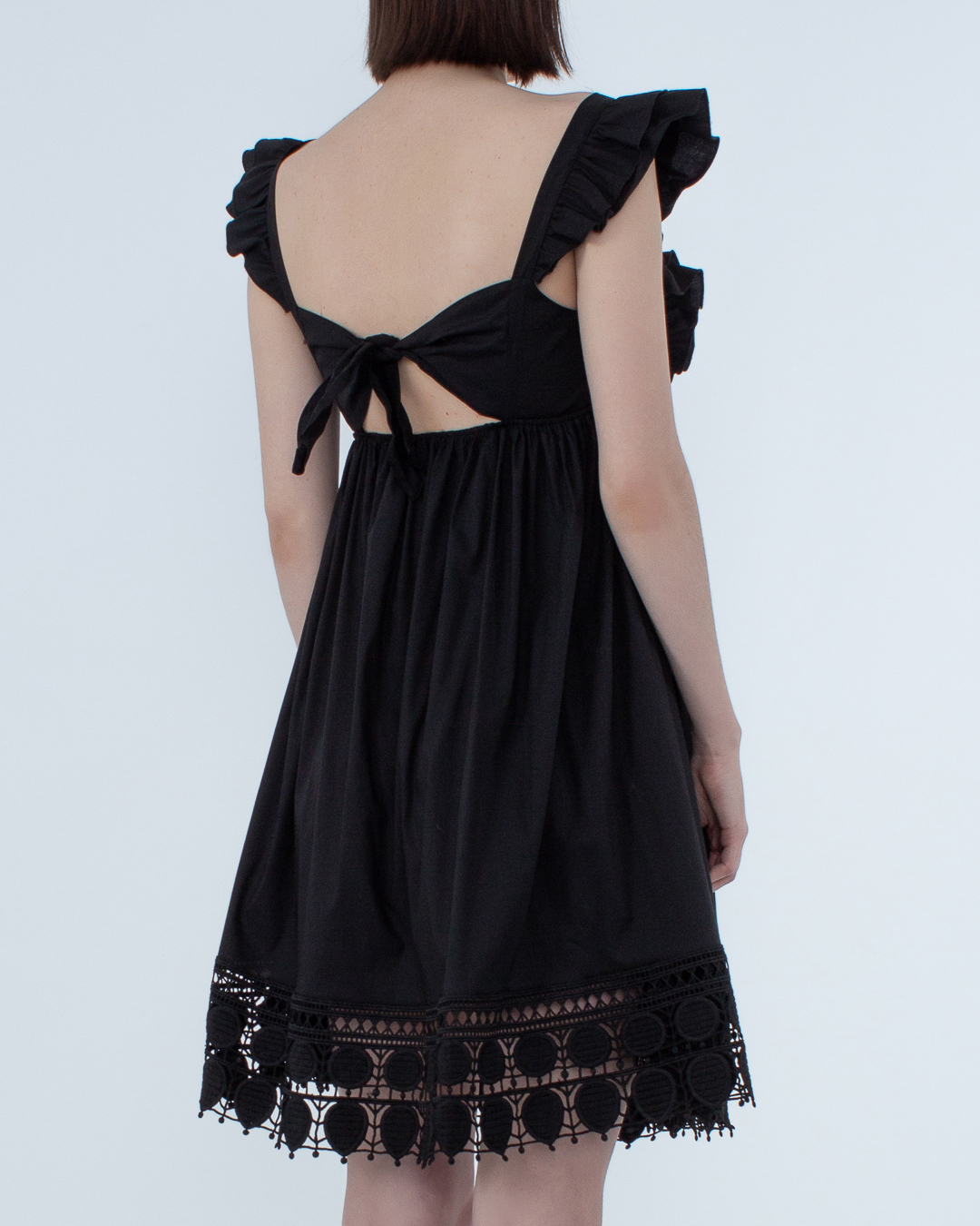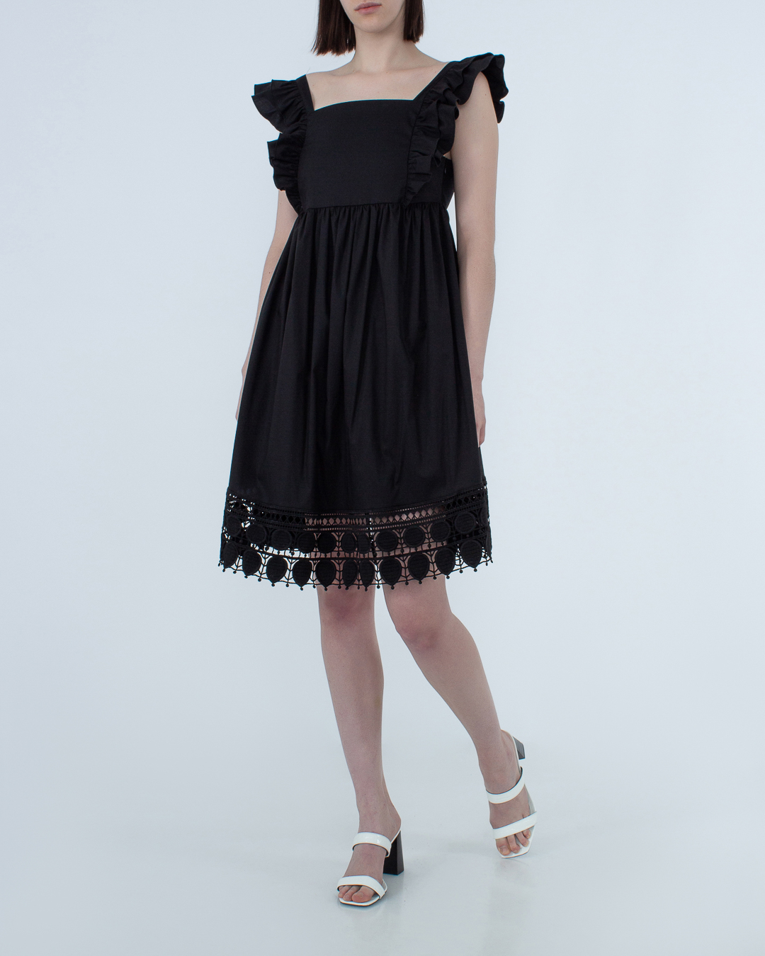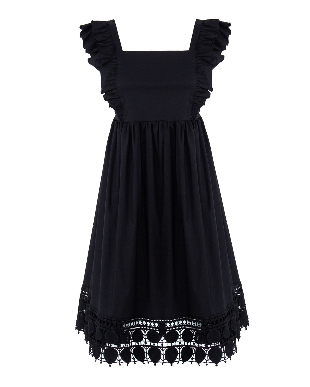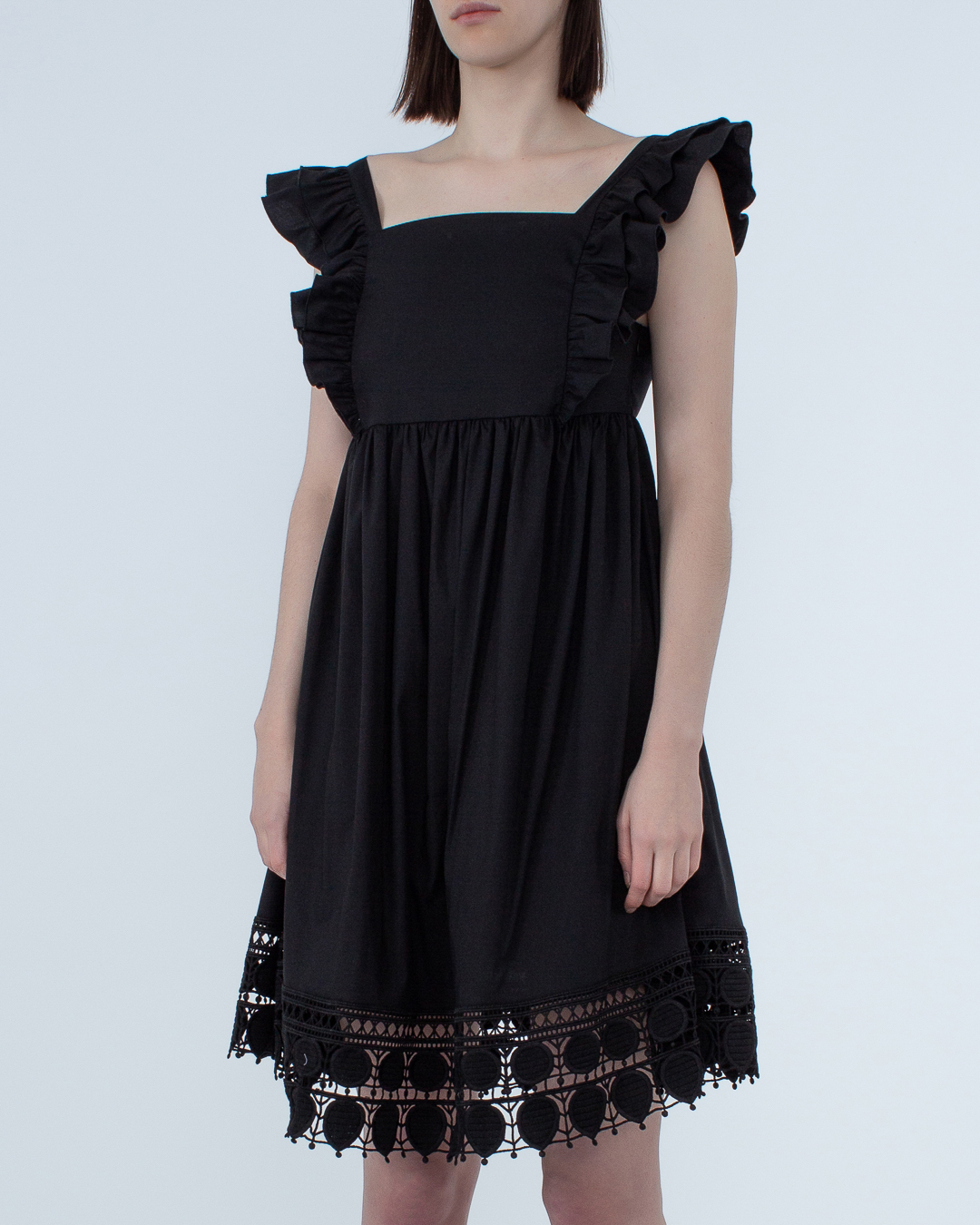 Платье MILVA-MI сшито из хлопка черного цвета. Платье с графичным вырезом и отрезной по линии груди дополнено отделкой складками вдоль широких бретель. Юбка с мелкой сборкой оформлена ажурным шитьем по линии низа.