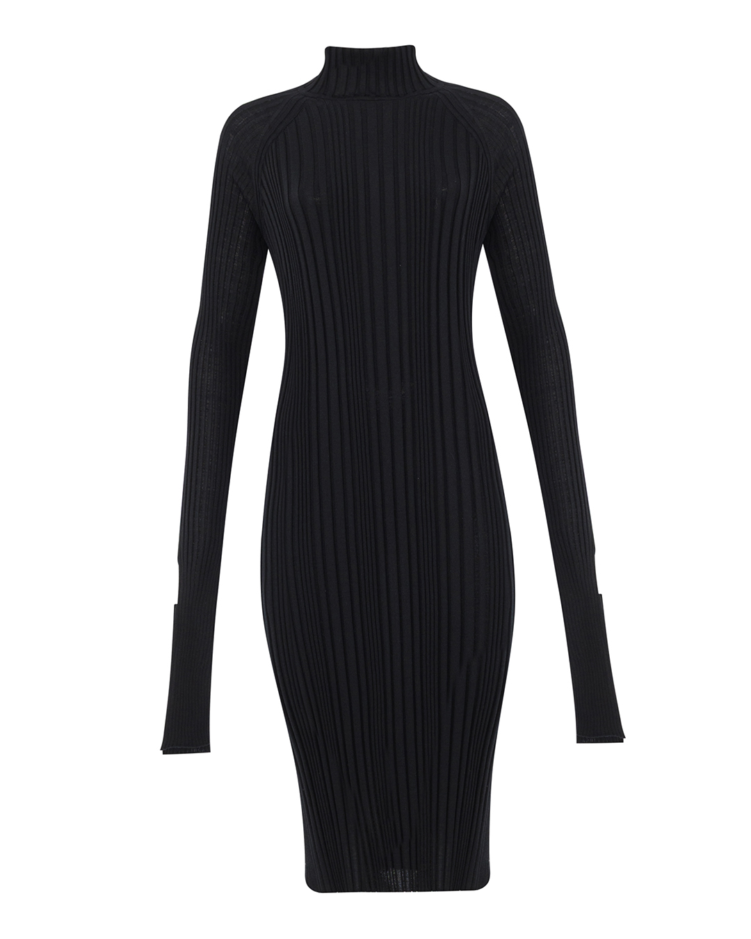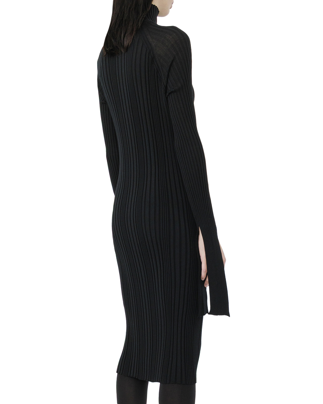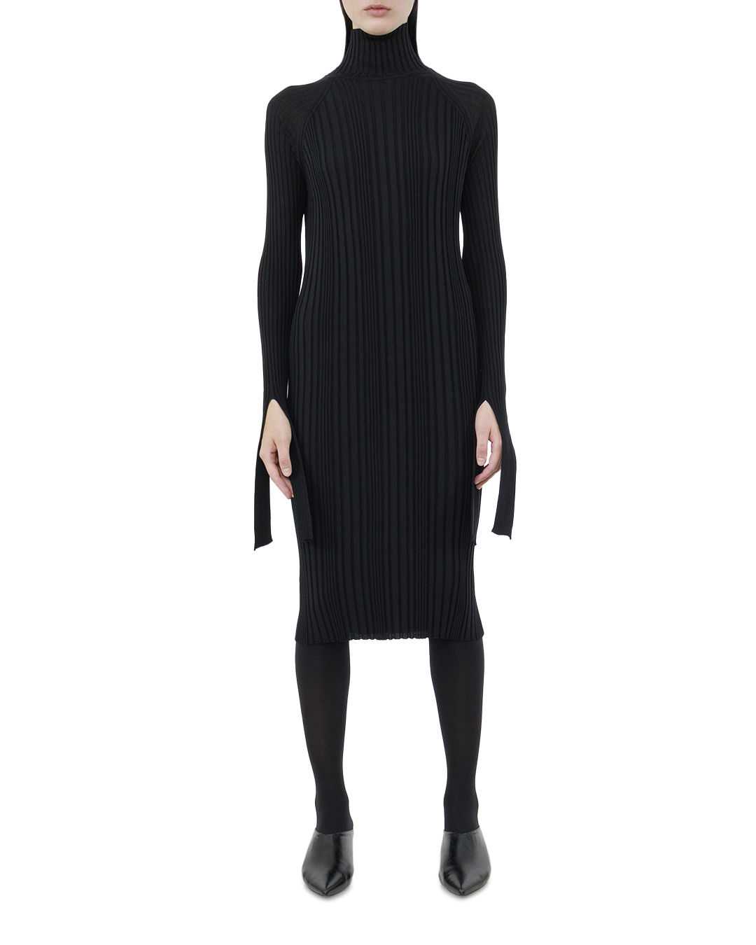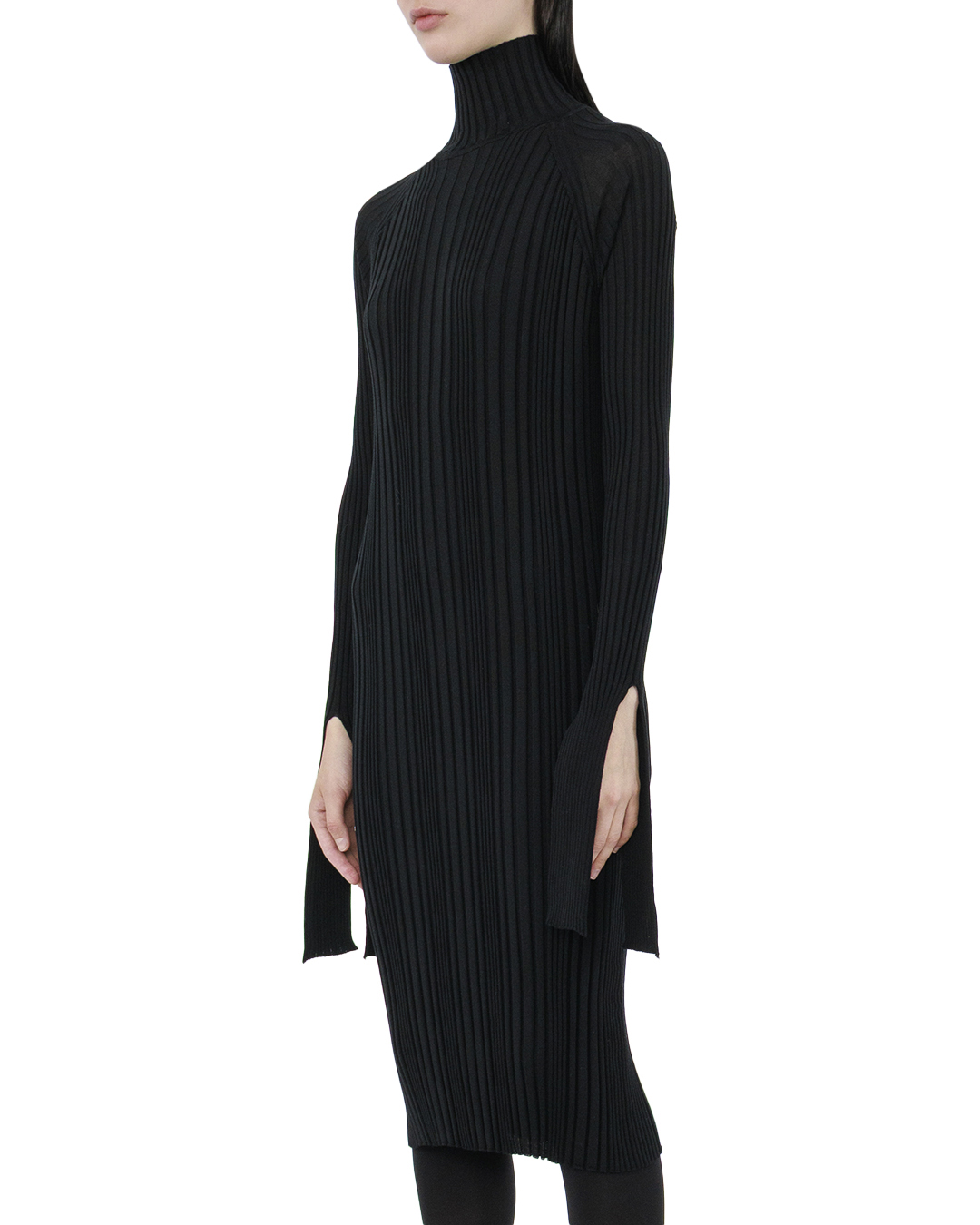 Это платье — воплощение изысканности и современного элегантного стиля. Выполненное из эластичной ткани с ребристой текстурой, оно создает утонченный силуэт, элегантно облегая фигуру и подчеркивая её достоинства. Стильный воротник-стойка добавляет классу и формальности, делая платье идеальным выбором для вечерних мероприятий или деловых встреч. Длинные рукава с актуальной длиной до пальцев добавляют модный акцент и придают образу гармонию и завершенность. Рукава имеют оригинальные разрезы, что придаёт динамику и свежесть классической форме. Платье отличается тщательной проработкой деталей и аккуратной отделкой швов, гарантируя комфорт и уверенность в каждом движении. Это платье легко сочетать с различными аксессуарами, создавая тщательно продуманный и в то же время сдержанный образ, который будет уместен в самых разных ситуациях.