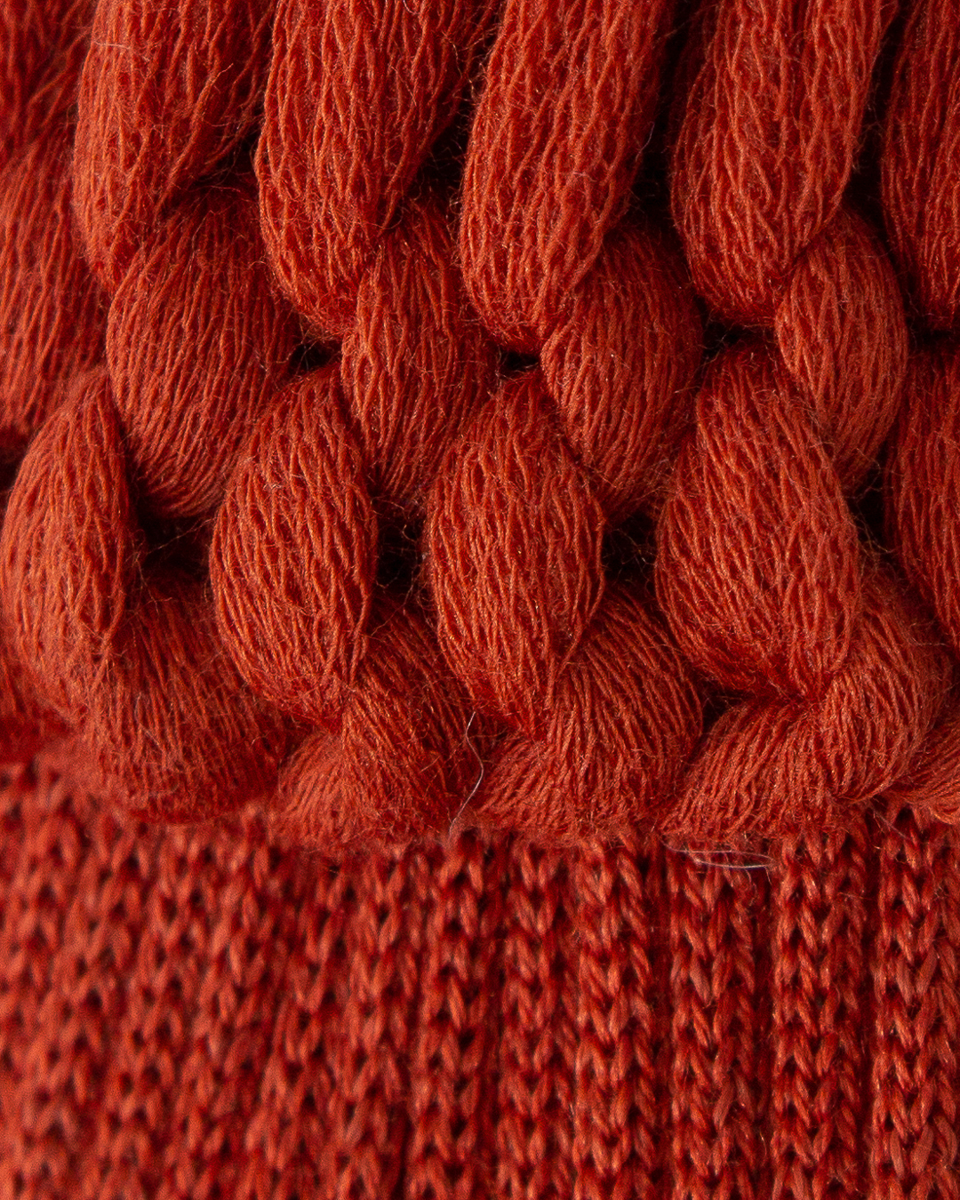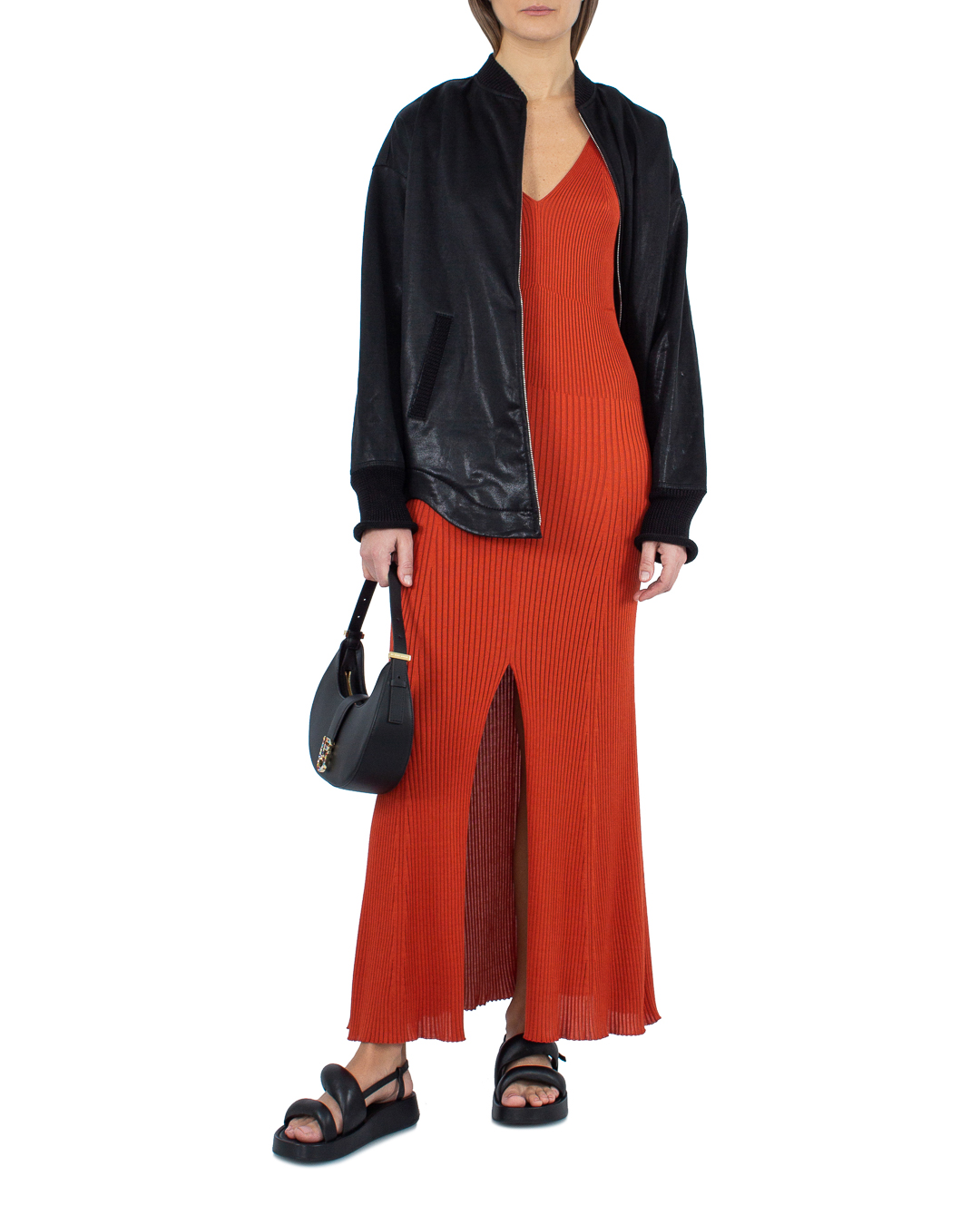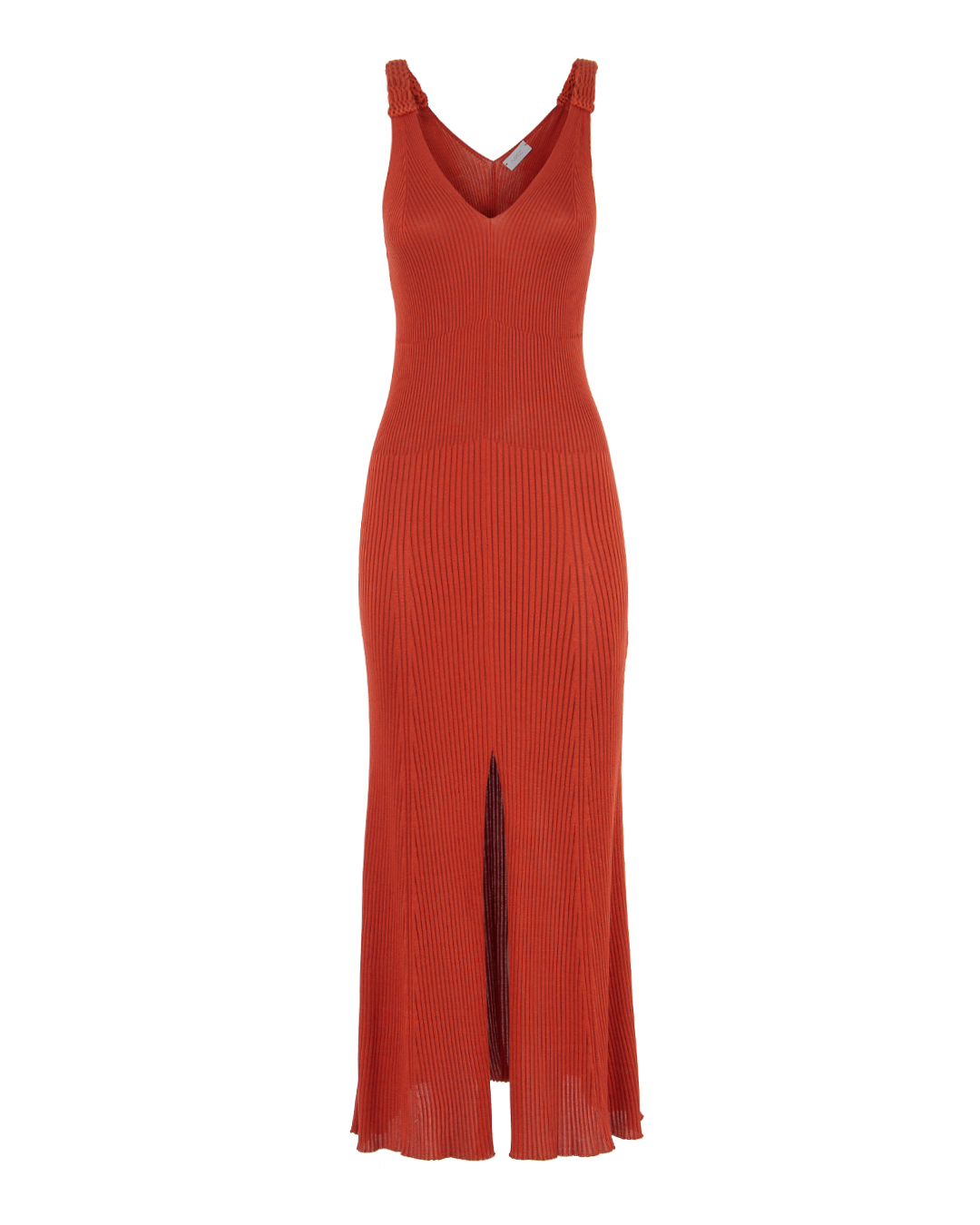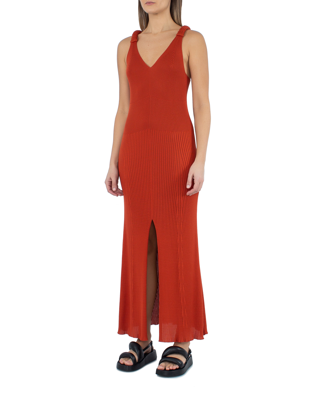 Платье-макси из трикотажной вискозы в рубчик с добавлением хлопка и шелка терракотового оттенка. Эластичное изделие прилегающего силуэта с разрезом с лицевой стороны.
