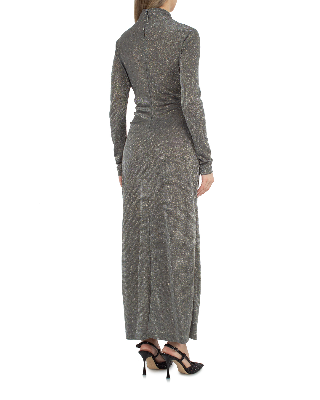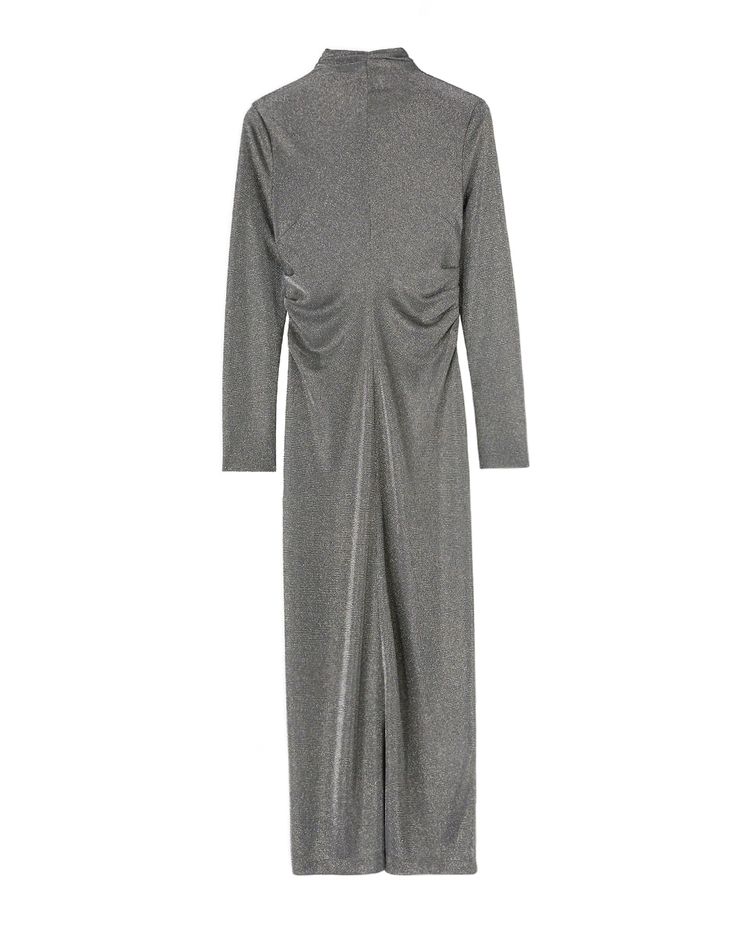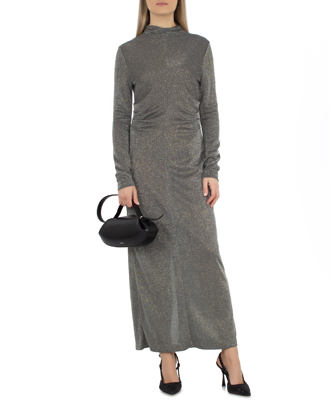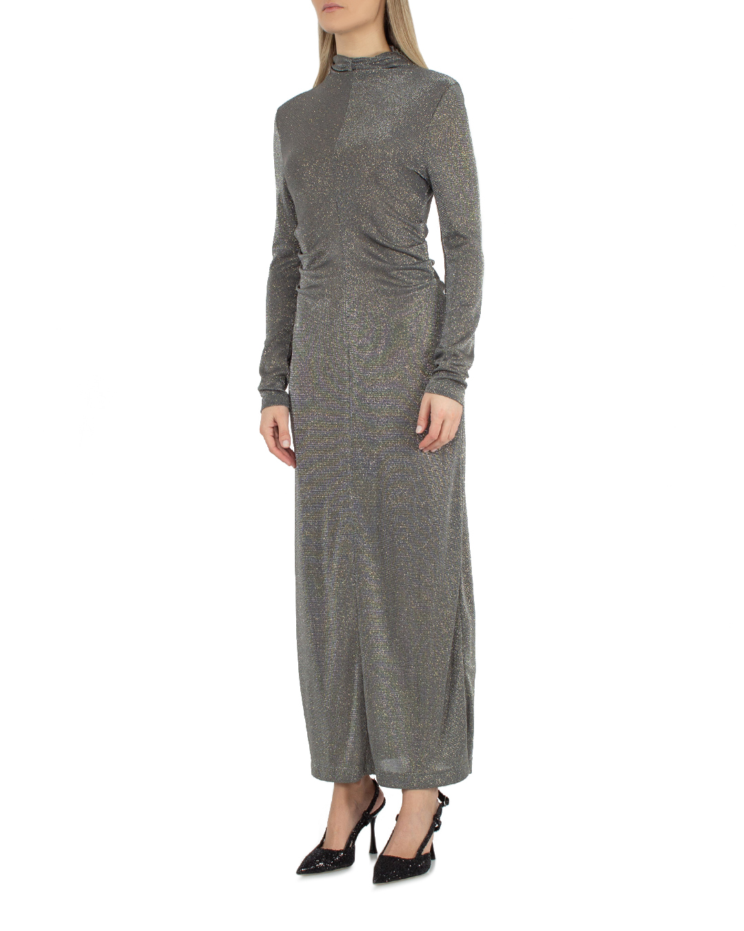 Платье MSGM сшито из эластичного материала с блеском в серебре. Модель прилегающего силуэта длиной в пол дополнено легкой сборкой материала и застежкой на спине на потайную молнию.