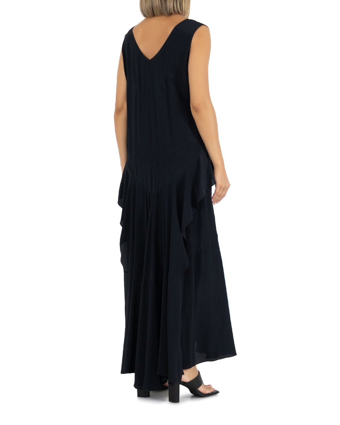 Платье № 21 сшито из ацетата с добавлением шелка. Модель длины макси с отделкой рюшами и оборками. Спинка украшена легким шлейфом.