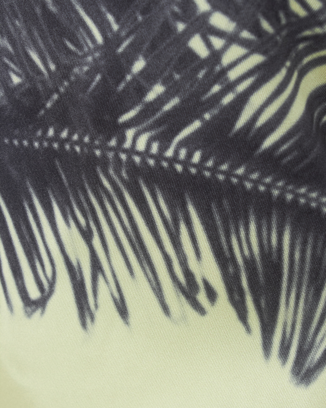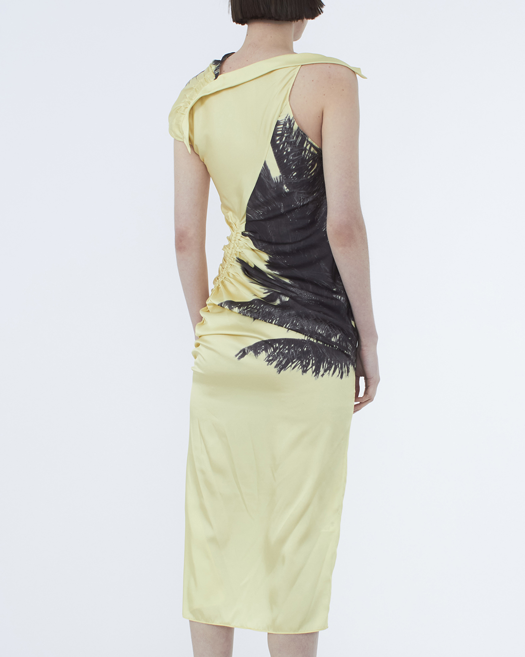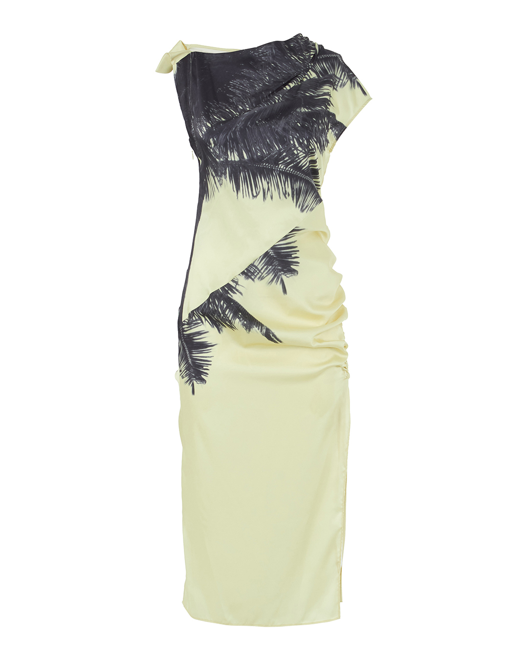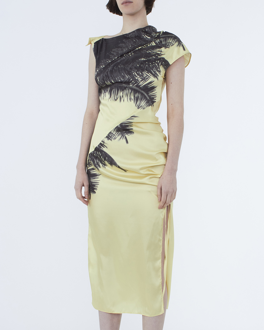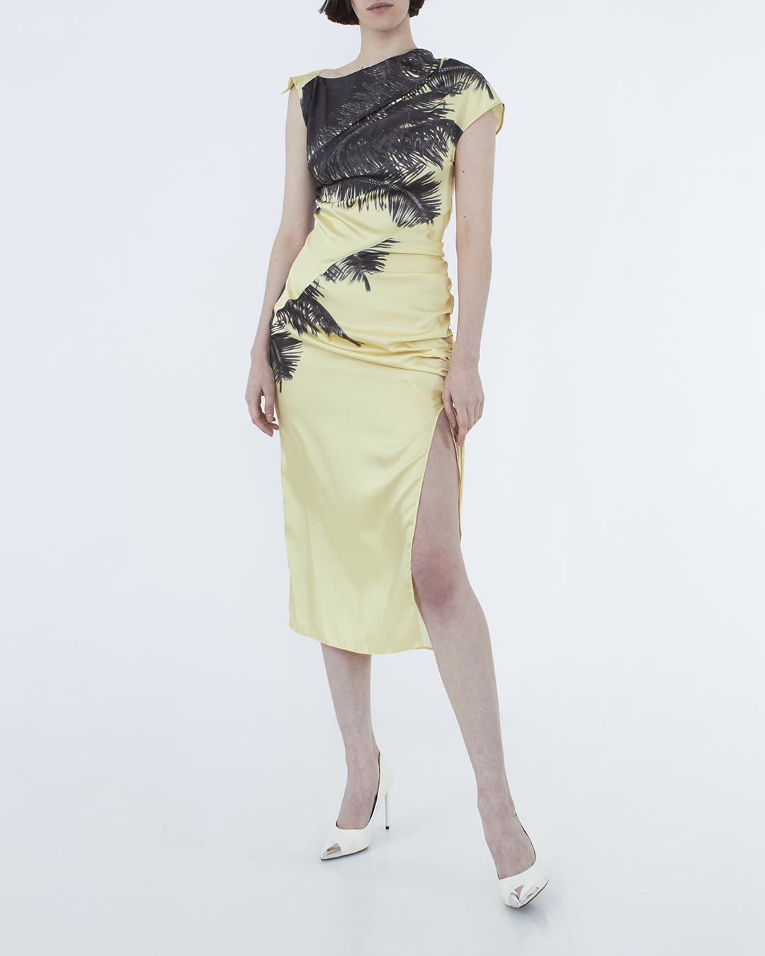 Платье № 21 выполнено из атласного материала желтого оттенка с растительным принтом. Модель длины миди прилегающего силуэта с высоким разрезом. Платье с цельнокроеными рукавами и сборкой материала.